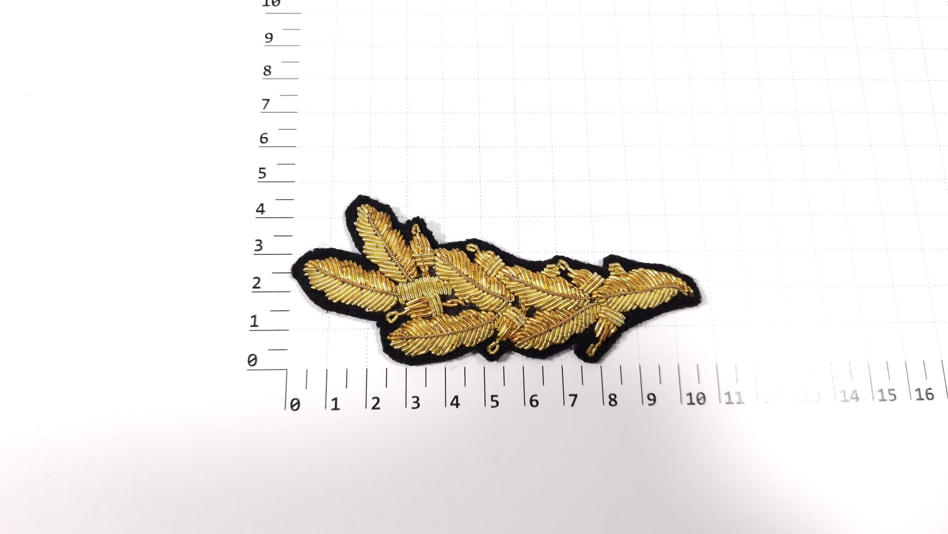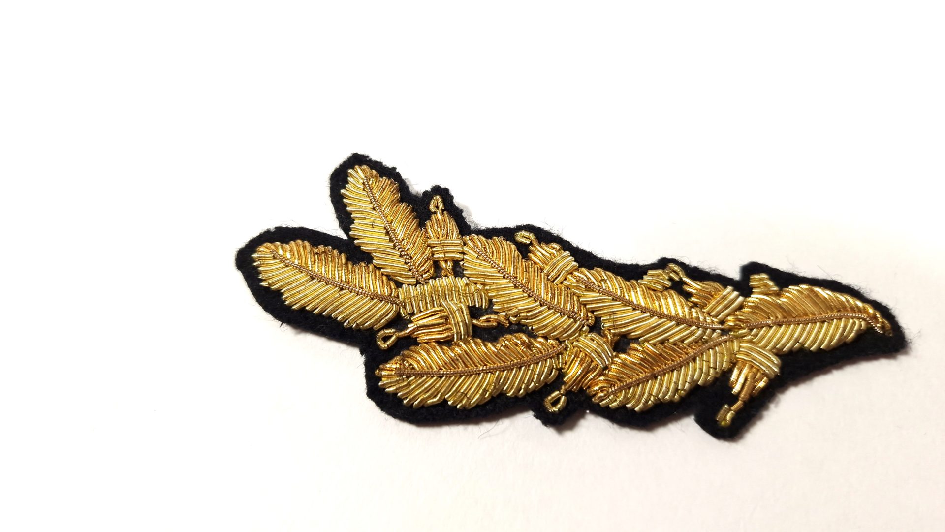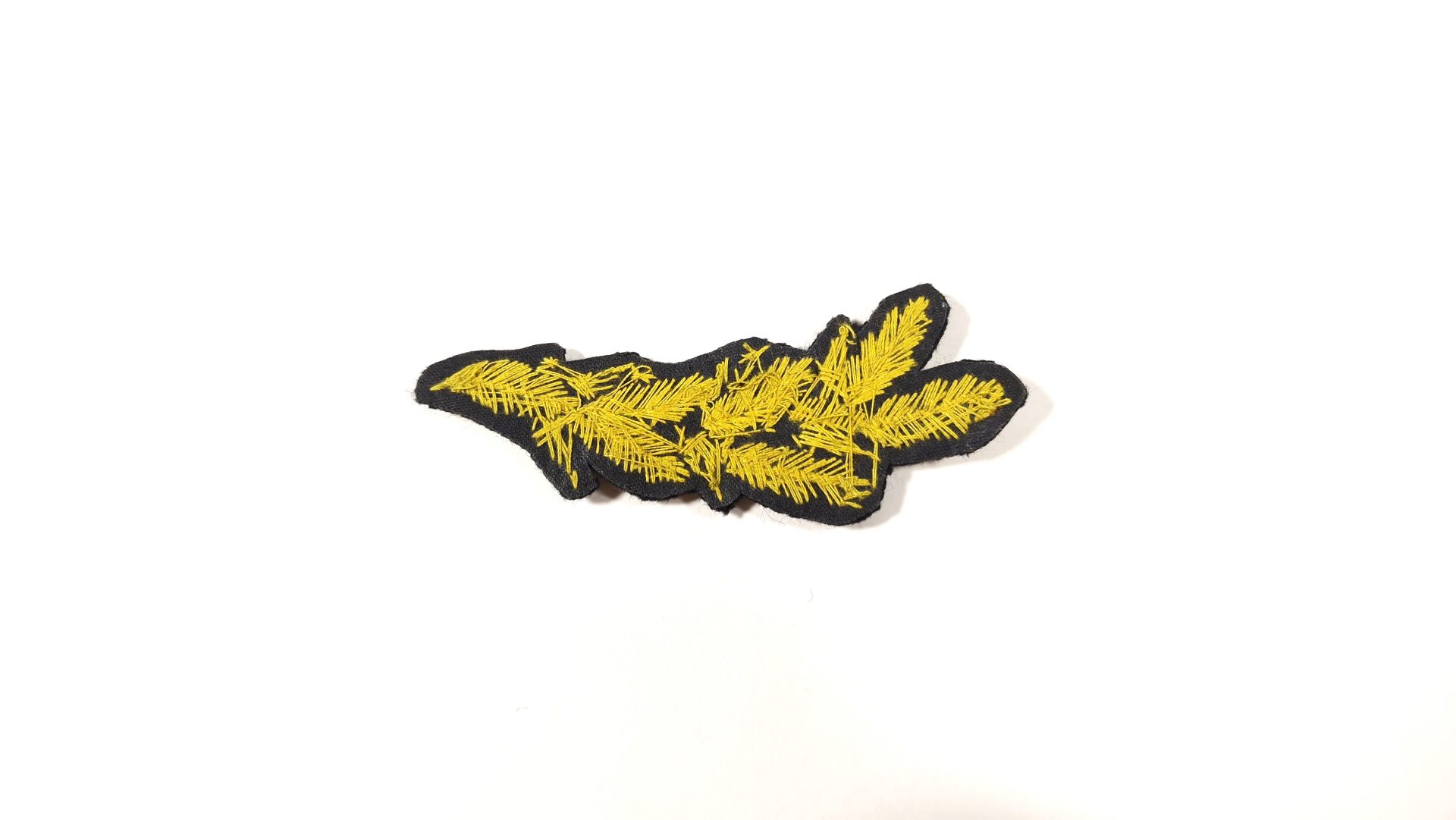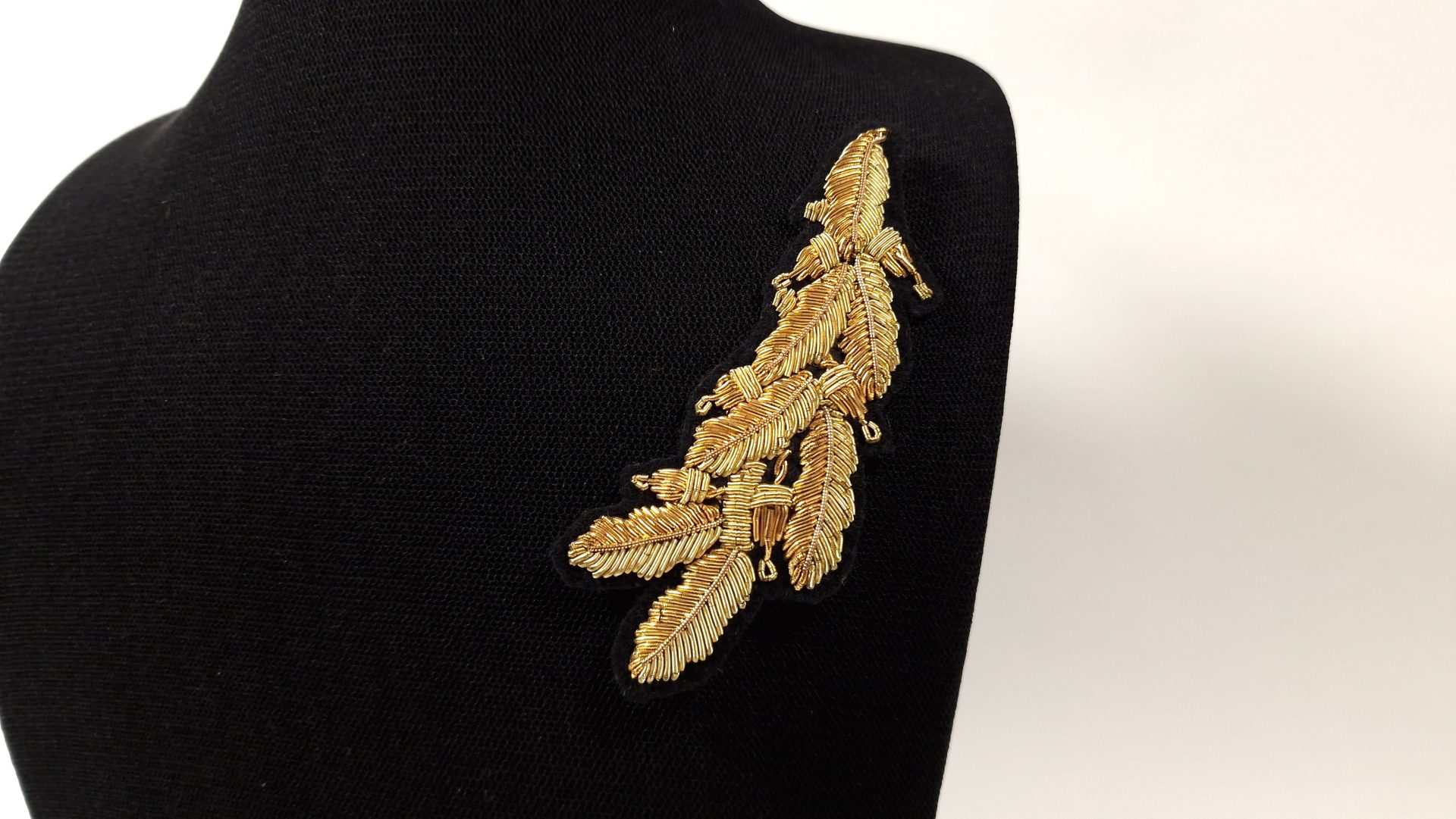 Aplicatie decorativa realizata manual Golden Leaf DG09 cu insertii de fir metalizat auriu, care creeaza un luciu discret in miscare, model de inspiratie Dolce&Gabbana, lungime de 11 cm, latime de 5 cm.