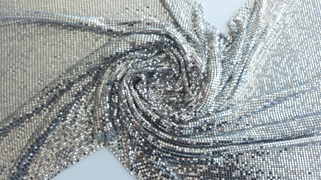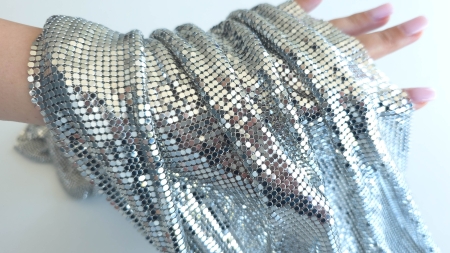 Plasă metalică cu finisaj premium VER1807- este un material spectaculos, realizat integral din plăcuțe metalice argintii, flexibile și fluide, care se mulează natural și subliniază orice siluetă. Materialul are elasticitate pe lățime (37 cm în repaus, extensibil până la 47 cm) și este disponibil sub formă de panou de 2,1 m lungime.Inspirat din creațiile iconice Versace, acest material exclusivist este alegerea perfectă pentru rochii de seară glamour, topuri moderne, bustiere îndrăznețe sau piese statement cu impact vizual puternic. Textura strălucitoare și căderea elegantă îl transformă într-un material deosebit, ideal pentru designeri și pasionați de modă care caută o estetică sofisticată și modernă. Vă invităm să ne urmăriți și pe rețelele de socializare pentru a rămâne informați cu privire la ultimele noastre actualizări, oferte exclusive și surse de inspirație. Alăturați-vă comunității noastre online pe Facebook și Instagram. Vă așteptăm cu drag!