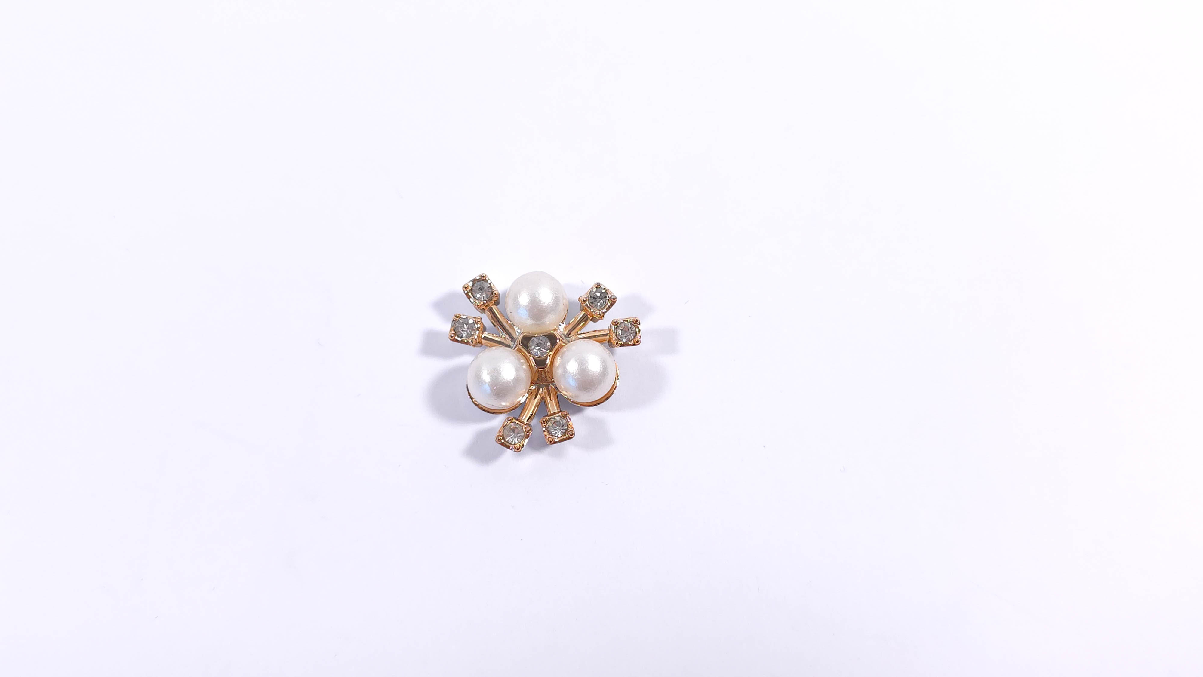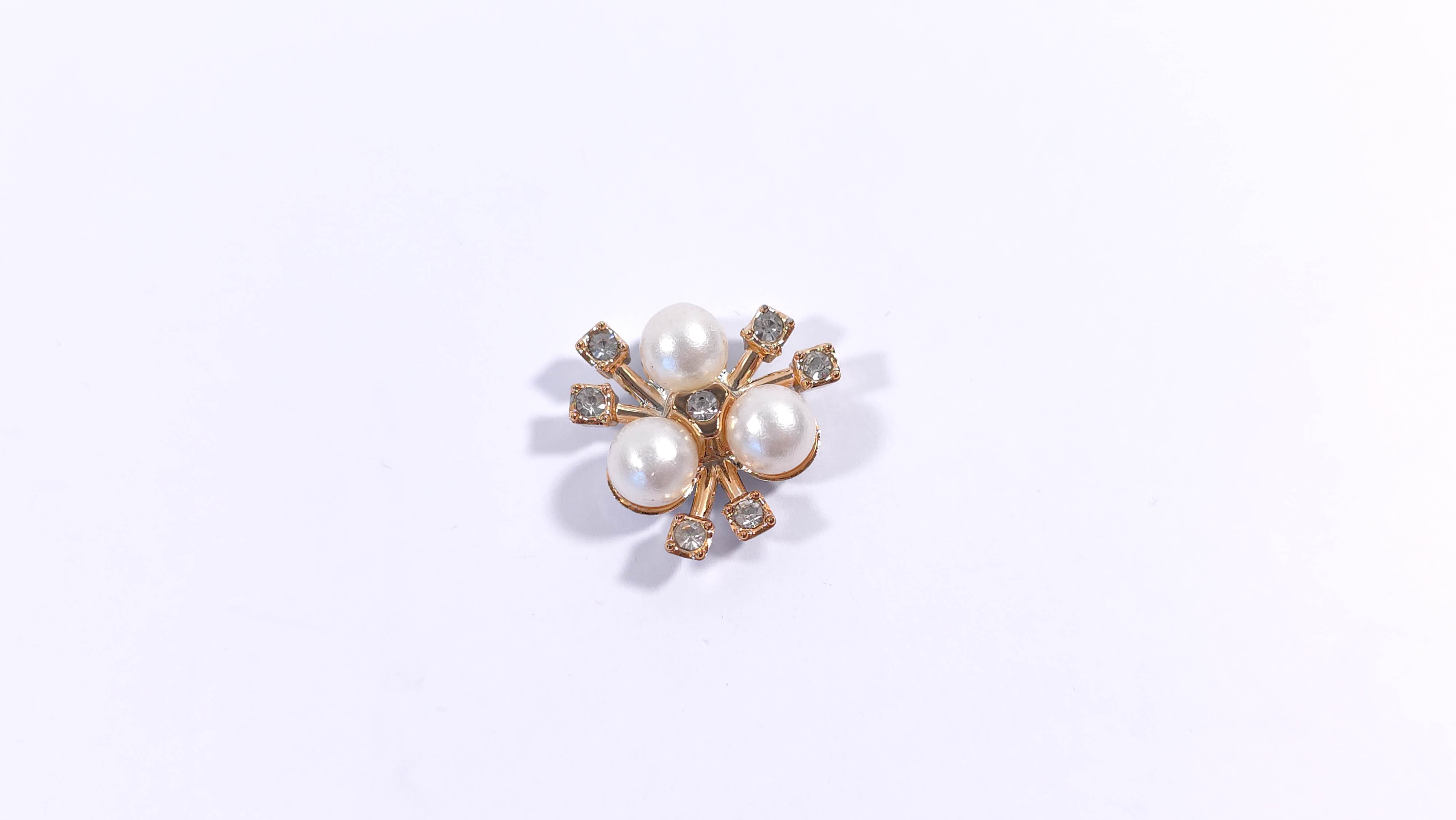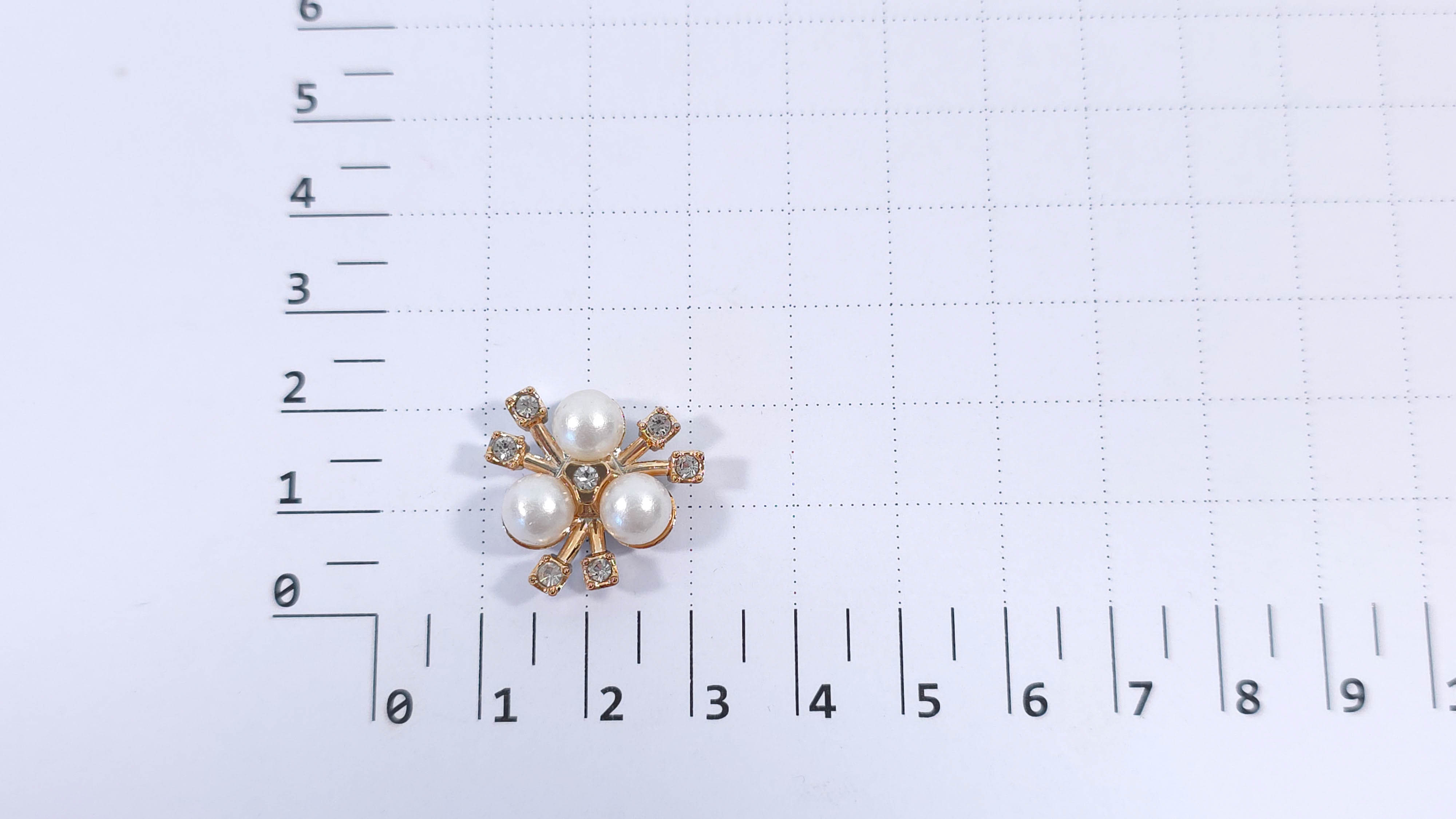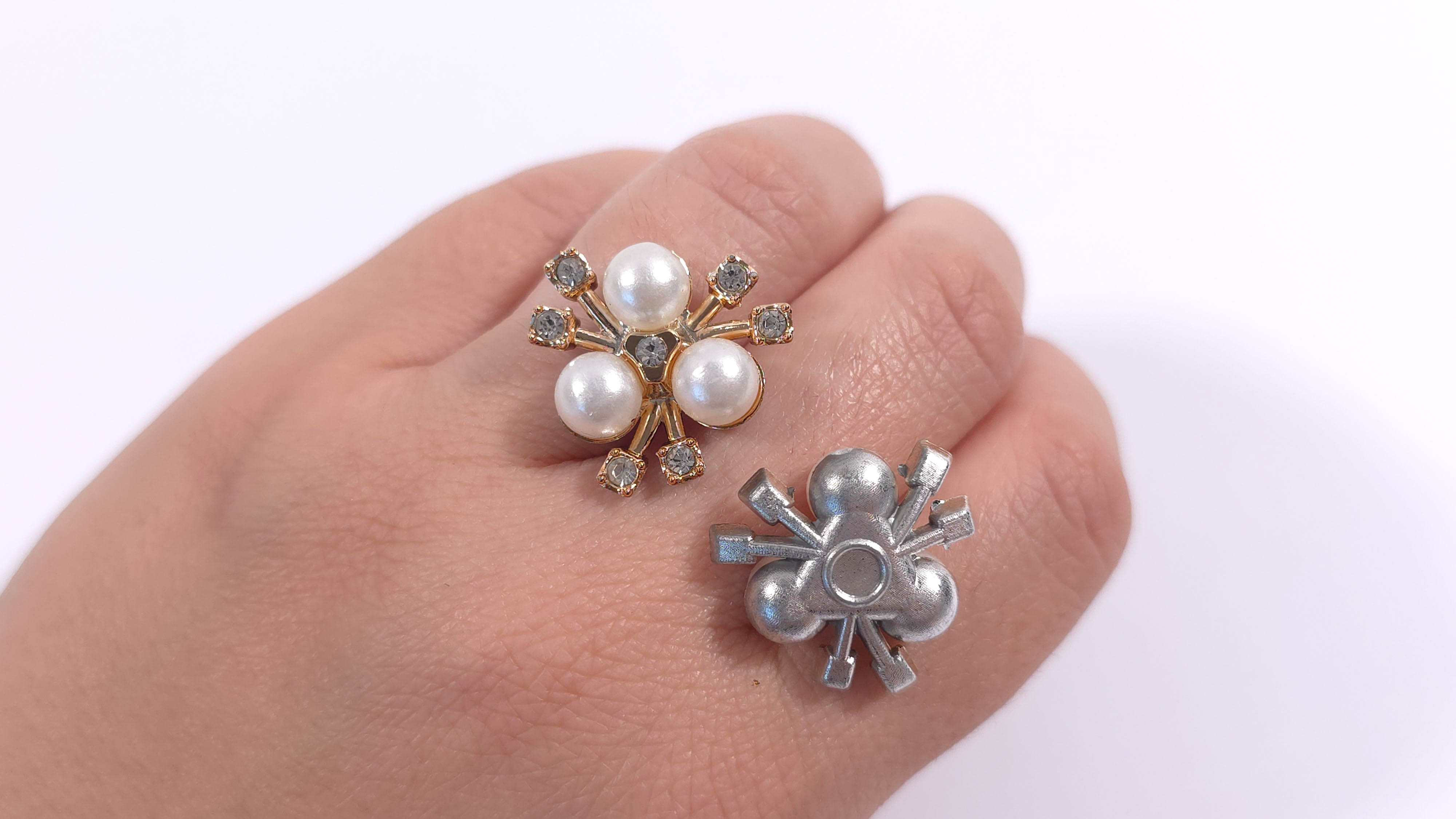 Accesoriu decorativ cu design radial, realizat pe structură metalică argintie, accesorizat cu perle sferice ivory și cristale transparente fațetate. Produsul se comercializează sub formă de set, format din 5 bucăți, concepute pentru utilizare decorativă pe articole vestimentare sau textile.