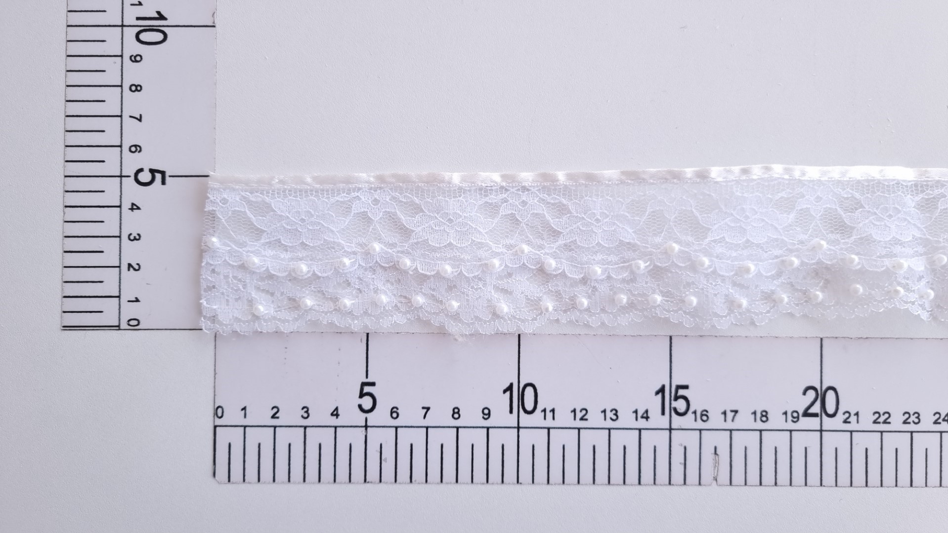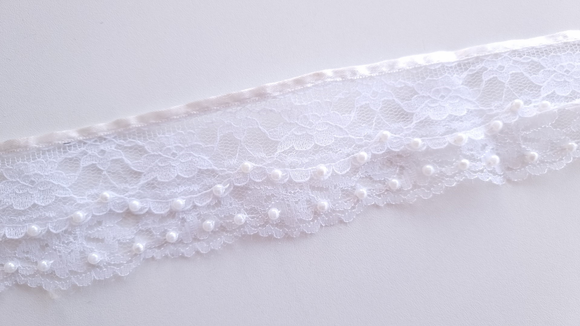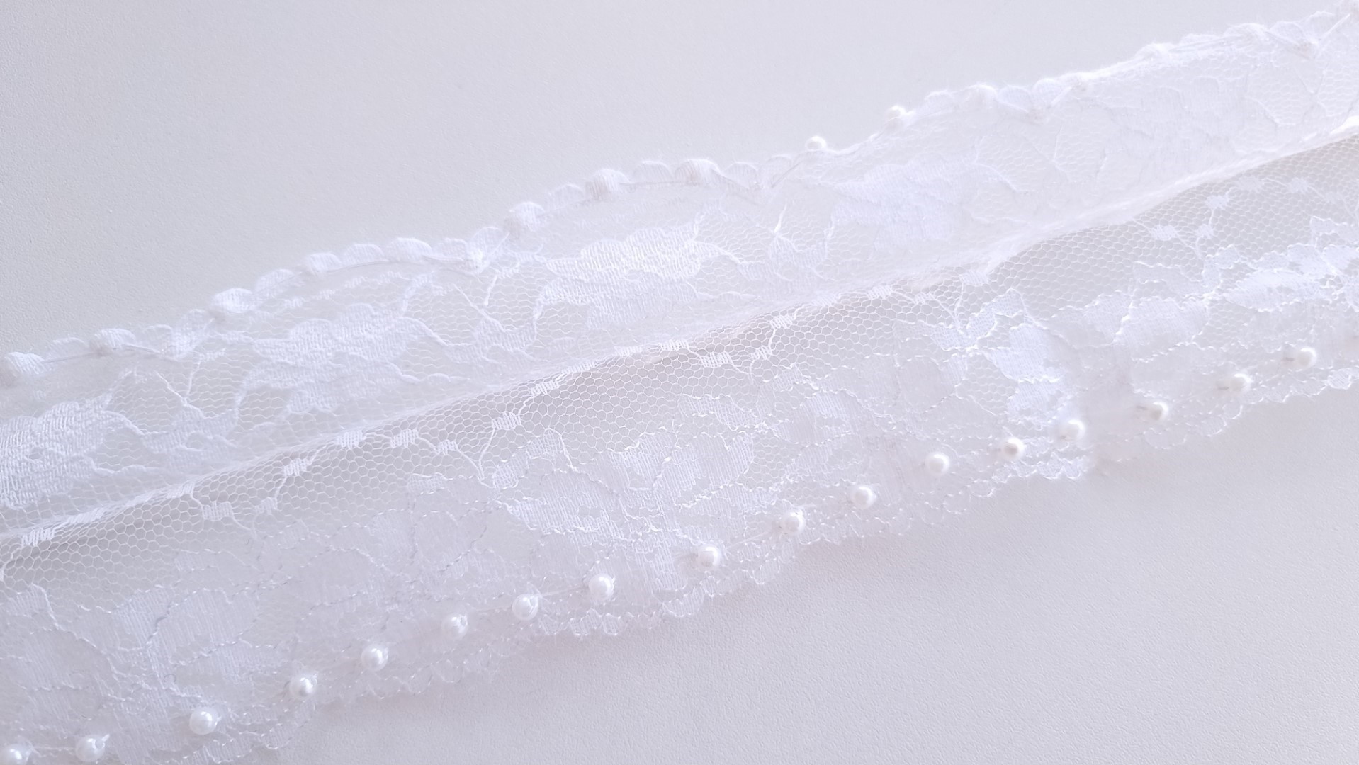 Banda decorativa din dantela accesorizata ivory, subtire si delicata, latime de 5 cm, cu banda subtire satinata ivory, pe una din laturi si cu margele rotunde ivory distribuite pe toata lungimea tulle-ului, pe cealalalta latura, dispuse pe doua randuri paralele, tulle care este in acelasi ton cu broderia. Aplicatiile sunt realizate manual.