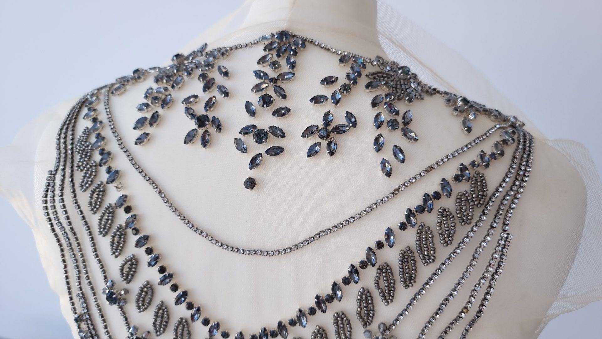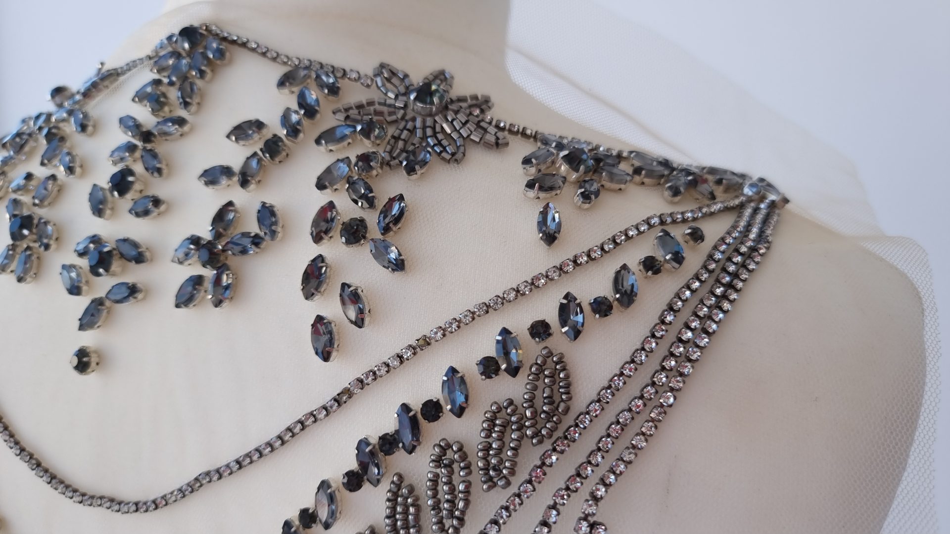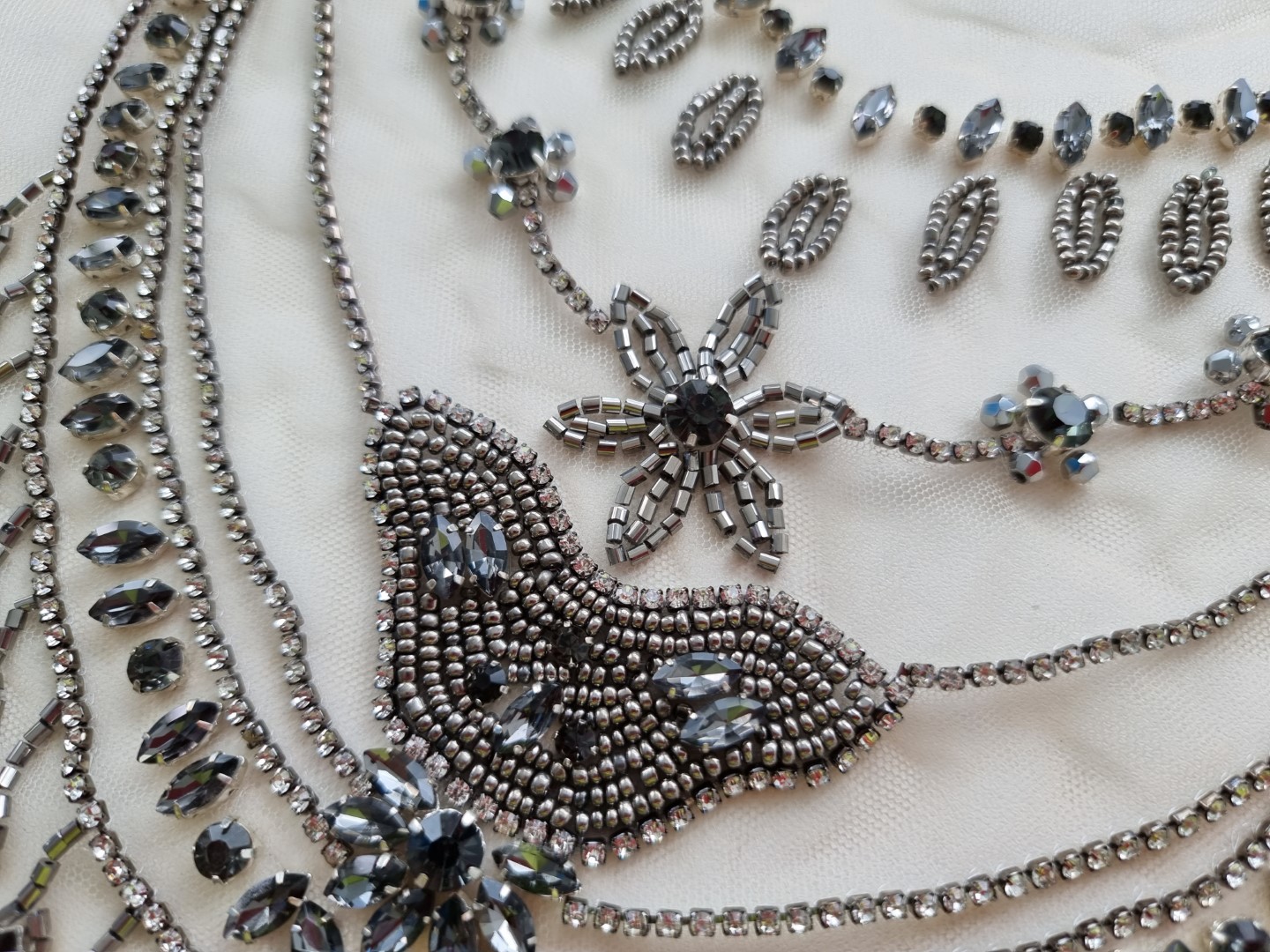 Broderie accesorizata manual – aplicatie decorativa Audrey, cu margelute gri-petrol si pietre argintii cusute pe tulle nude, usor elastic, latime de aprox. 35 cm.