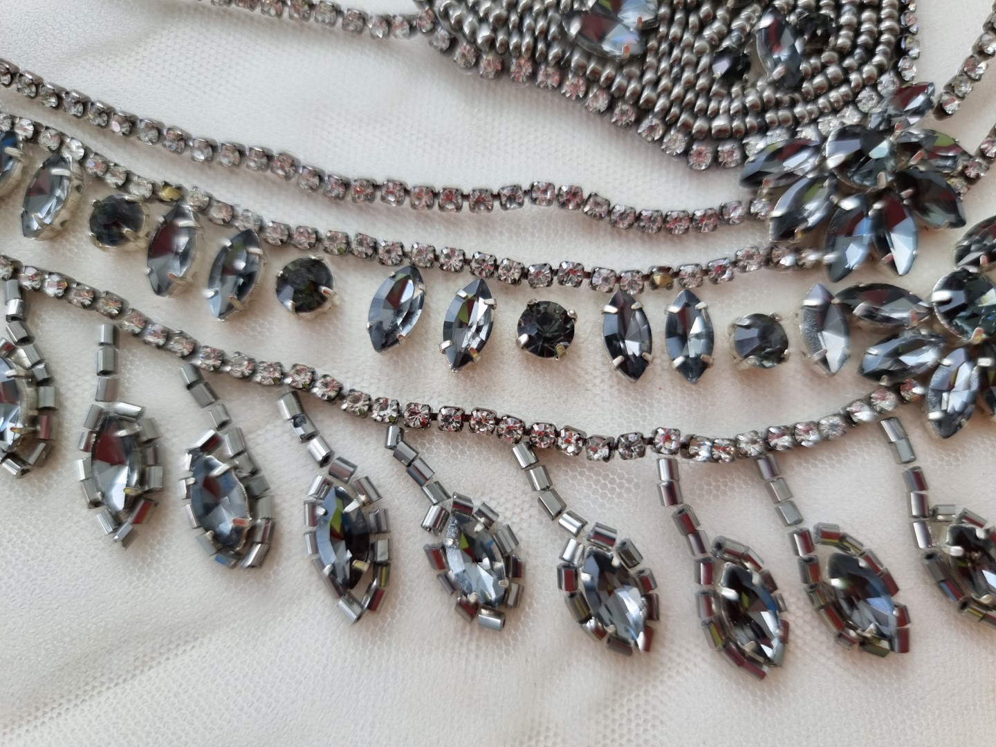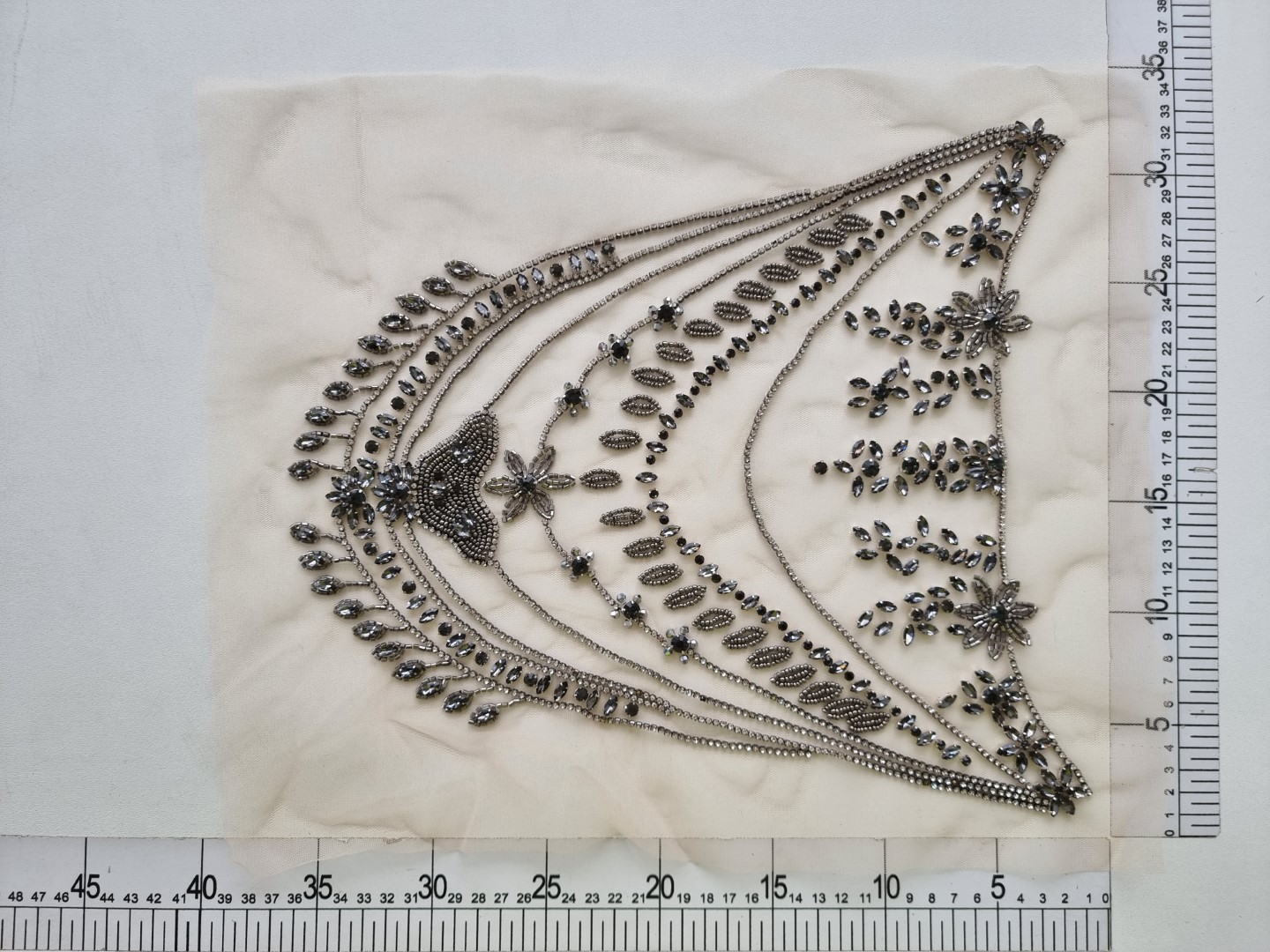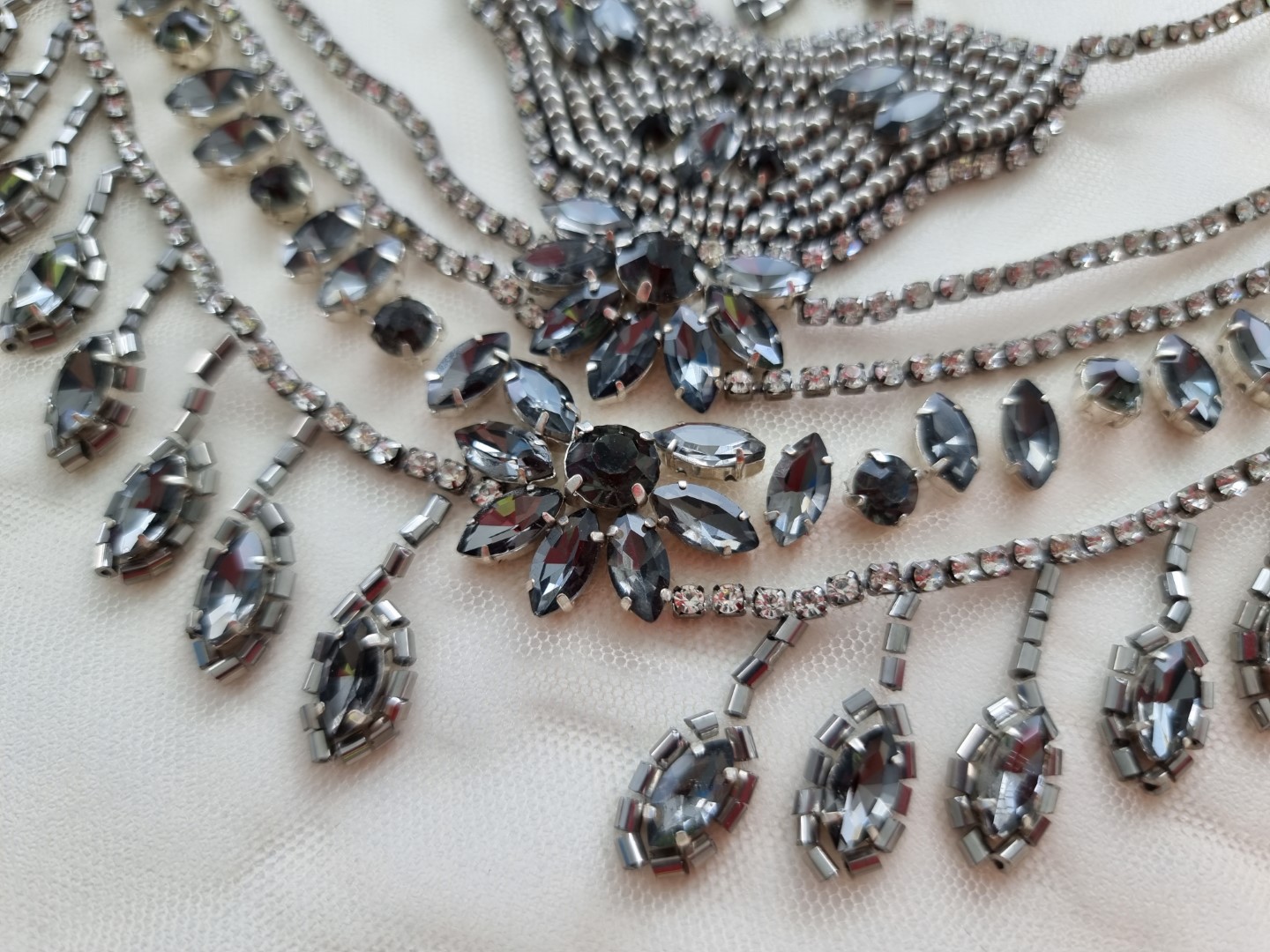 Broderie accesorizata manual – aplicatie decorativa Audrey, cu margelute gri-petrol si pietre argintii cusute pe tulle nude, usor elastic, latime de aprox. 35 cm.