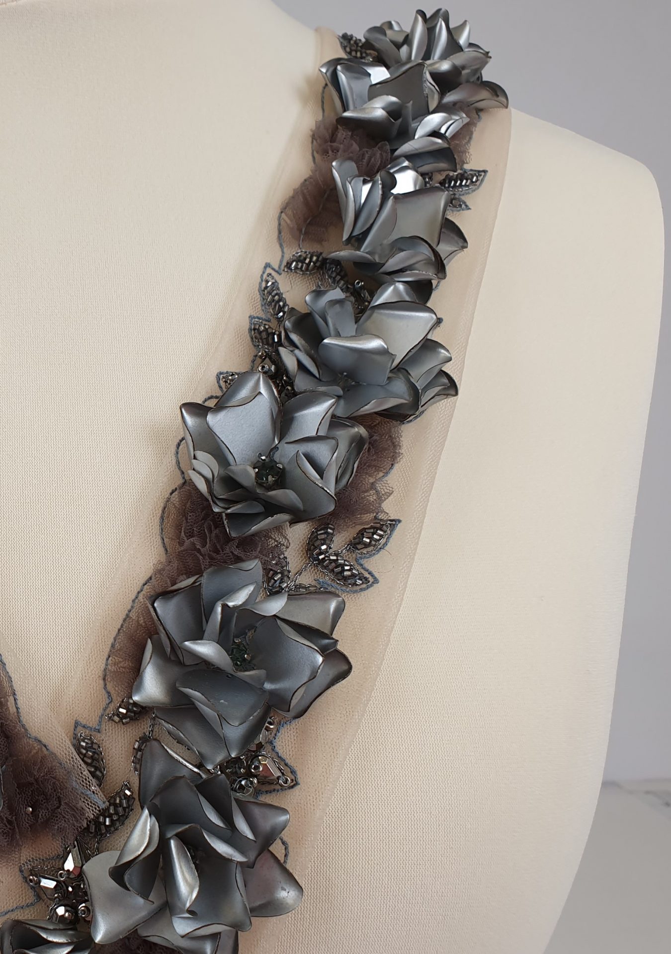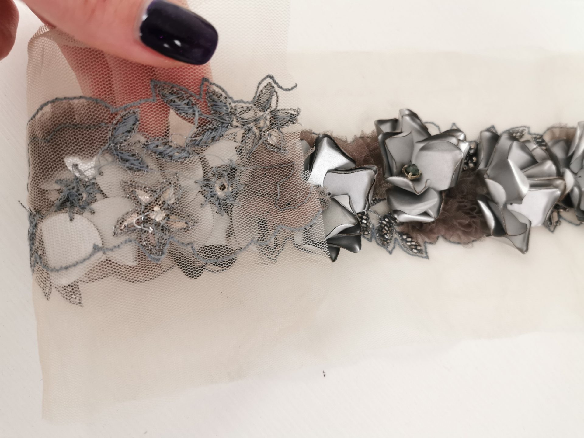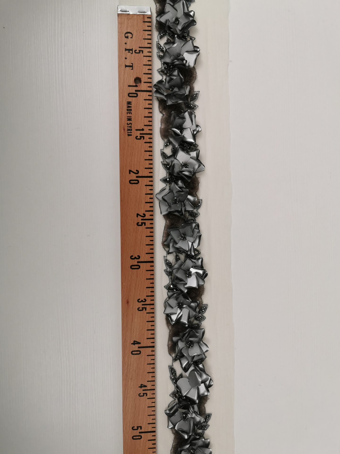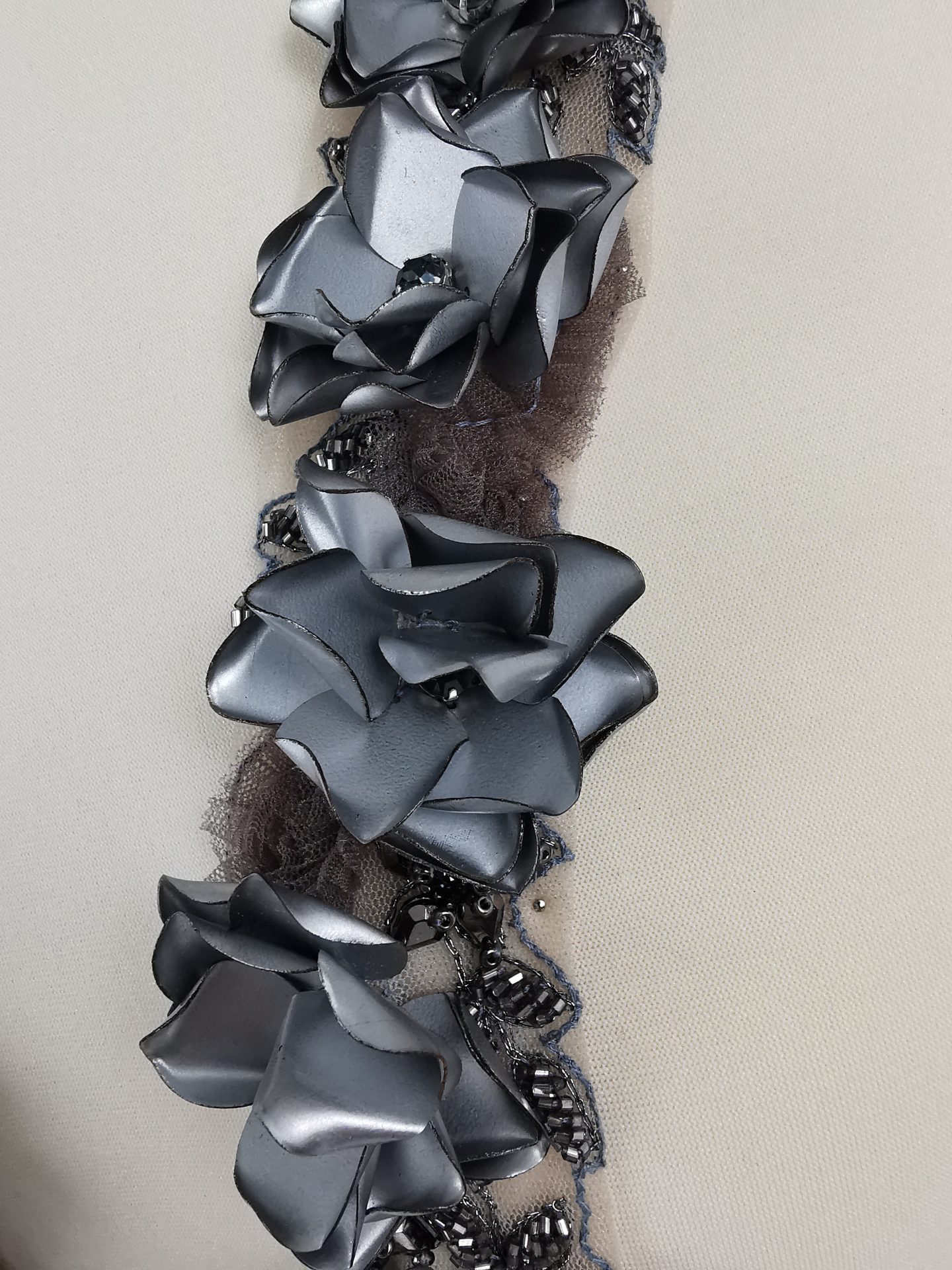 Silver mood banda decorativa lucrata manual din flori 3D gri argintiu, cristale si margele.