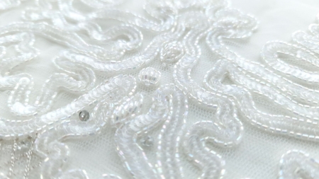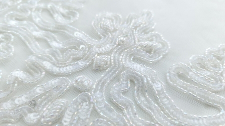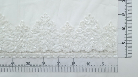 Dantela frantuzeasca ivory accesorizata – bordura latime 15 cm – cu margelute, pietre, micropaiete argintii, ivoire si transparente si fir metalizat argintiu, cusute pe tulle ivoire, usor elastic, calitate inalta, produsa in Franta.
