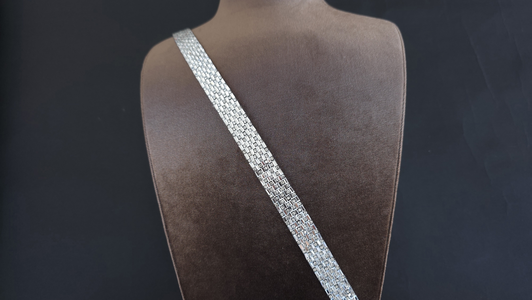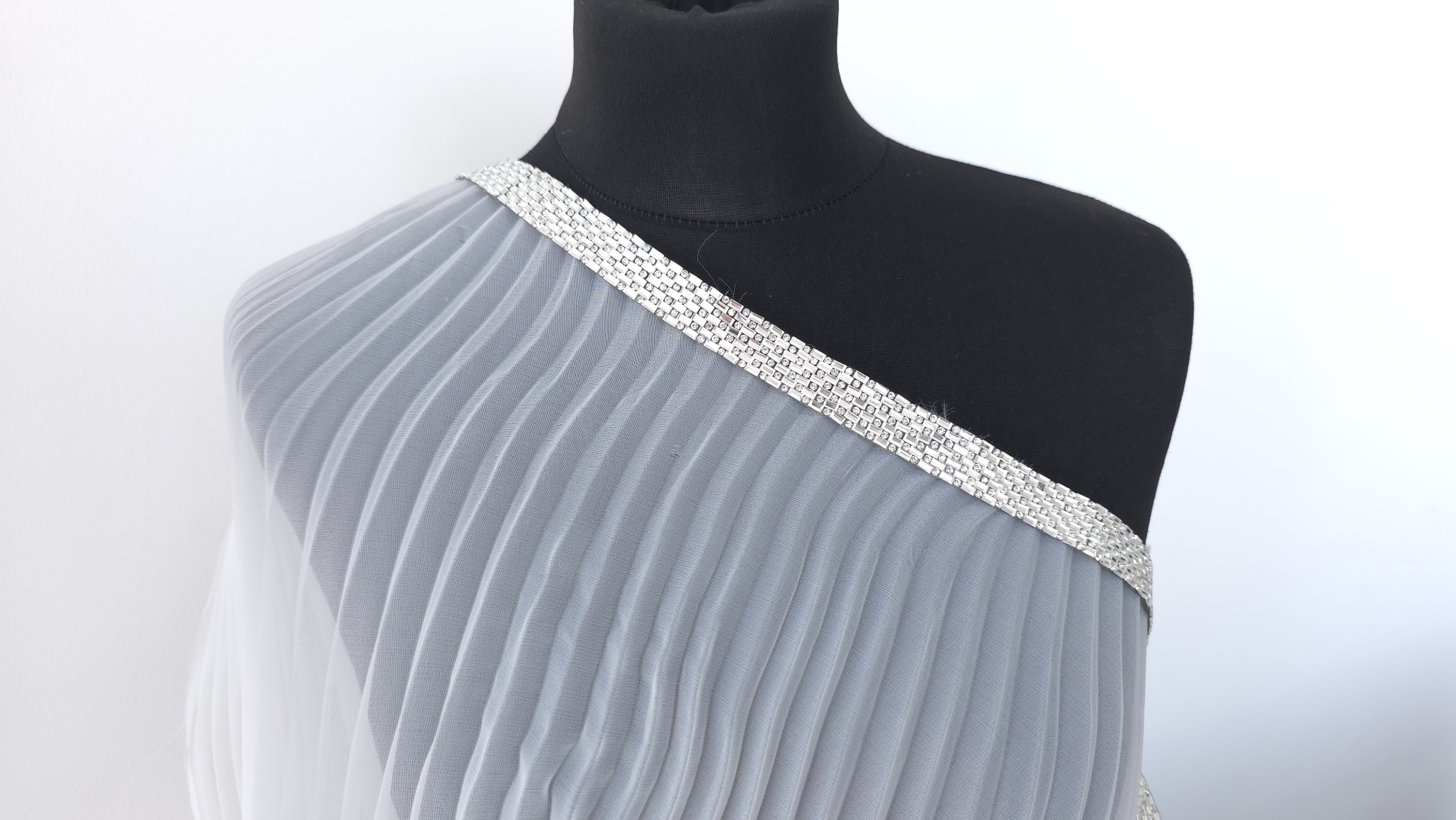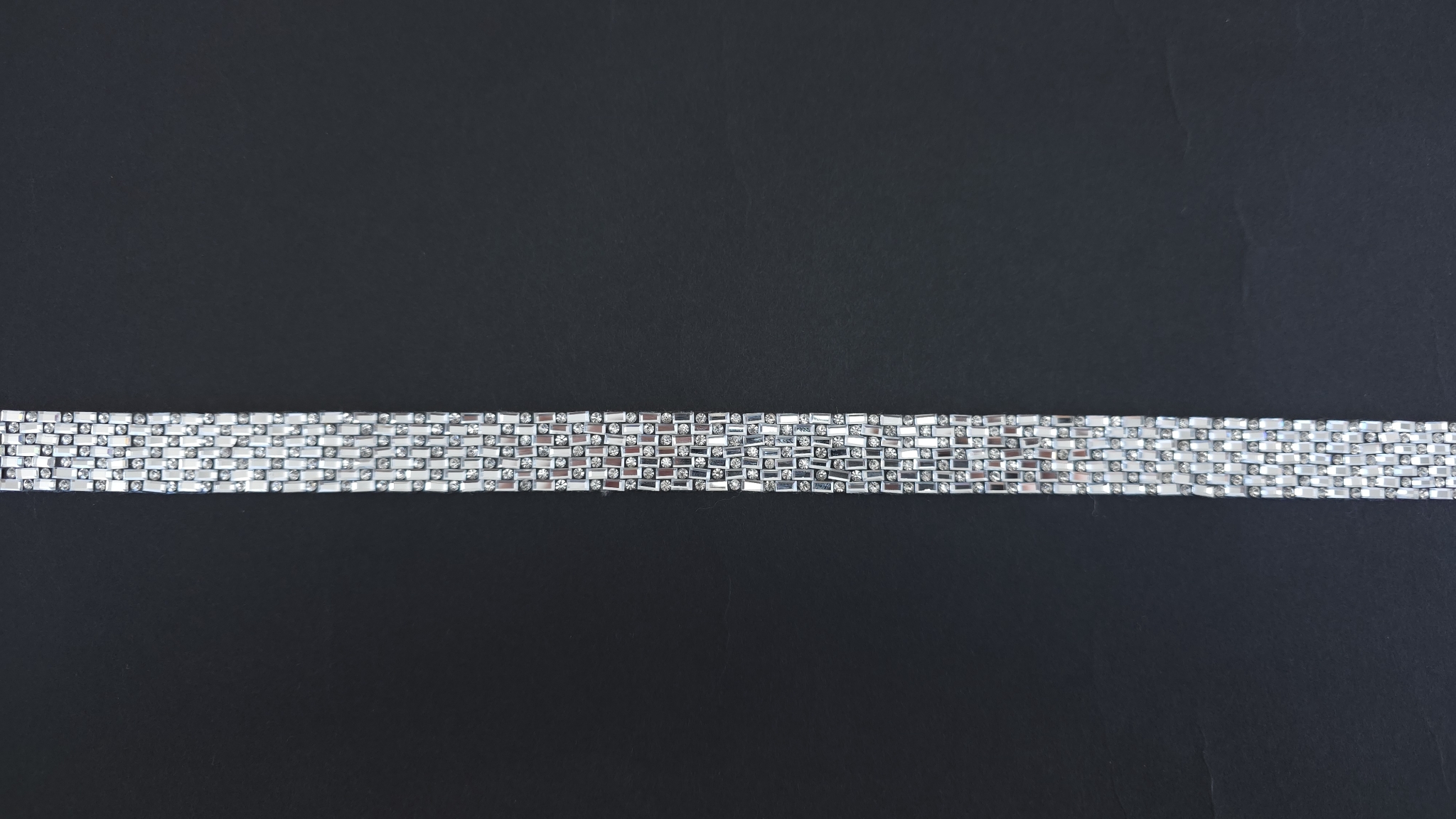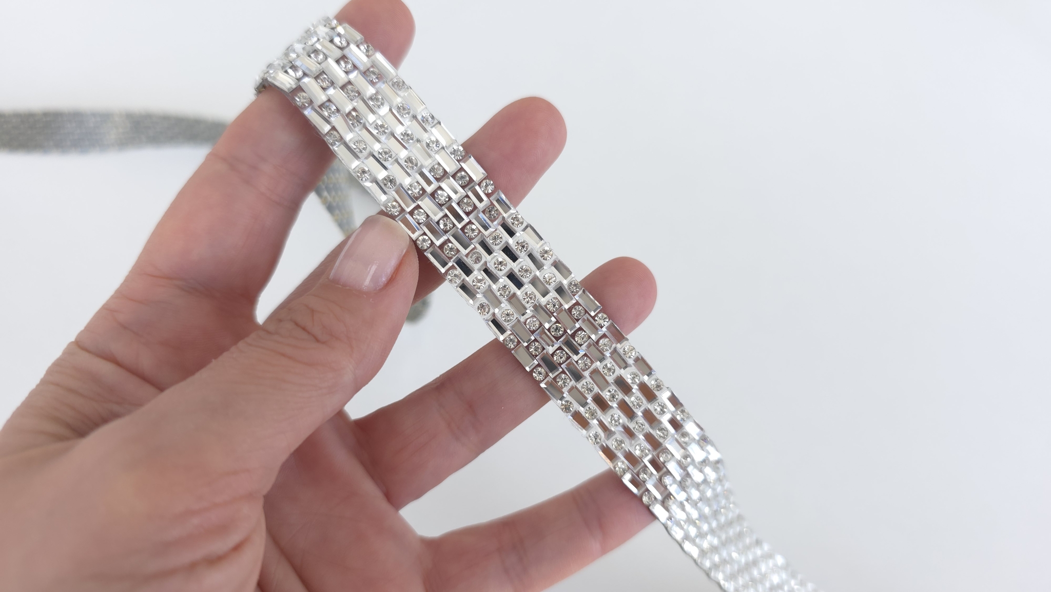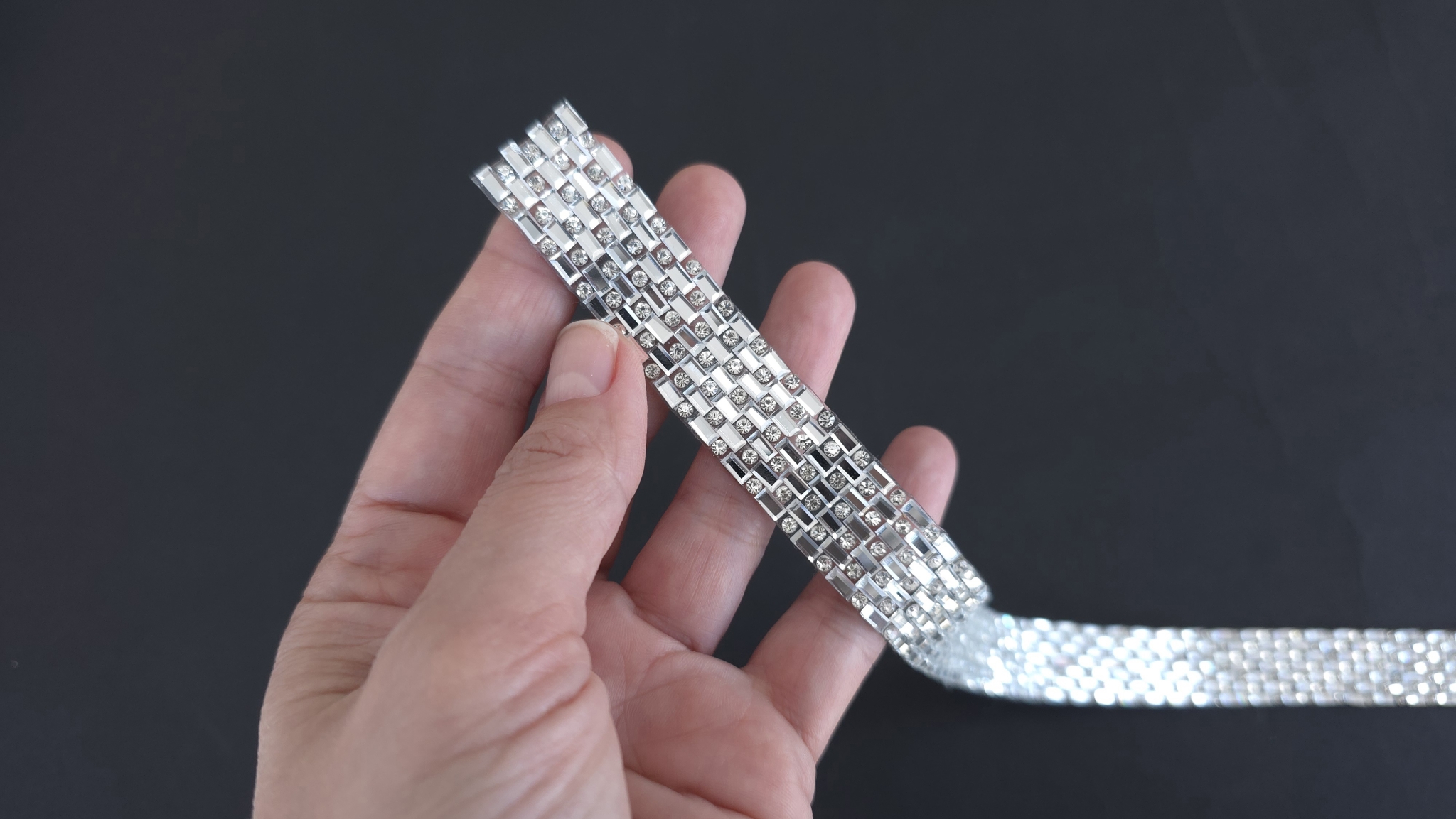 Principalul avantaj al acestui accesoriu este echilibrul perfect intre estetica si usurinta in utilizare. Orice panglica decorativa cu pietre de acest tip este formata din siruri paralele de cristale mici. Acestea sunt incasetate in monturi argintii dreptunghiulare, care reflecta excelent lumina, oferind un sclipit intens.