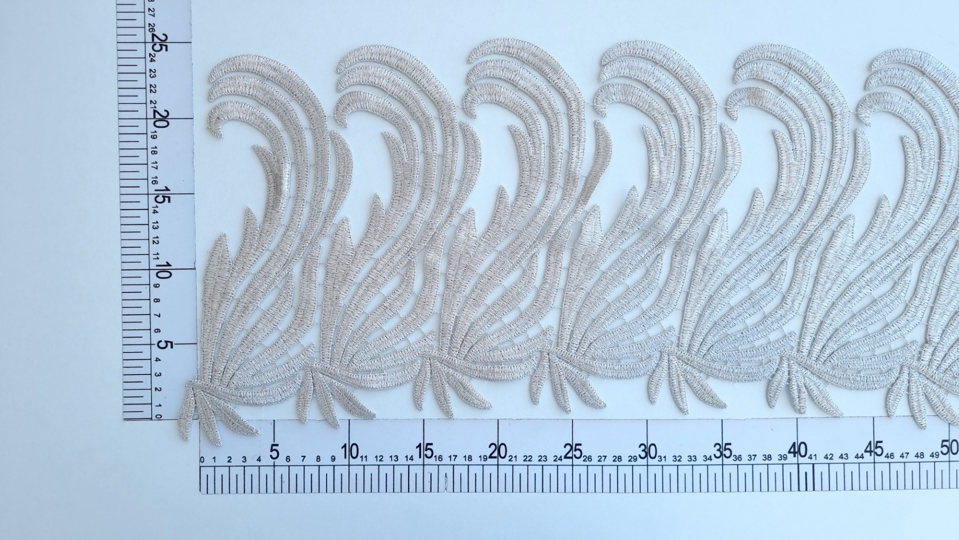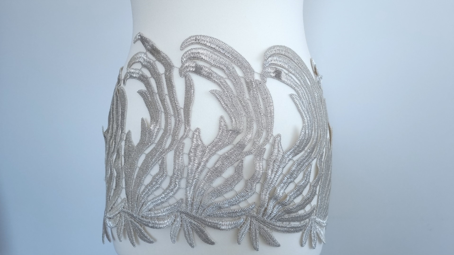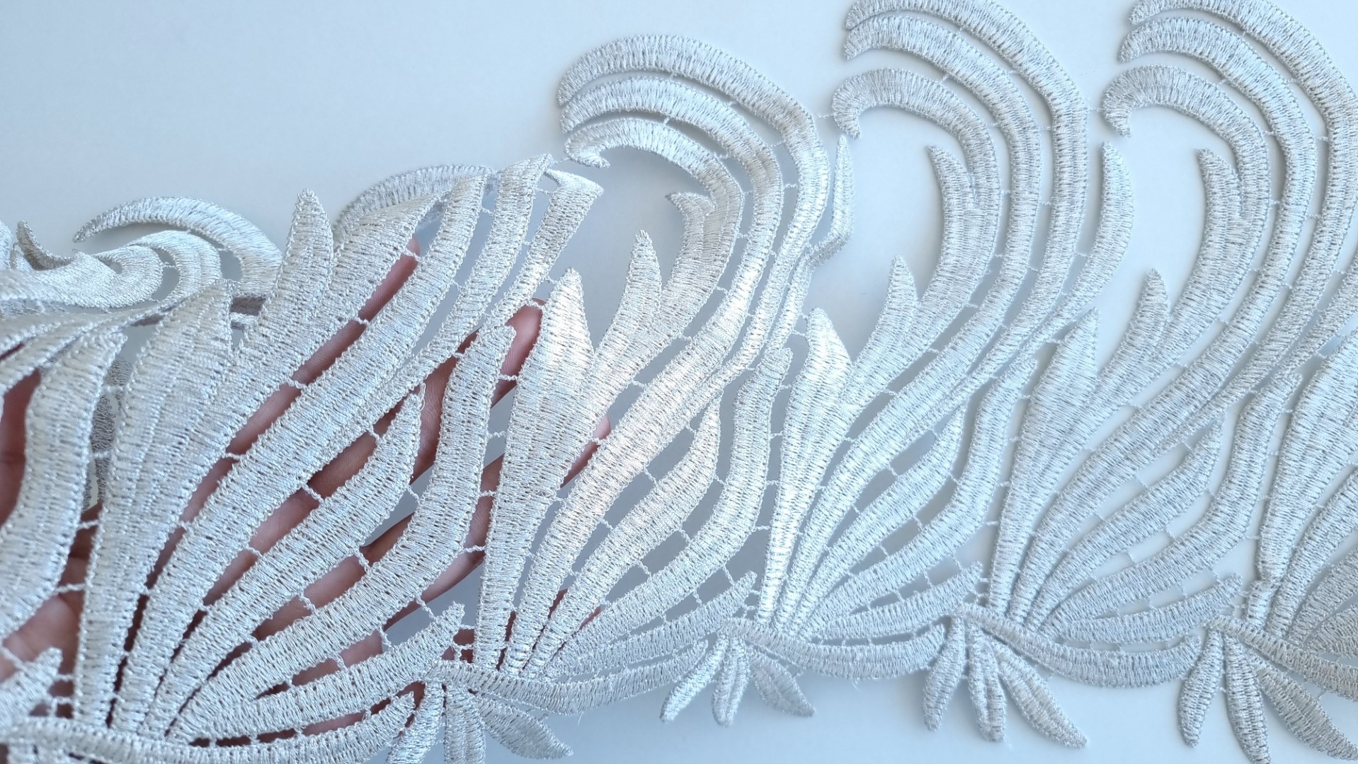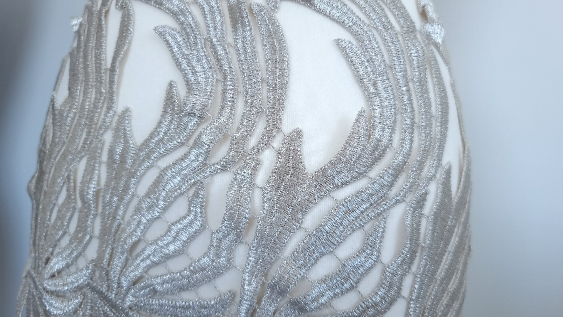 Bordura decorativa model frunze realizat din fir metalizat, cusut pe tulle ivoire.