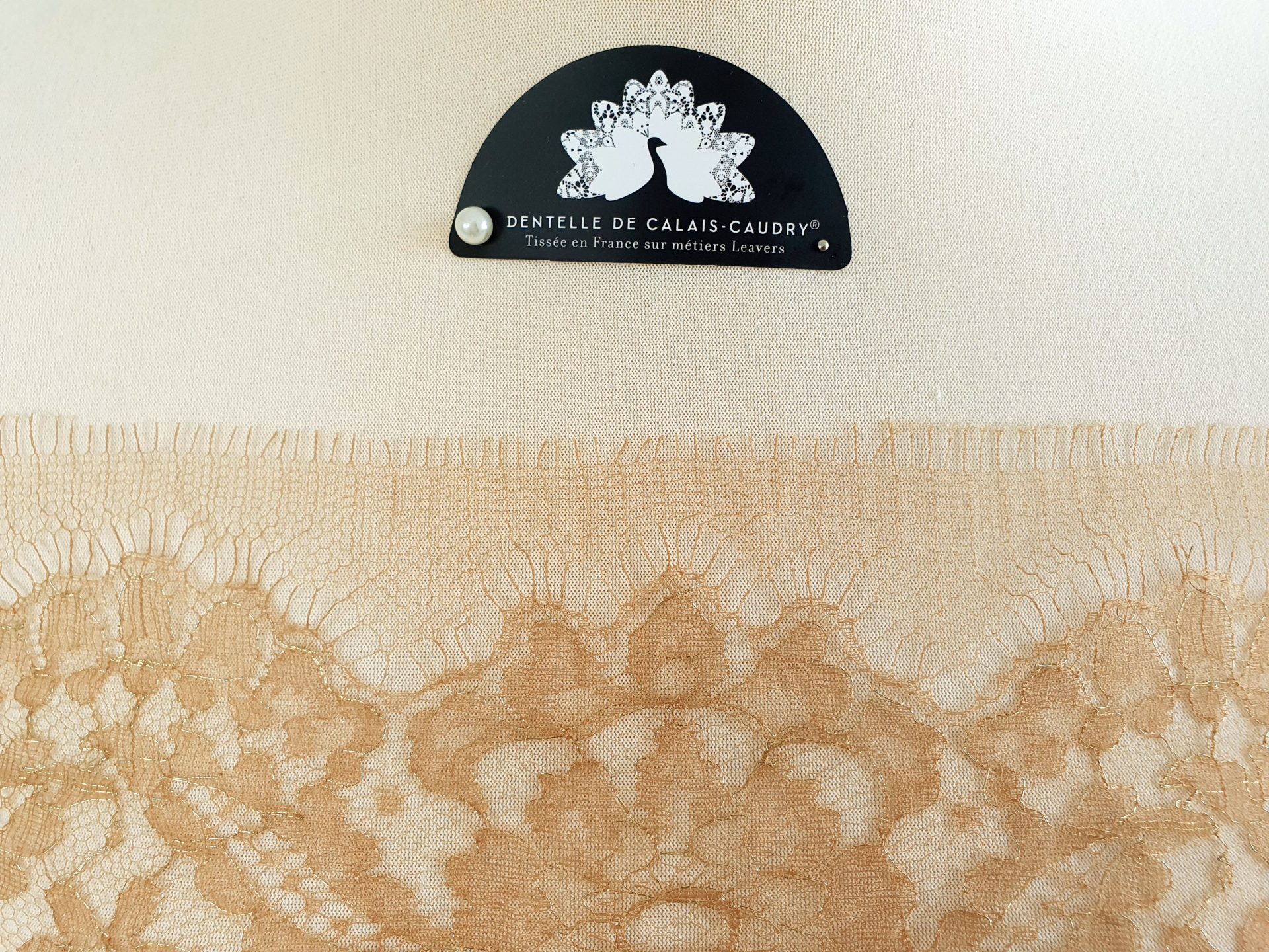 Bordura nude auriu Dantelle de Calais-Caudry, cu insertii de fir auriu metalizat pentru un plus de eleganta.
