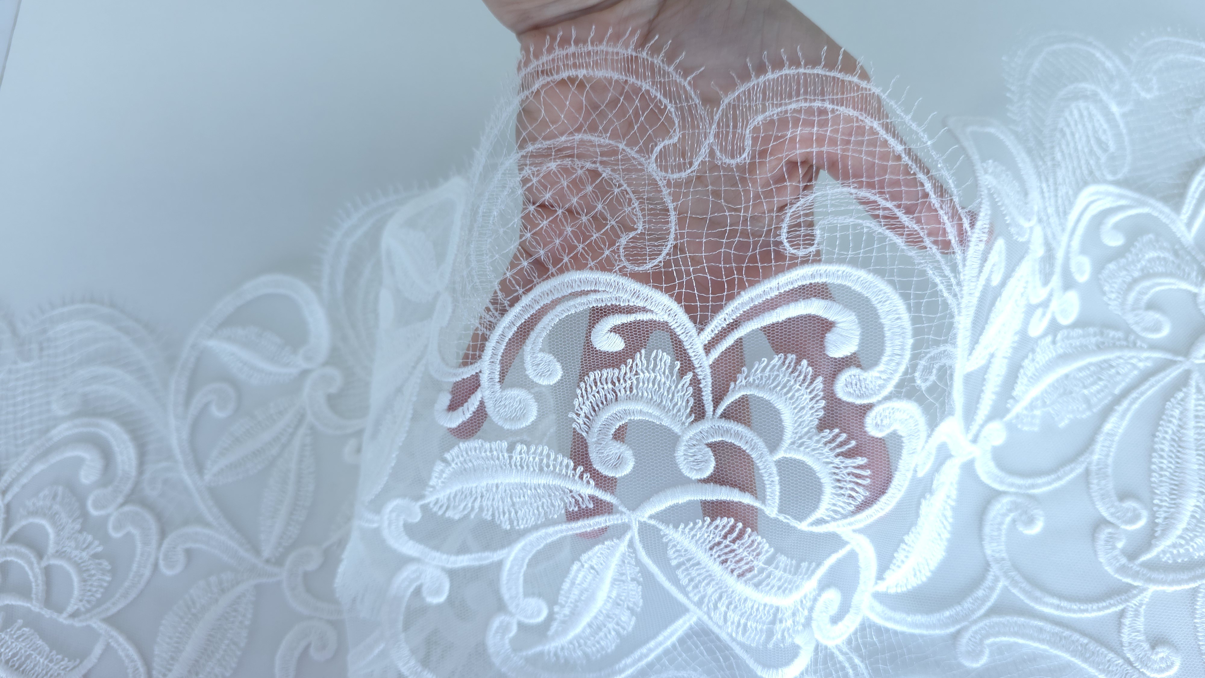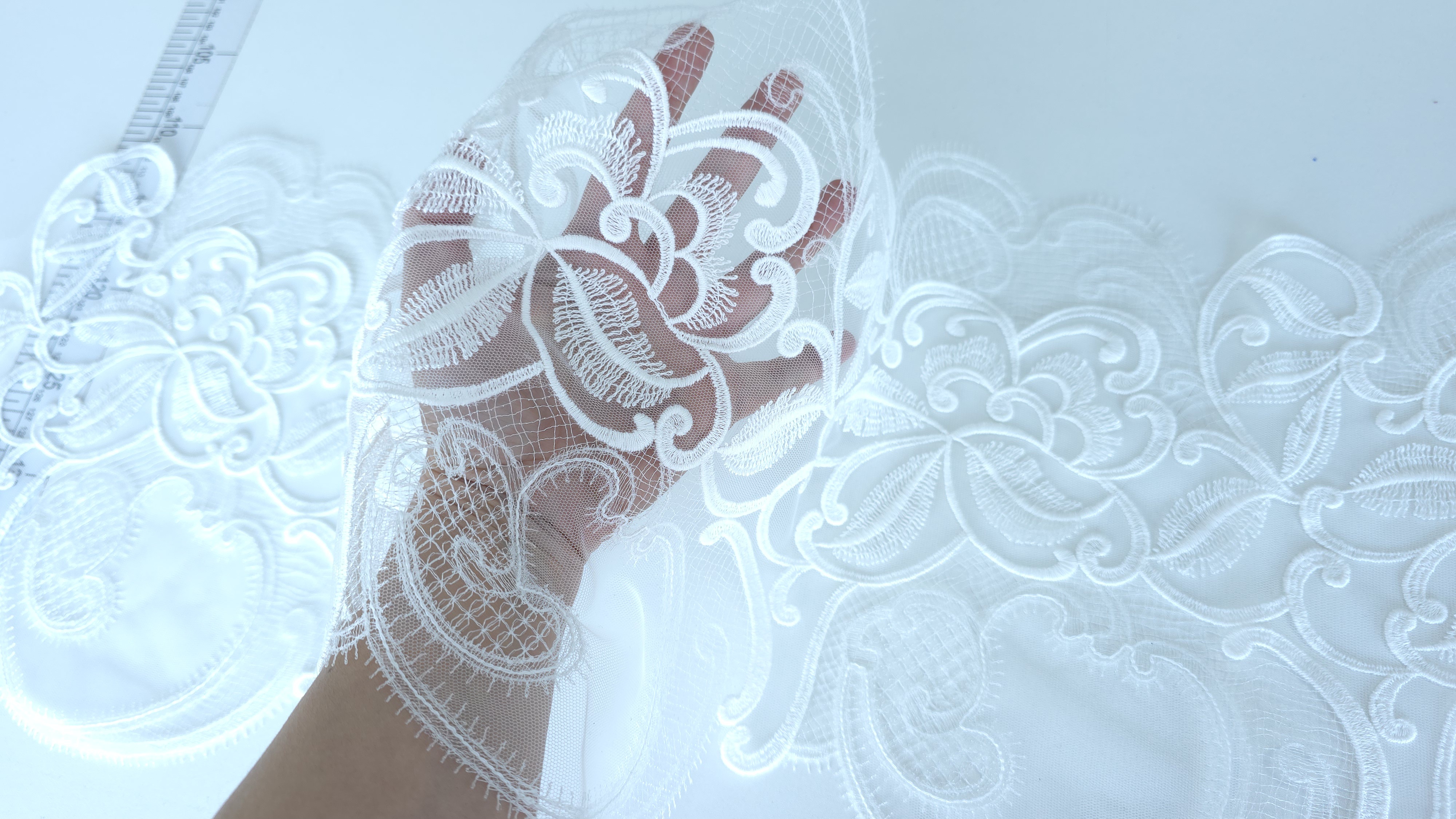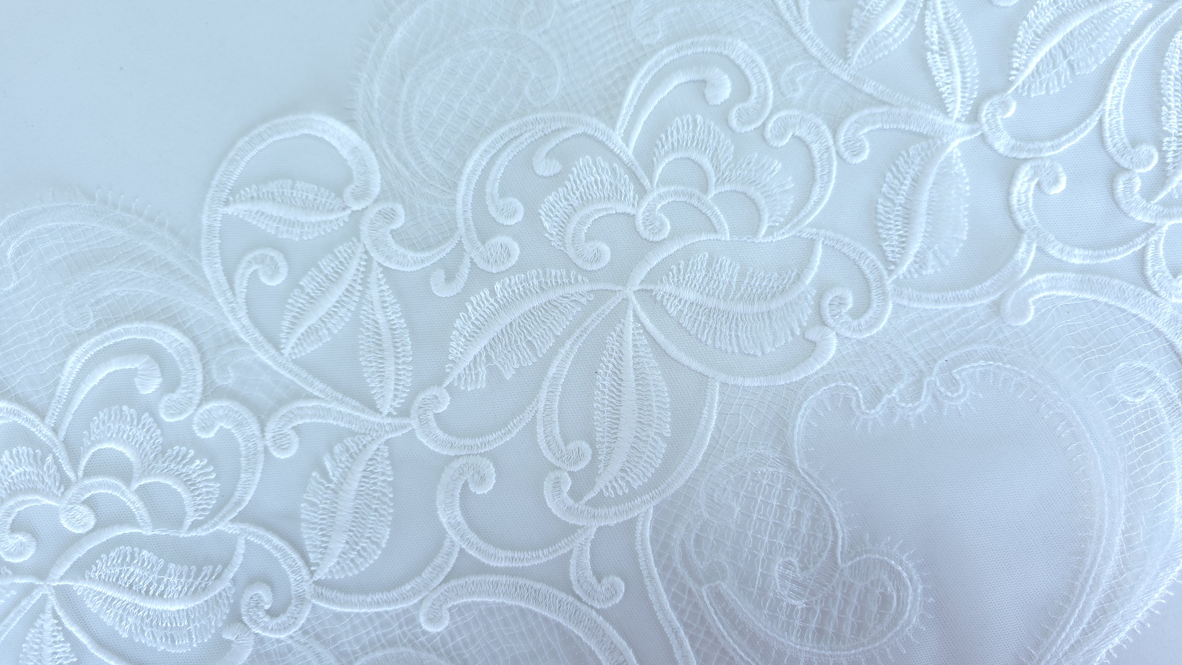 Dantela ivory Ricamificio Levi – dantela tip bordura, realizata in Italia. Are un desen decorativ bogat, bine conturat, potrivita pentru finisaje si aplicatii elegante.