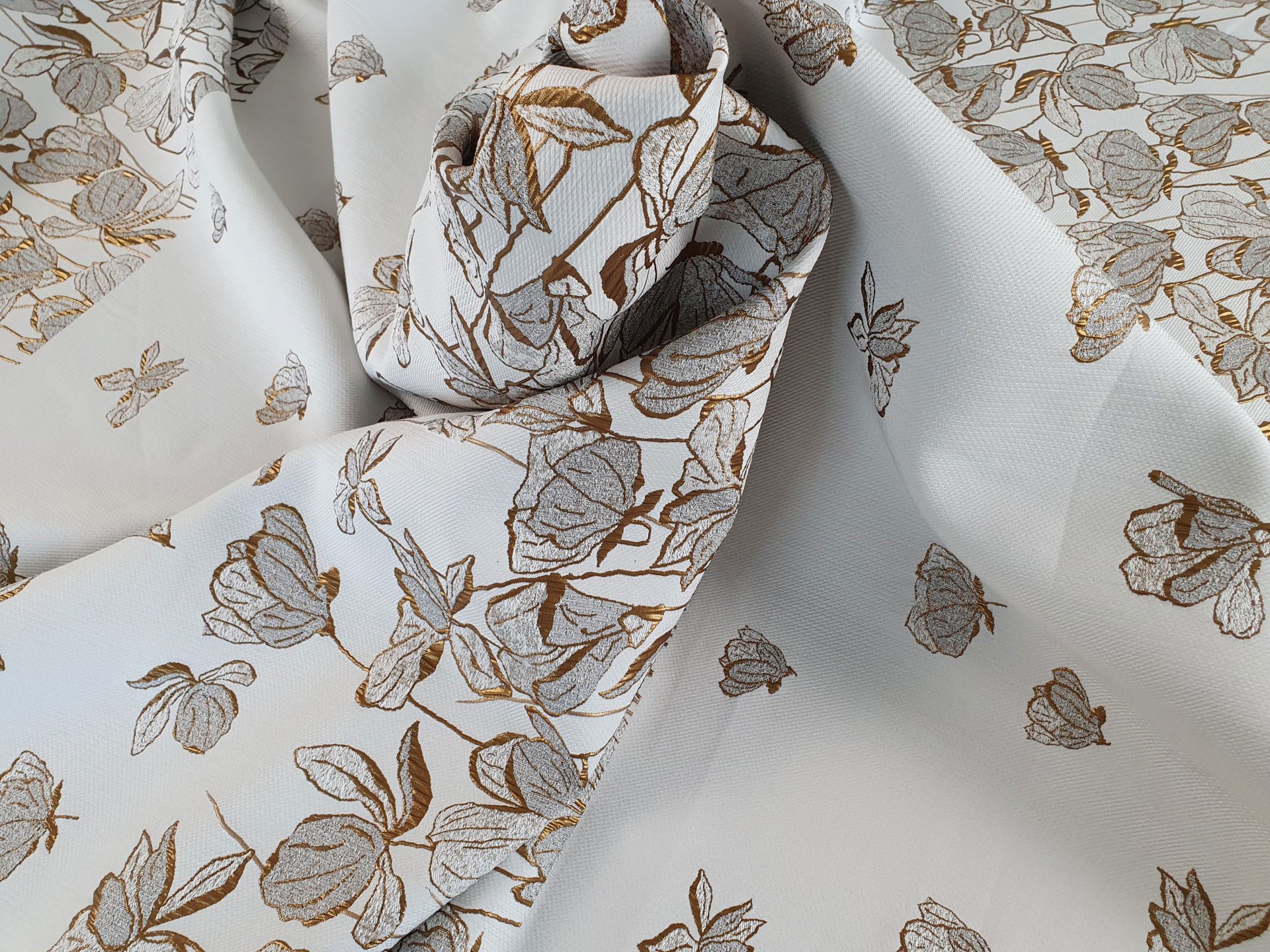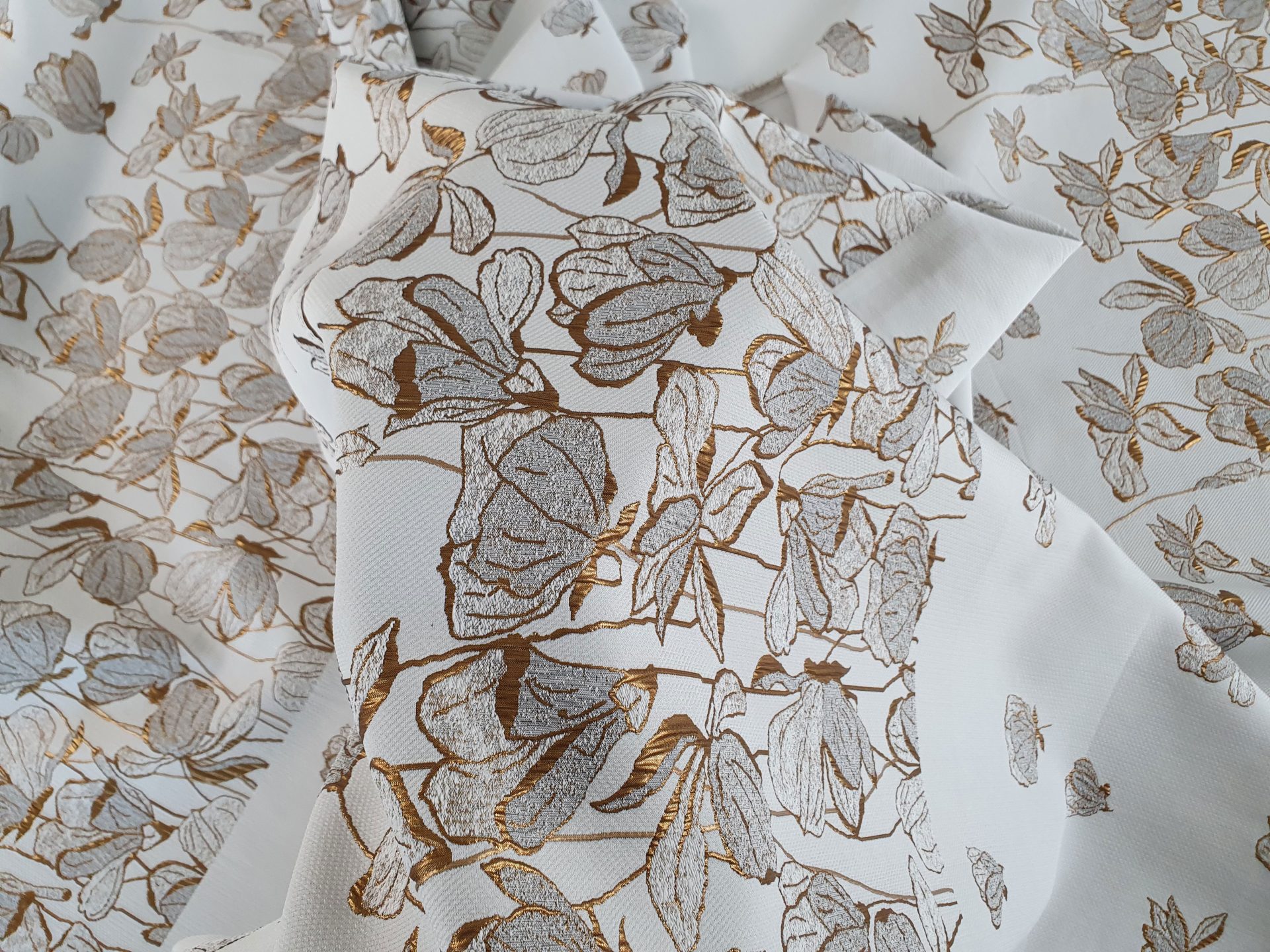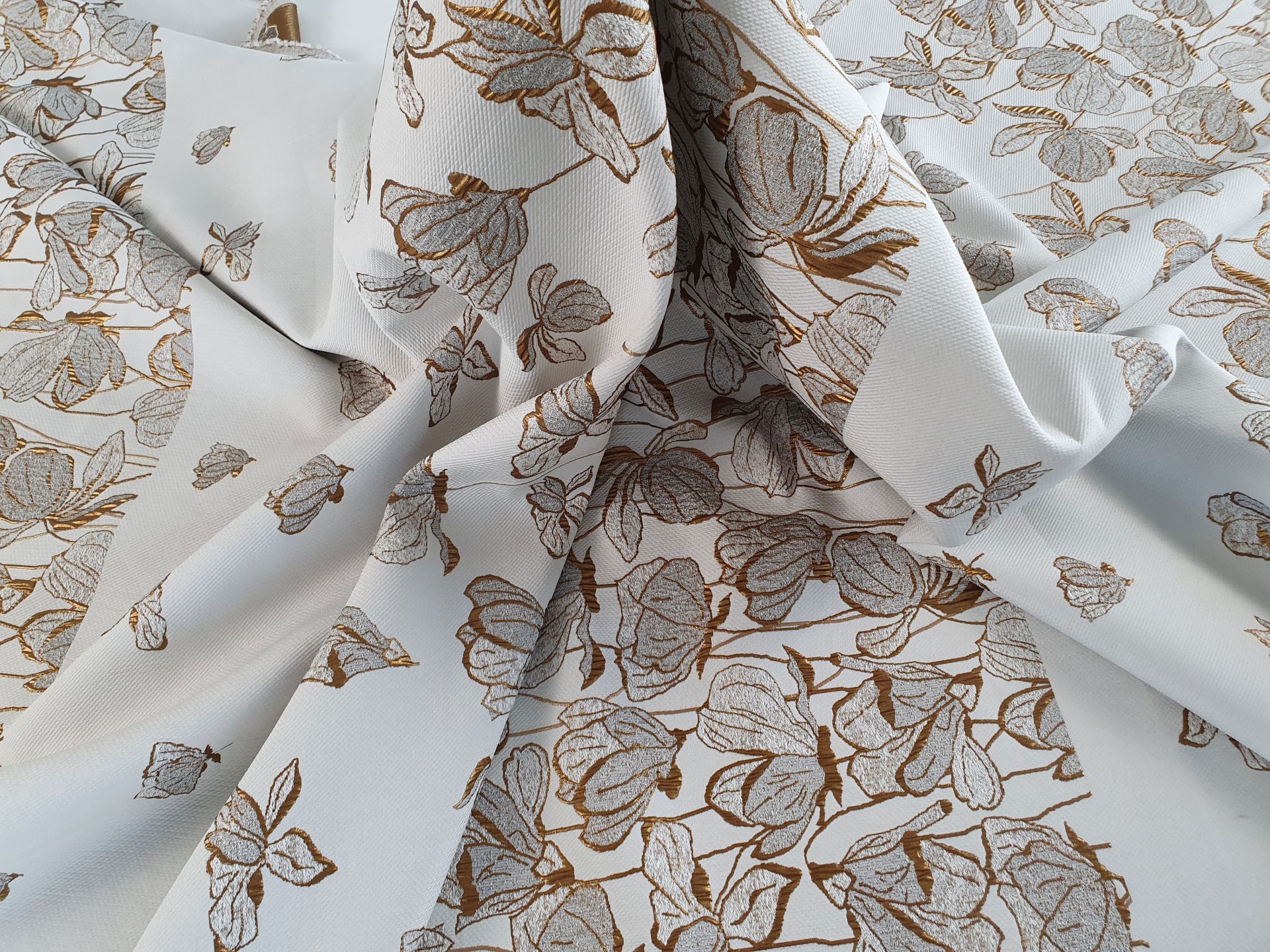 Brocard beige & gold cu flori, cu model floral de mari dimensiuni, realizat prin inserții de fir metalizat auriu și argintiu pe un fundal crem. Textura este ușor reliefată, plăcută la atingere, cu o ținută medie spre rigidă, ceea ce permite realizarea unor croiuri spectaculoase. Modelul cu motive florale este unul repetitiv la un interval de aproximativ 0.78 cm. Textura brocartului combină eleganța clasică cu un stil modern, ideală pentru rochii de ocazie, fuste ample, sacouri, paltoane scurte sau croieli reversibile. Vă invităm să ne urmăriți și pe rețelele de socializare pentru a rămâne informați cu privire la ultimele noastre actualizări, oferte exclusive și surse de inspirație. Alăturați-vă comunității noastre online pe Facebook și Instagram. Vă așteptăm cu drag!