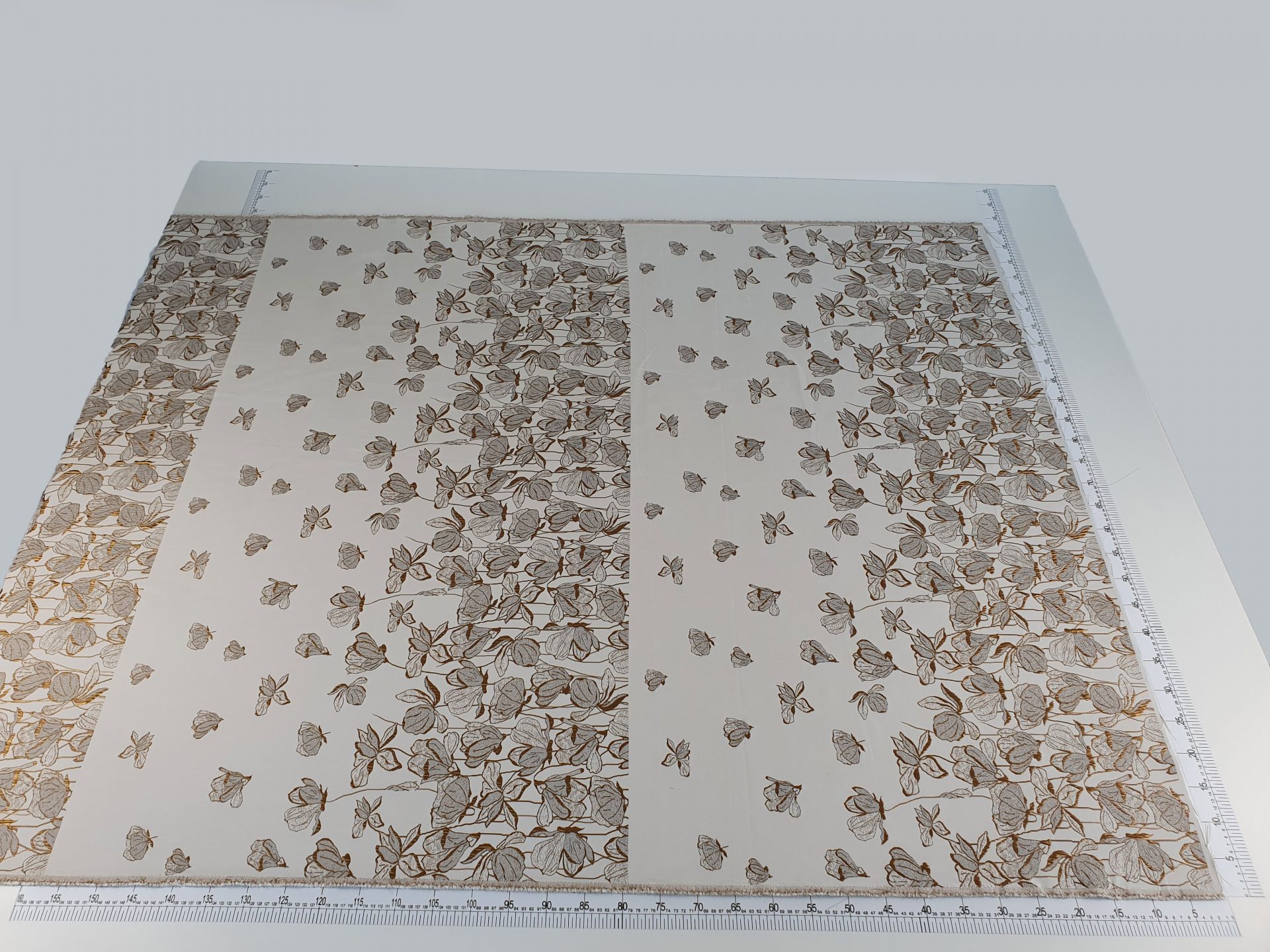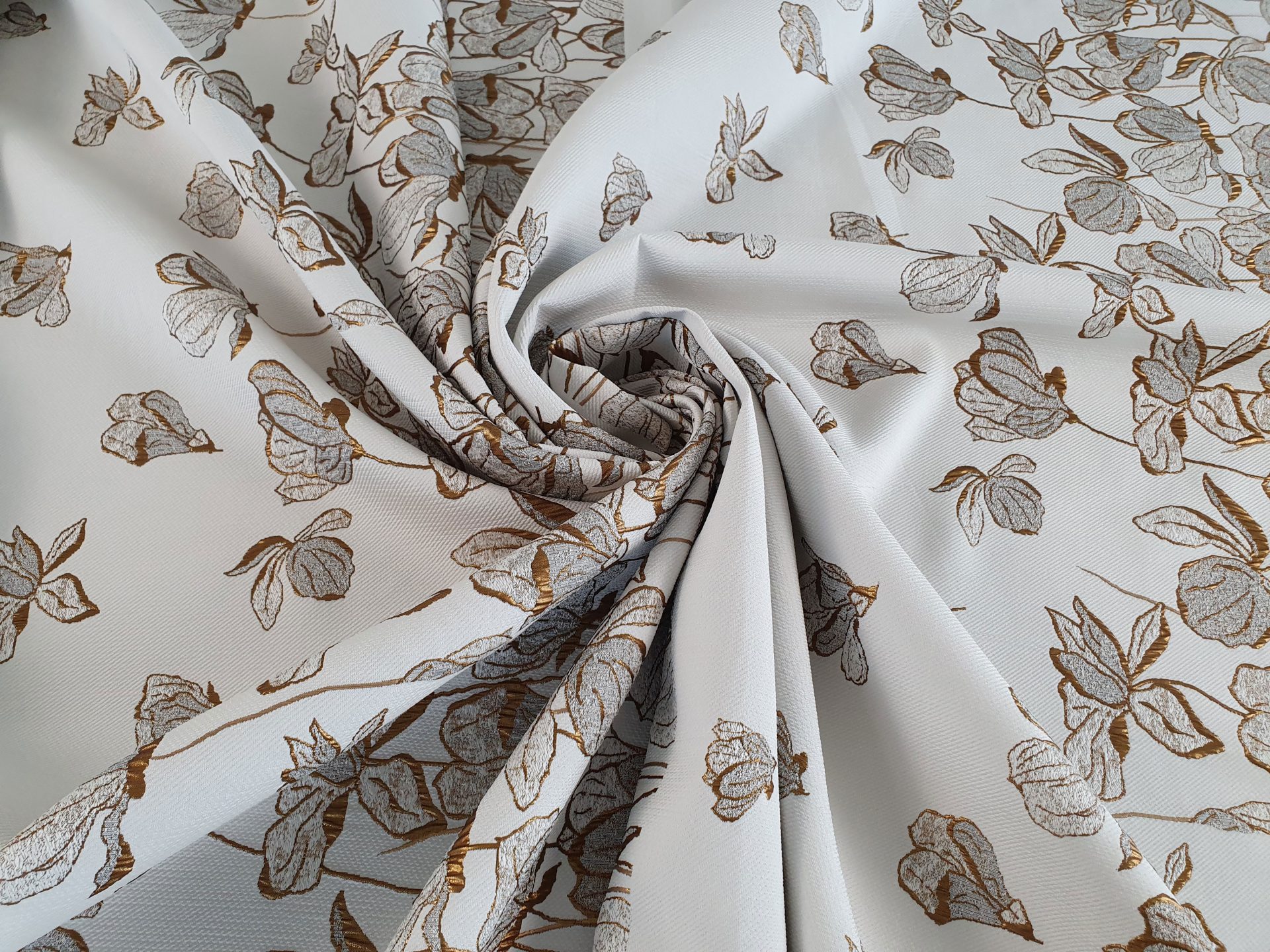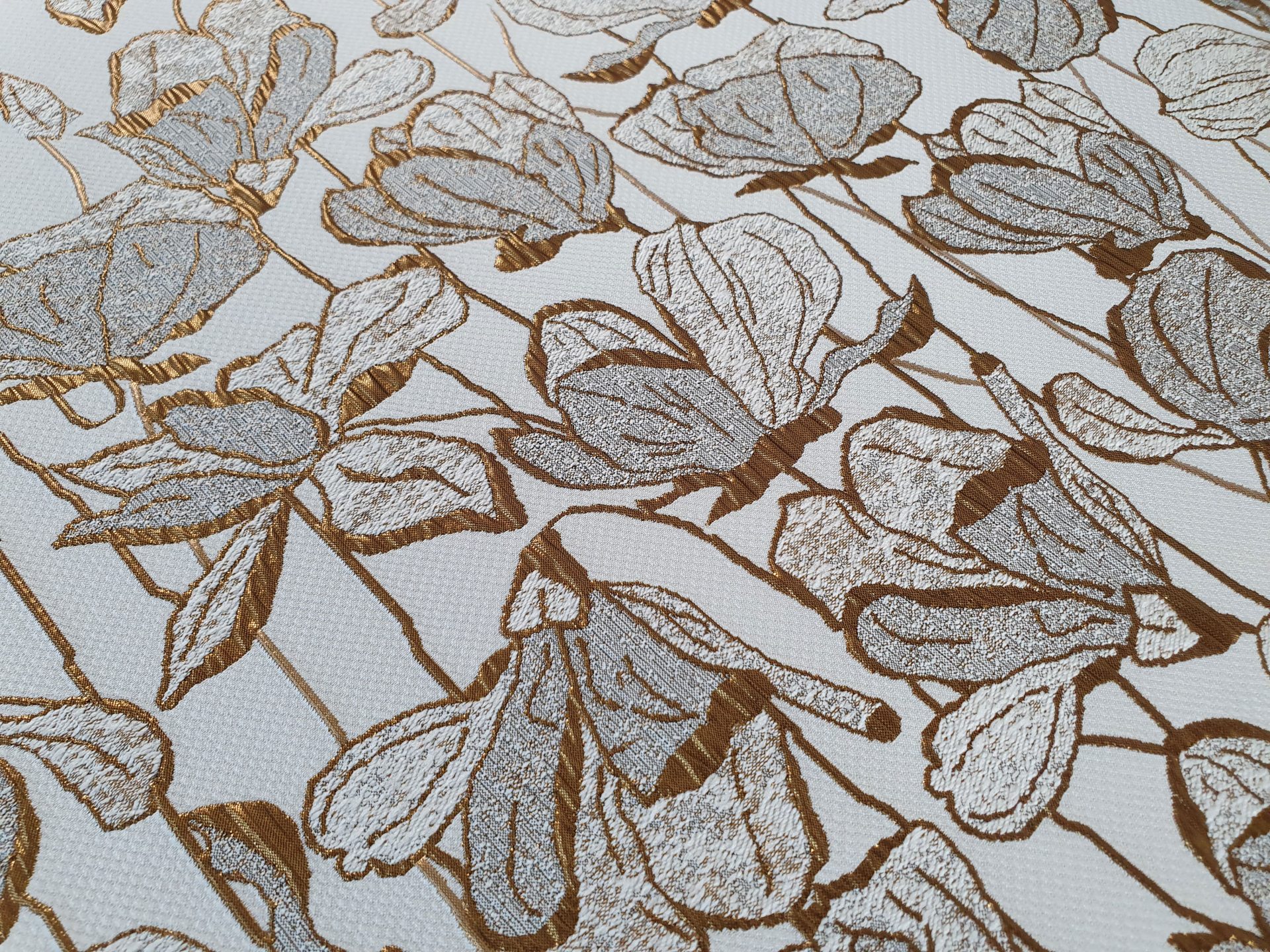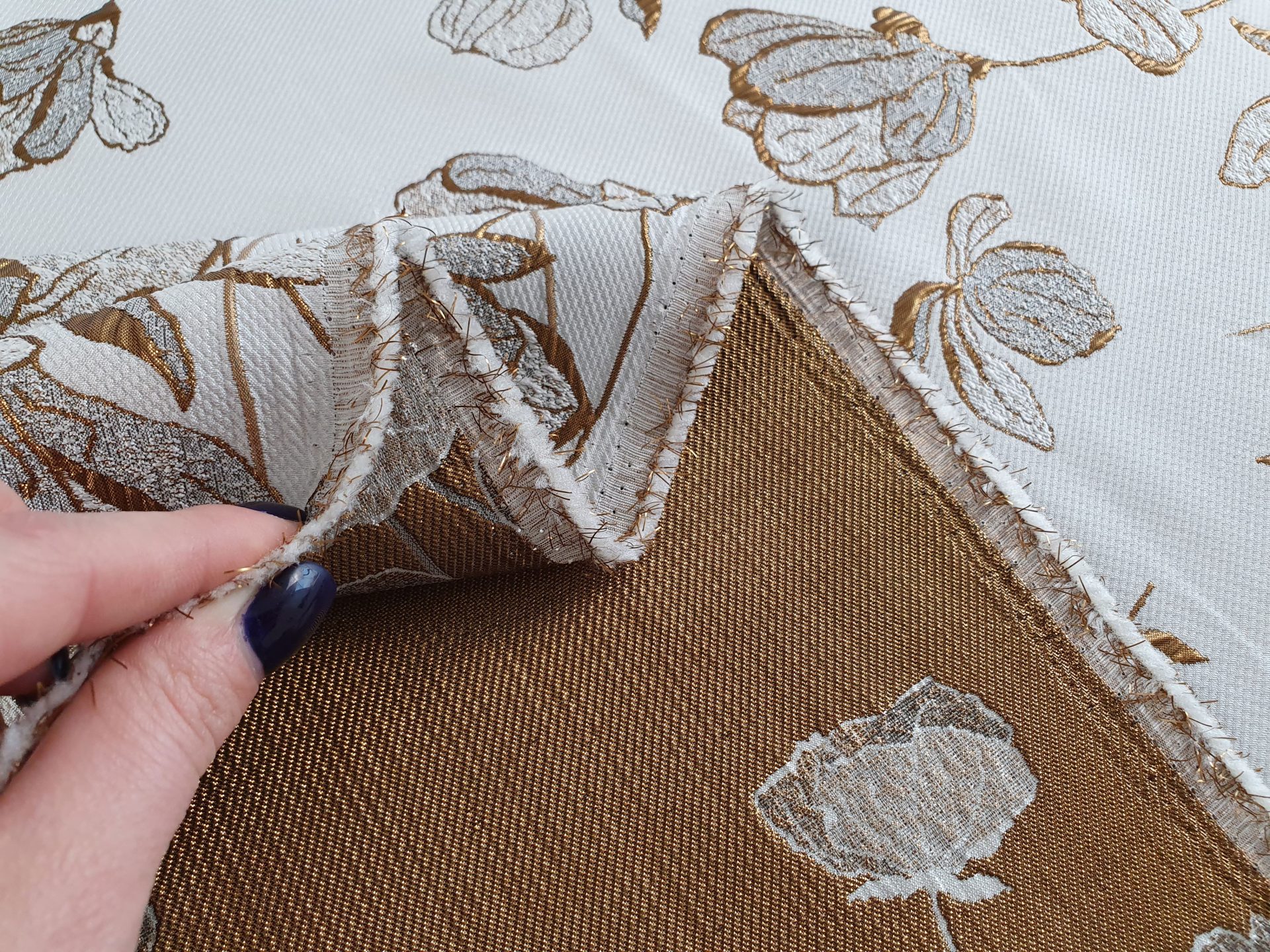 Brocard beige & gold cu flori, cu model floral de mari dimensiuni, realizat prin inserții de fir metalizat auriu și argintiu pe un fundal crem. Textura este ușor reliefată, plăcută la atingere, cu o ținută medie spre rigidă, ceea ce permite realizarea unor croiuri spectaculoase. Modelul cu motive florale este unul repetitiv la un interval de aproximativ 0.78 cm. Textura brocartului combină eleganța clasică cu un stil modern, ideală pentru rochii de ocazie, fuste ample, sacouri, paltoane scurte sau croieli reversibile. Vă invităm să ne urmăriți și pe rețelele de socializare pentru a rămâne informați cu privire la ultimele noastre actualizări, oferte exclusive și surse de inspirație. Alăturați-vă comunității noastre online pe Facebook și Instagram. Vă așteptăm cu drag!