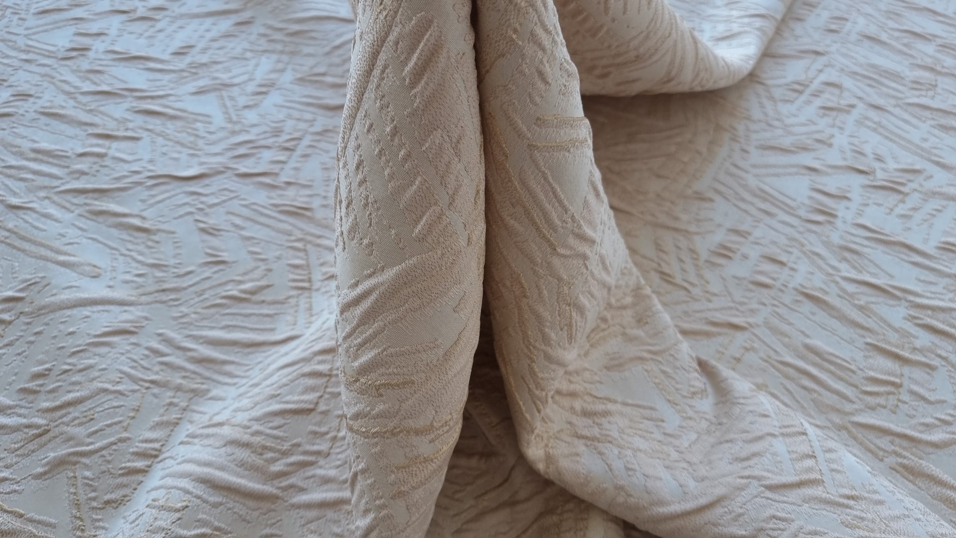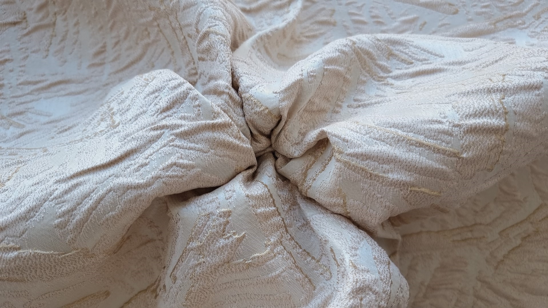 Brocard cu fir metalizat beige pearl, fara elastan, grosime medie, cu model distribuit pe intreaga suprafata, în tonuri elegante de bej perlat și auriu discret. Țesătura are o textură reliefată cu jocuri de lumini și reflexii fine, ce adaugă un plus de eleganță și versatilitate. Este ideală pentru rochii de seară, sacouri, fuste, pantaloni sau ținute de ocazie, dar și pentru elemente decorative cu un aspect premium. Vă invităm să ne urmăriți și pe rețelele de socializare pentru a rămâne informați cu privire la ultimele noastre actualizări, oferte exclusive și surse de inspirație. Alăturați-vă comunității noastre online pe Facebook și Instagram. Vă așteptăm cu drag!