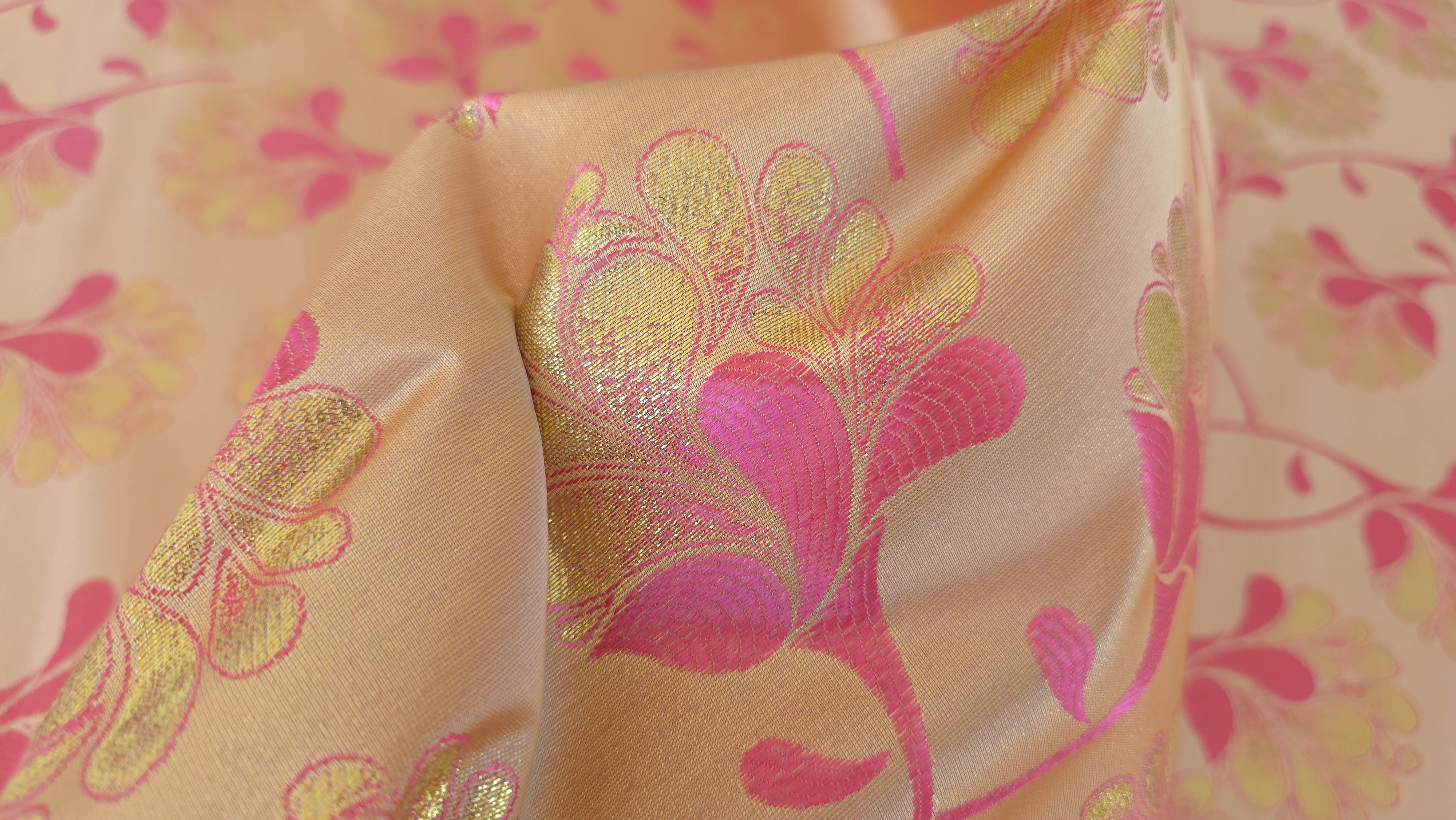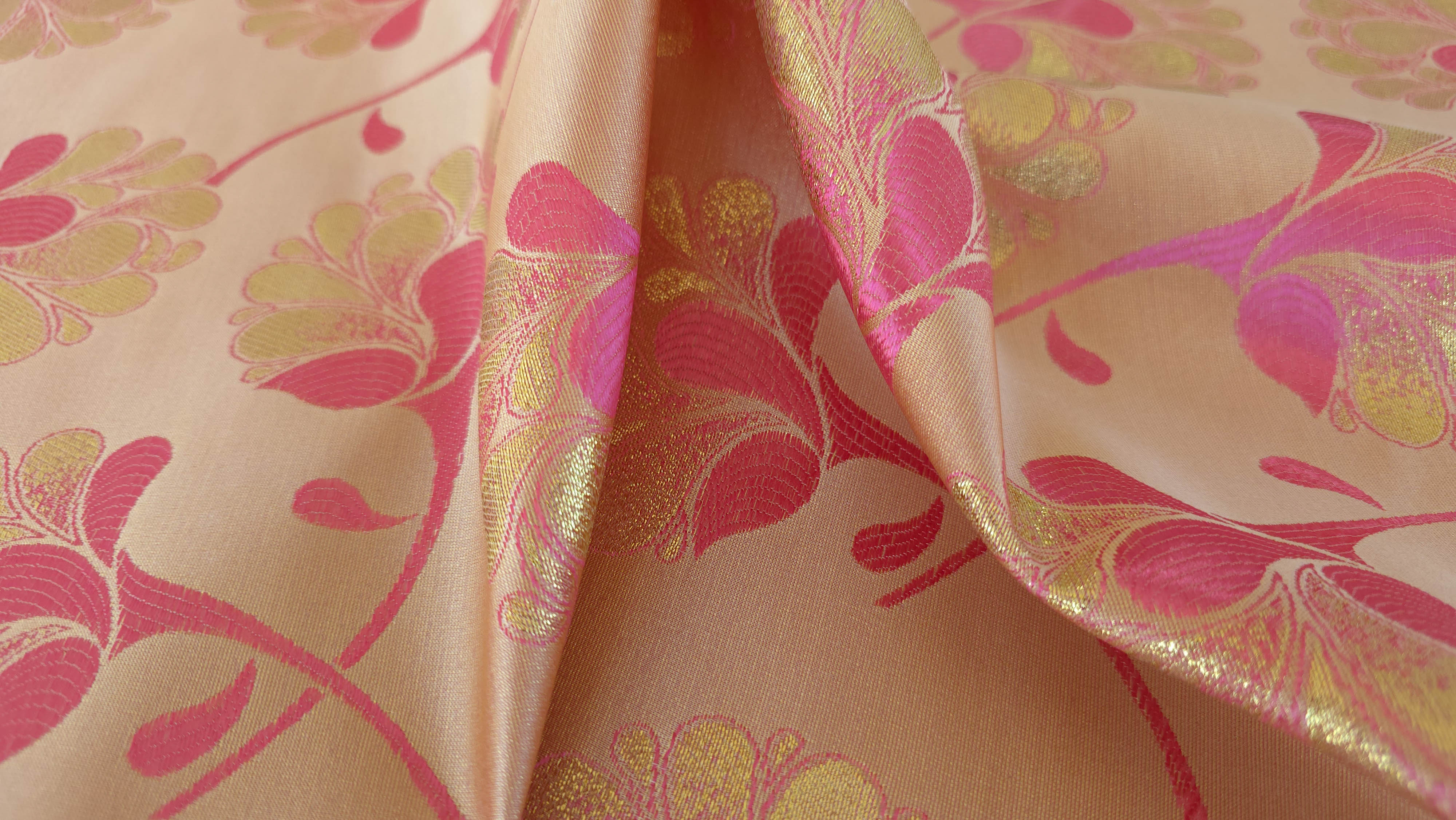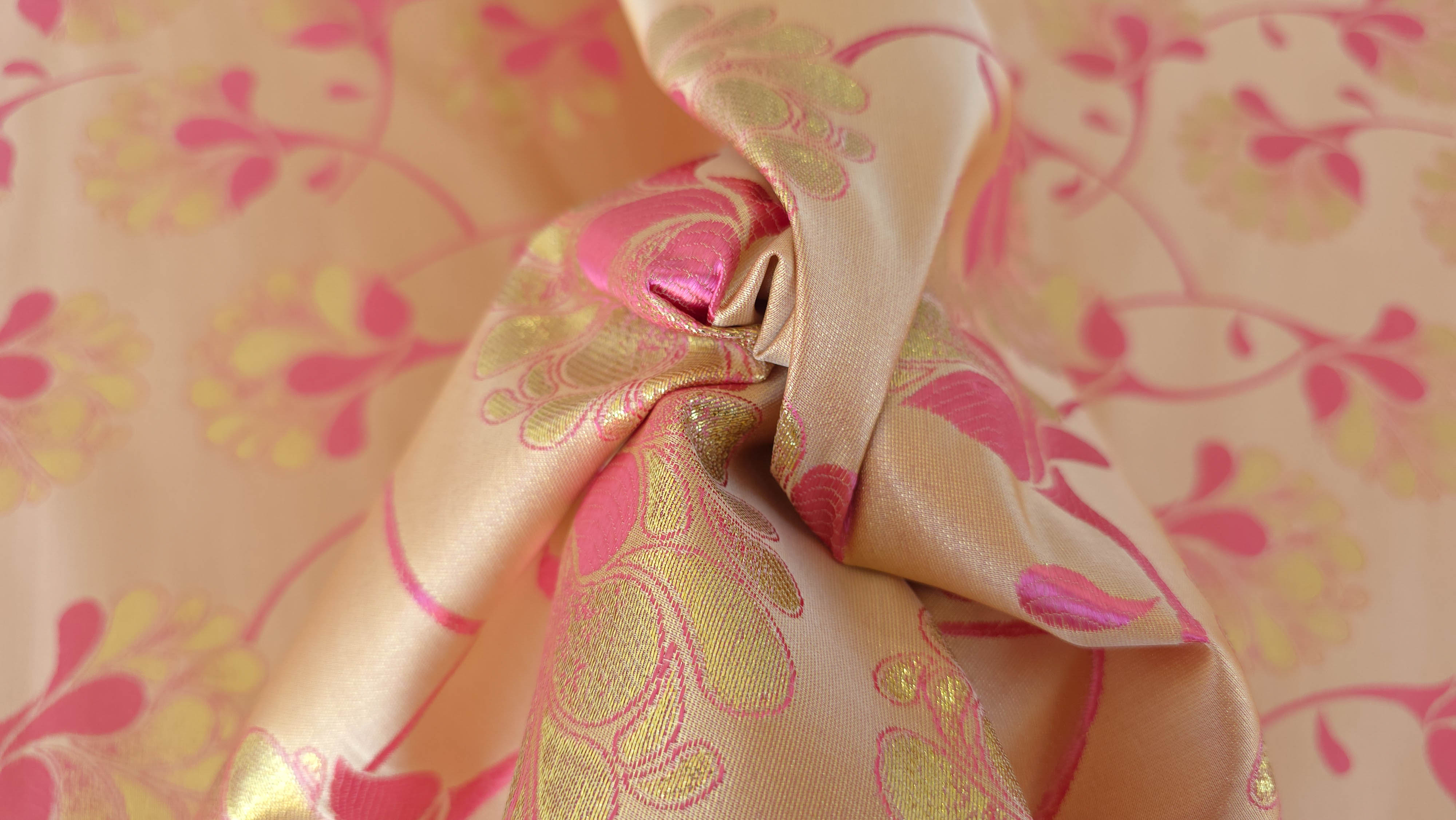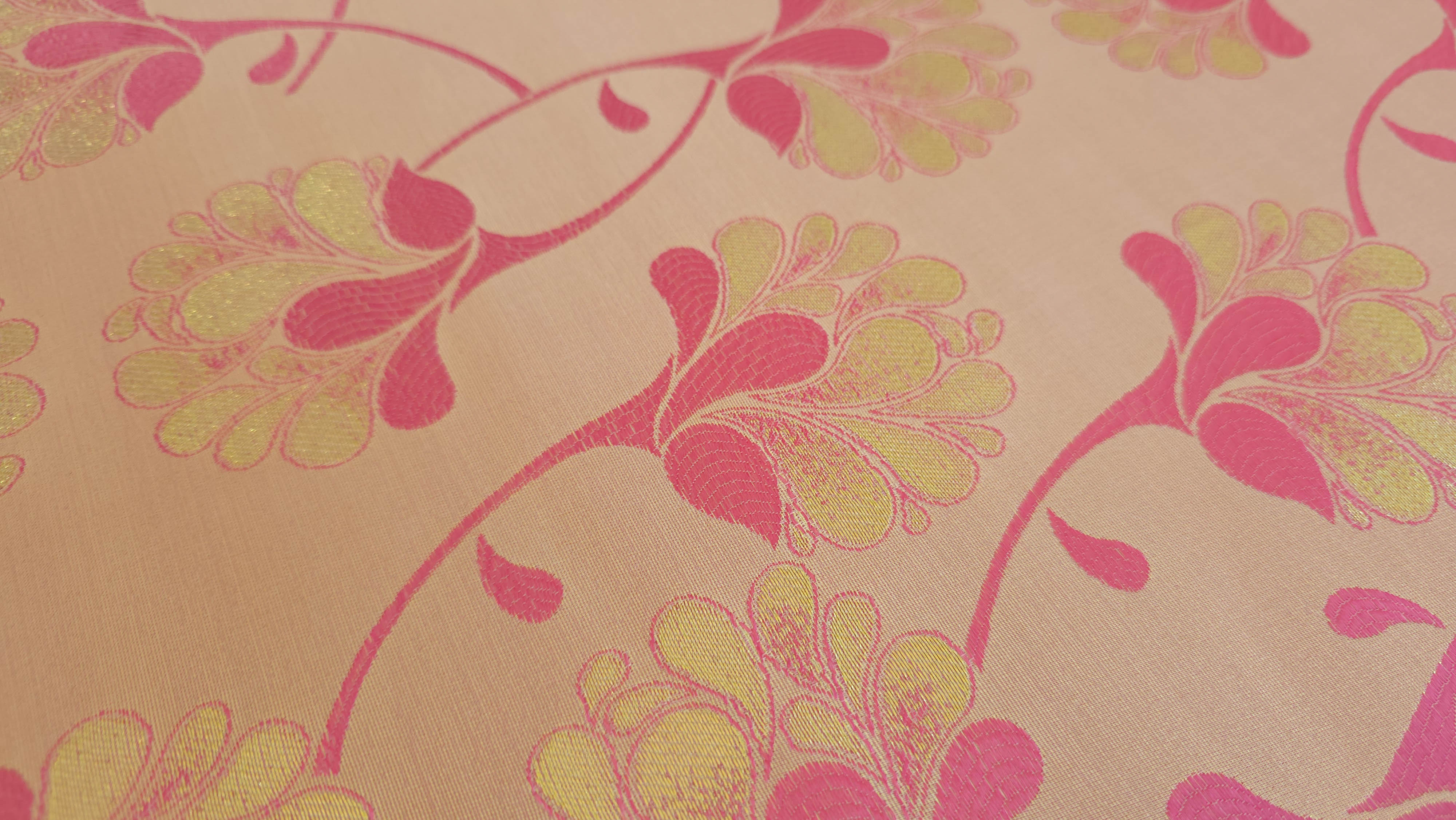 Brocard cu model floral roz fucsia, si insertii de fir metalizat auriu, distribuit pe intreaga suprafata, pe fond bej cald. Materialul are un luciu elegant și o textură fină, reliefată, care reflectă lumina și pune în evidență contrastul dintre culori. Este o țesătură spectaculoasă și versatilă, potrivită pentru rochii de ocazie, sacouri elegante, fuste ample sau pentru elemente decorative ce adaugă o notă luxoasă și expresivă. Vă invităm să ne urmăriți și pe rețelele de socializare pentru a rămâne informați cu privire la ultimele noastre actualizări, oferte exclusive și surse de inspirație. Alăturați-vă comunității noastre online pe Facebook și Instagram. Vă așteptăm cu drag!