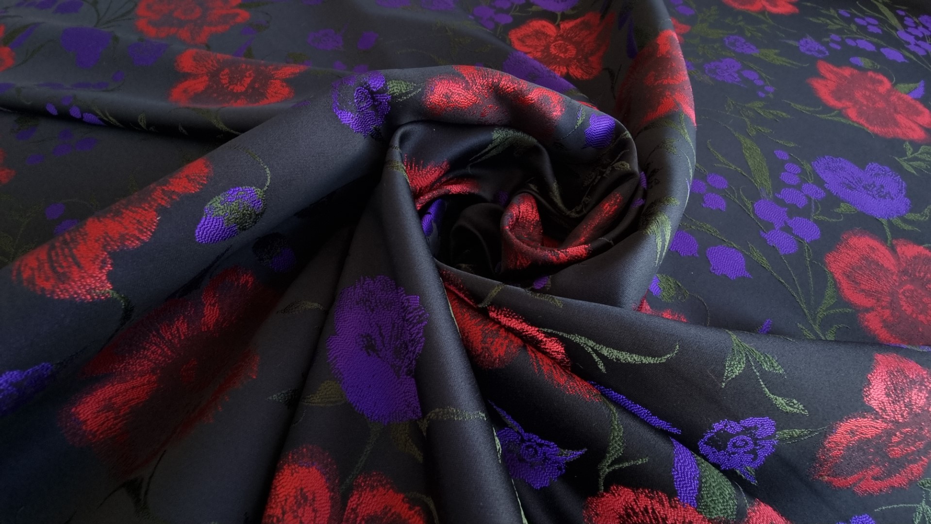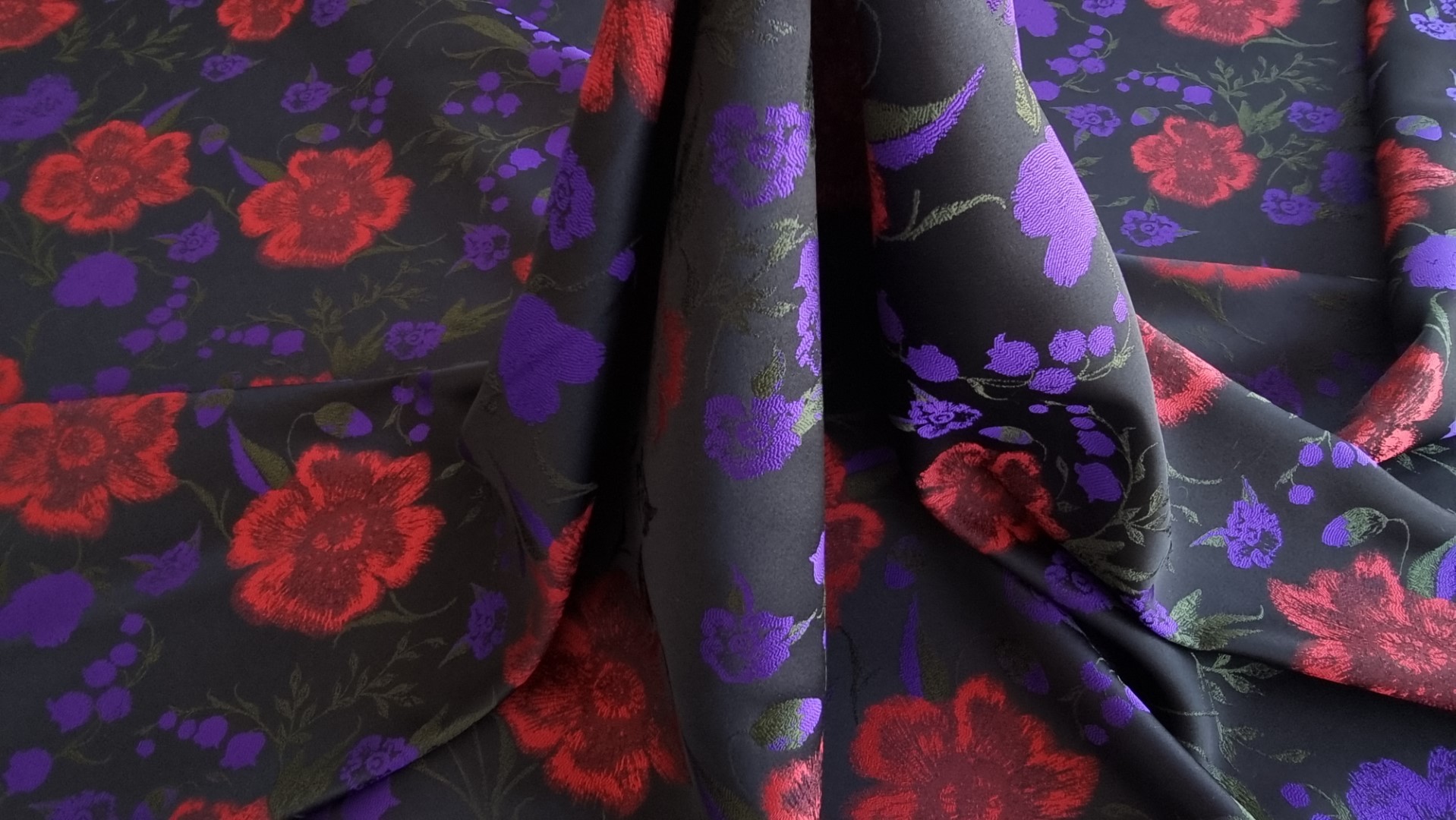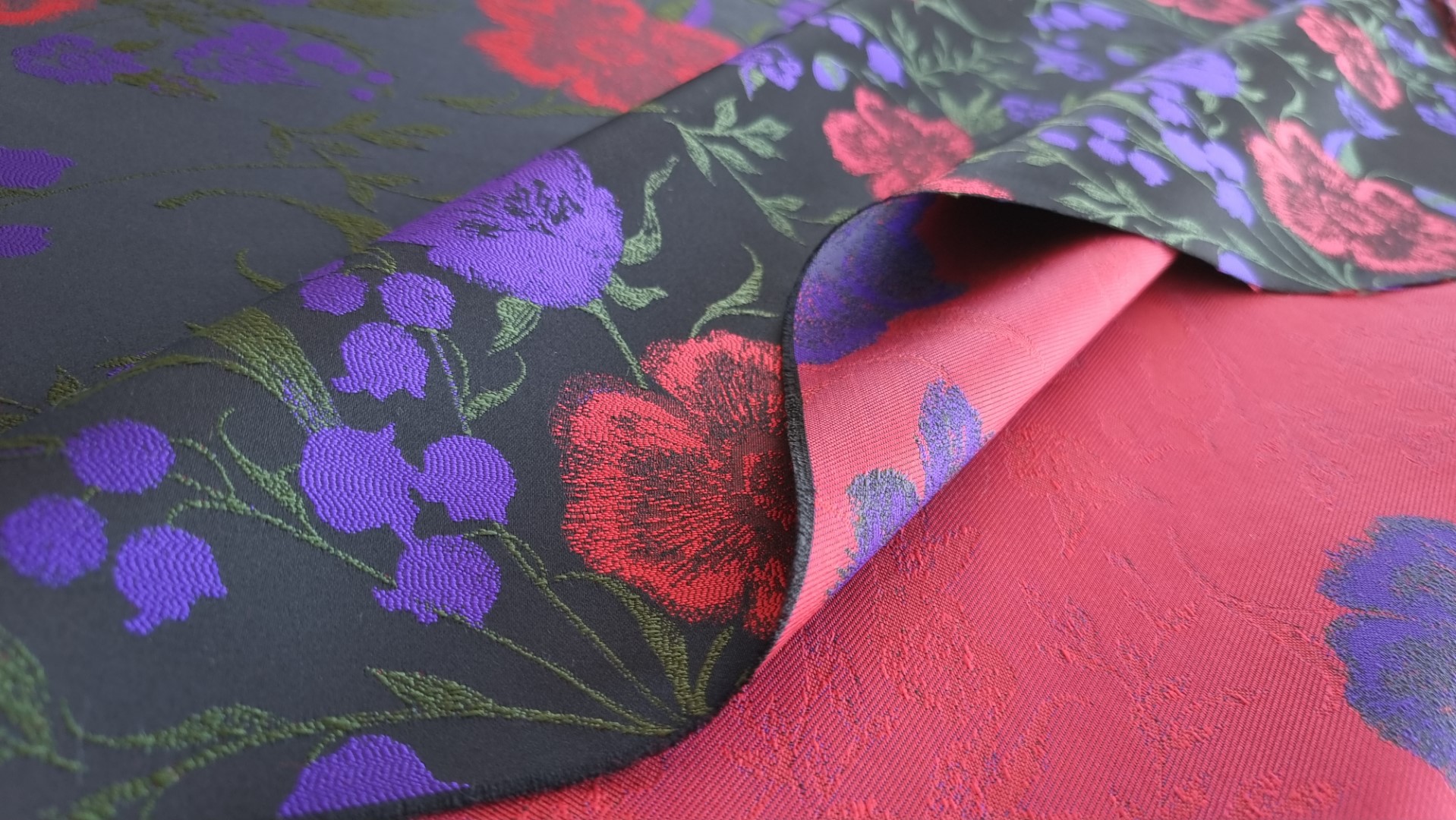 Brocard cu model multicolor fuchsia dark ,cu două fețe, elegantă și versatilă, ce îmbină un fond negru cu imprimeu floral roșu și violet pe o parte, iar pe verso un roșu intens decorat cu flori violet. Materialul are un aspect bogat, texturat, cu relief subtil, potrivit pentru creații vestimentare spectaculoase sau detalii decorative cu impact vizual. Este o alegere ideală pentru rochii de seară, fuste ample, sacouri statement sau ținute de gală ce doresc să atragă atenția prin contrastul cromatic și jocul reversibil al fețelor. invităm să ne urmăriți și pe rețelele de socializare pentru a rămâne informați cu privire la ultimele noastre actualizări, oferte exclusive și surse de inspirație. Alăturați-vă comunității noastre online pe Facebook și Instagram. Vă așteptăm cu drag!