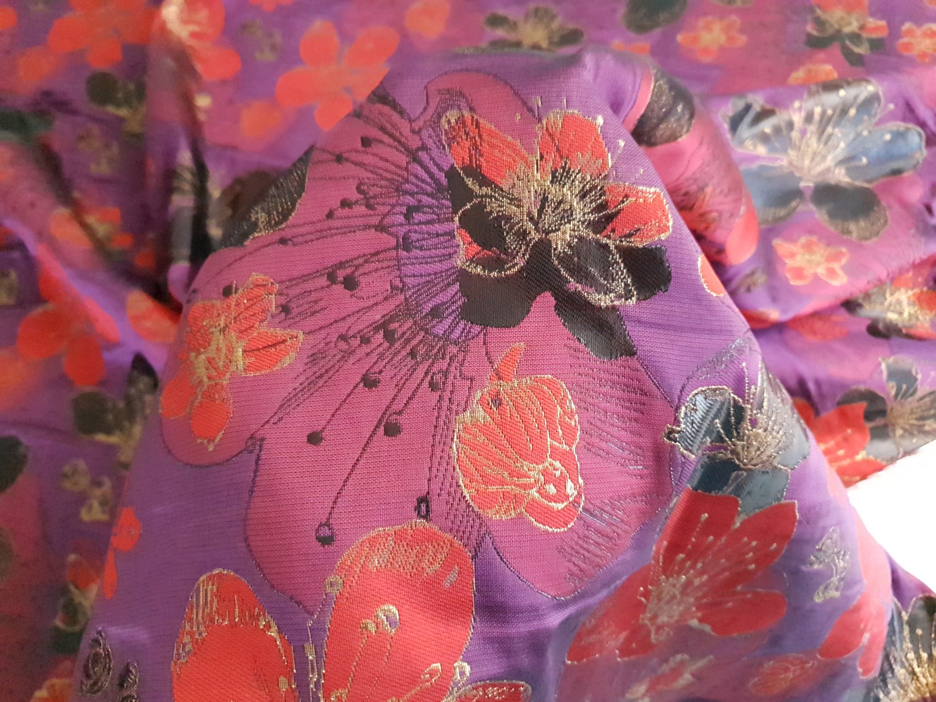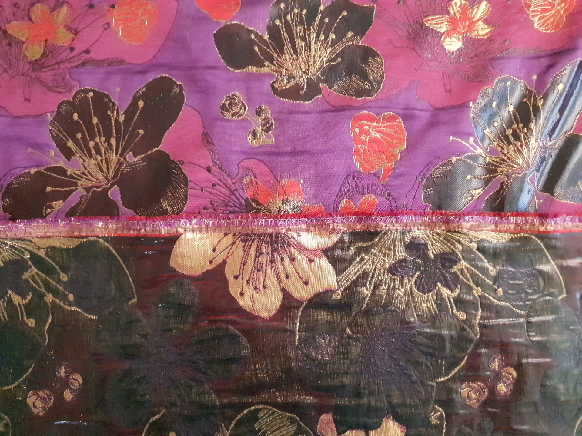 Ineditul acestui brocard consta in insertiile de “aur-aramiu” si alternanta de texturi.