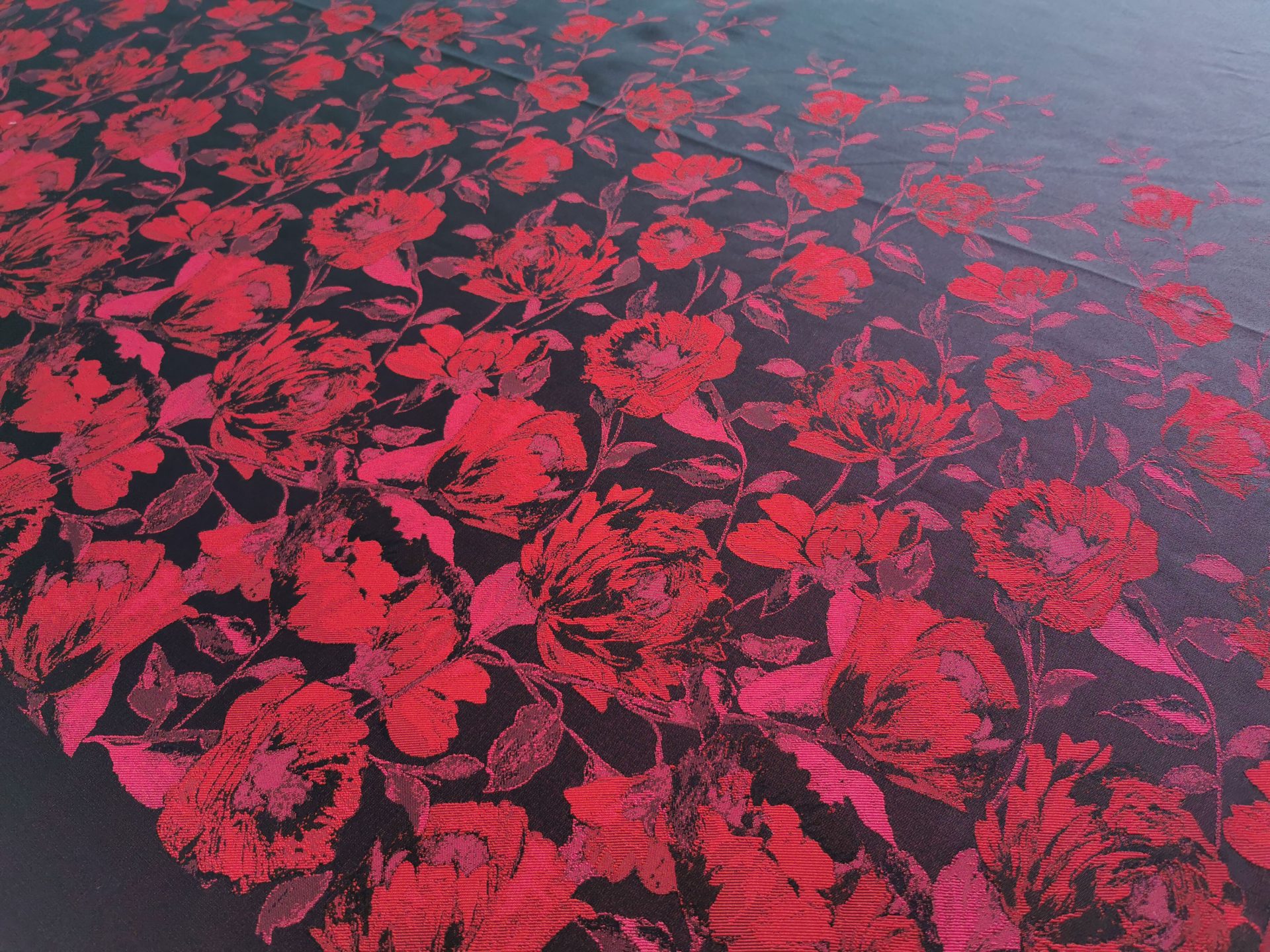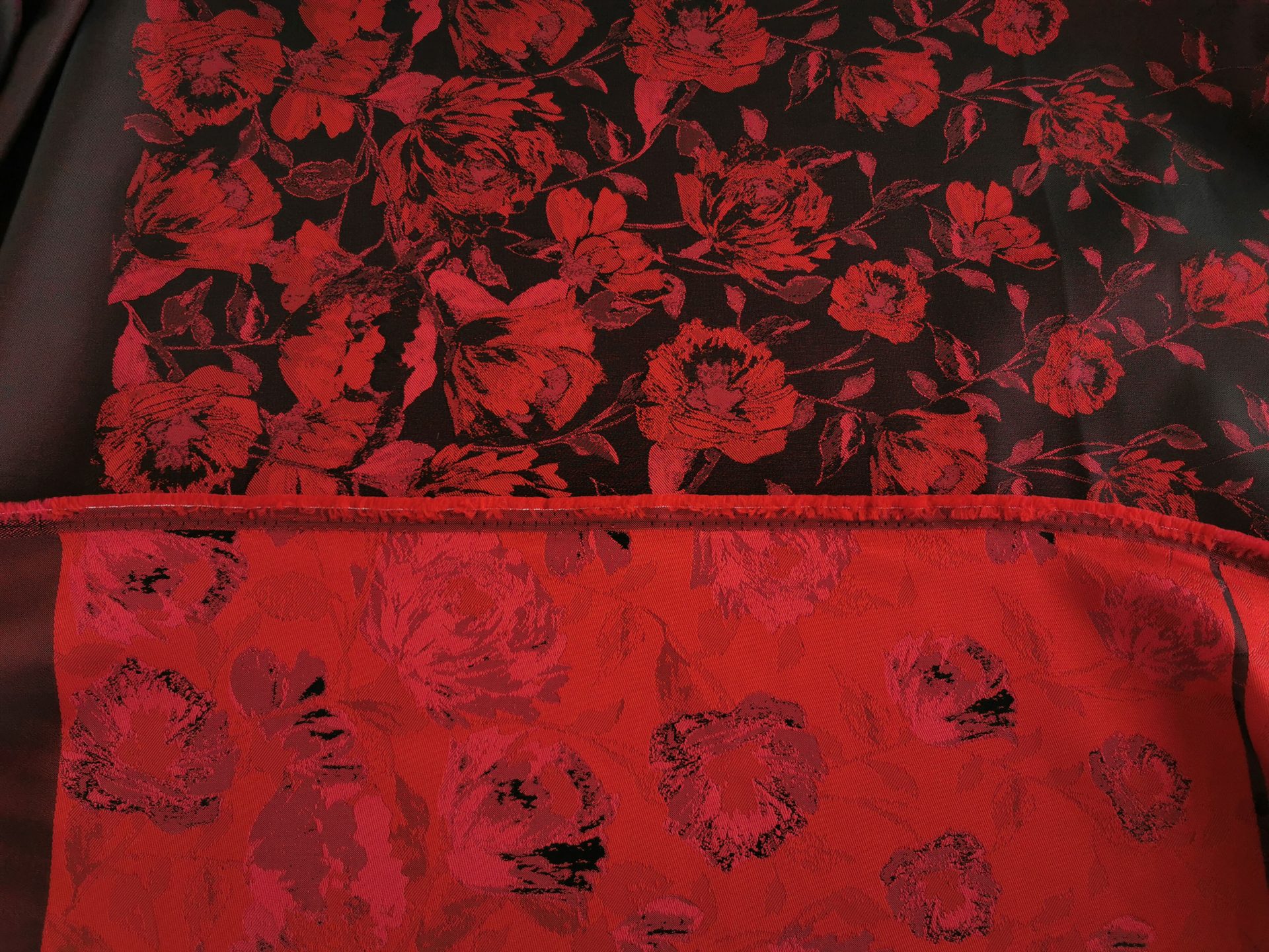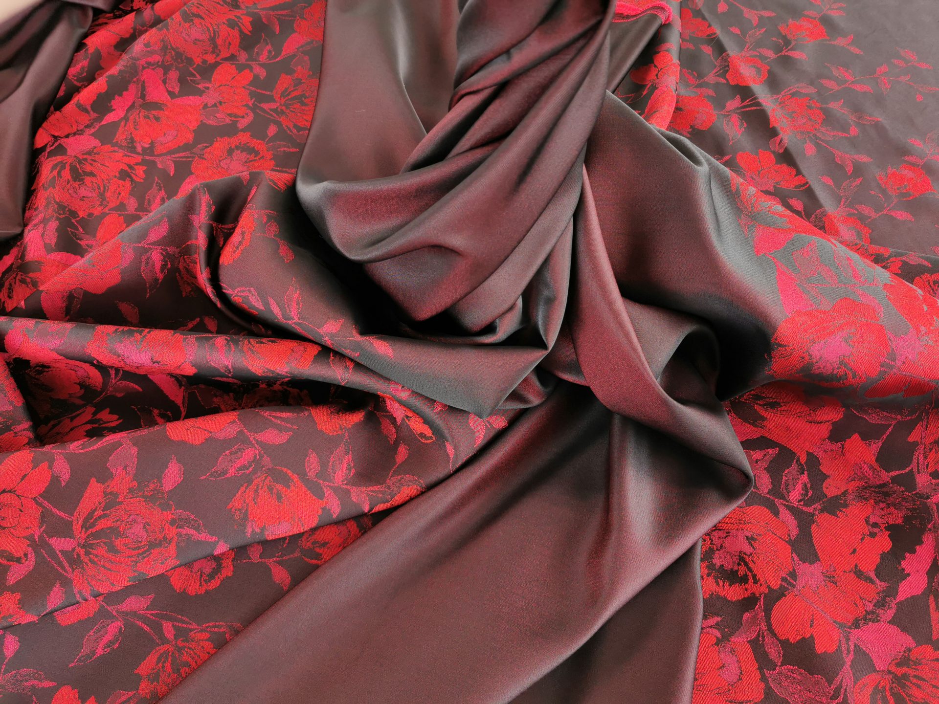Brocard rosu & burgundy cu flori si model ce se repeta la un interval de aproximativ 110 cm.
