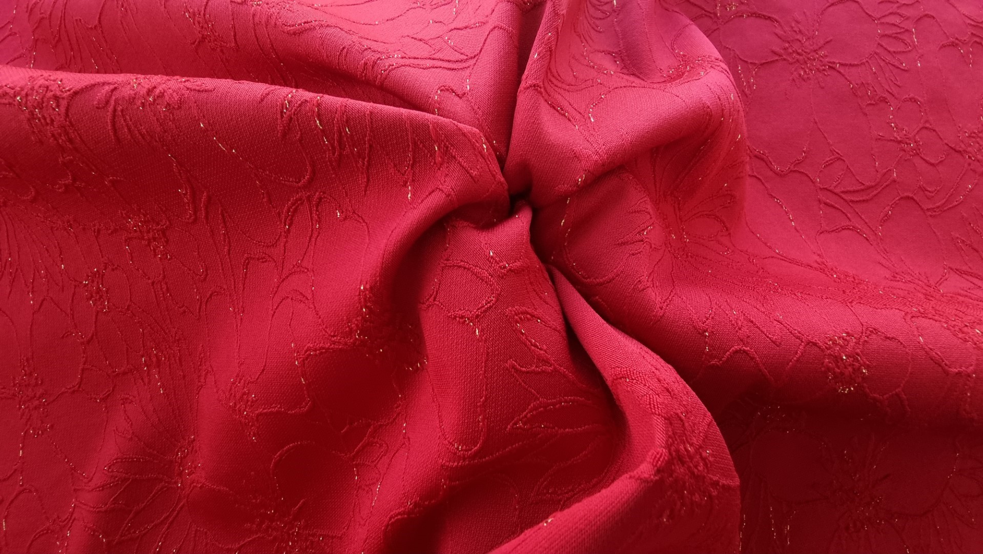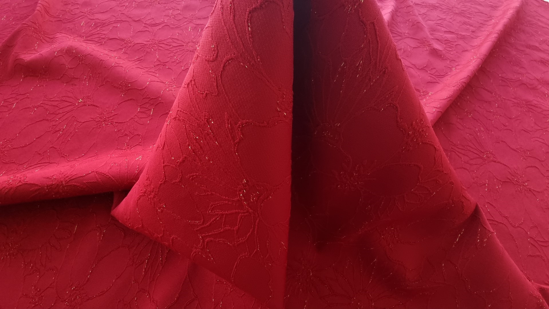 Brocard rosu cu model flori Francesca, subtire, usor elastic, cu insertii de fir metalizat.