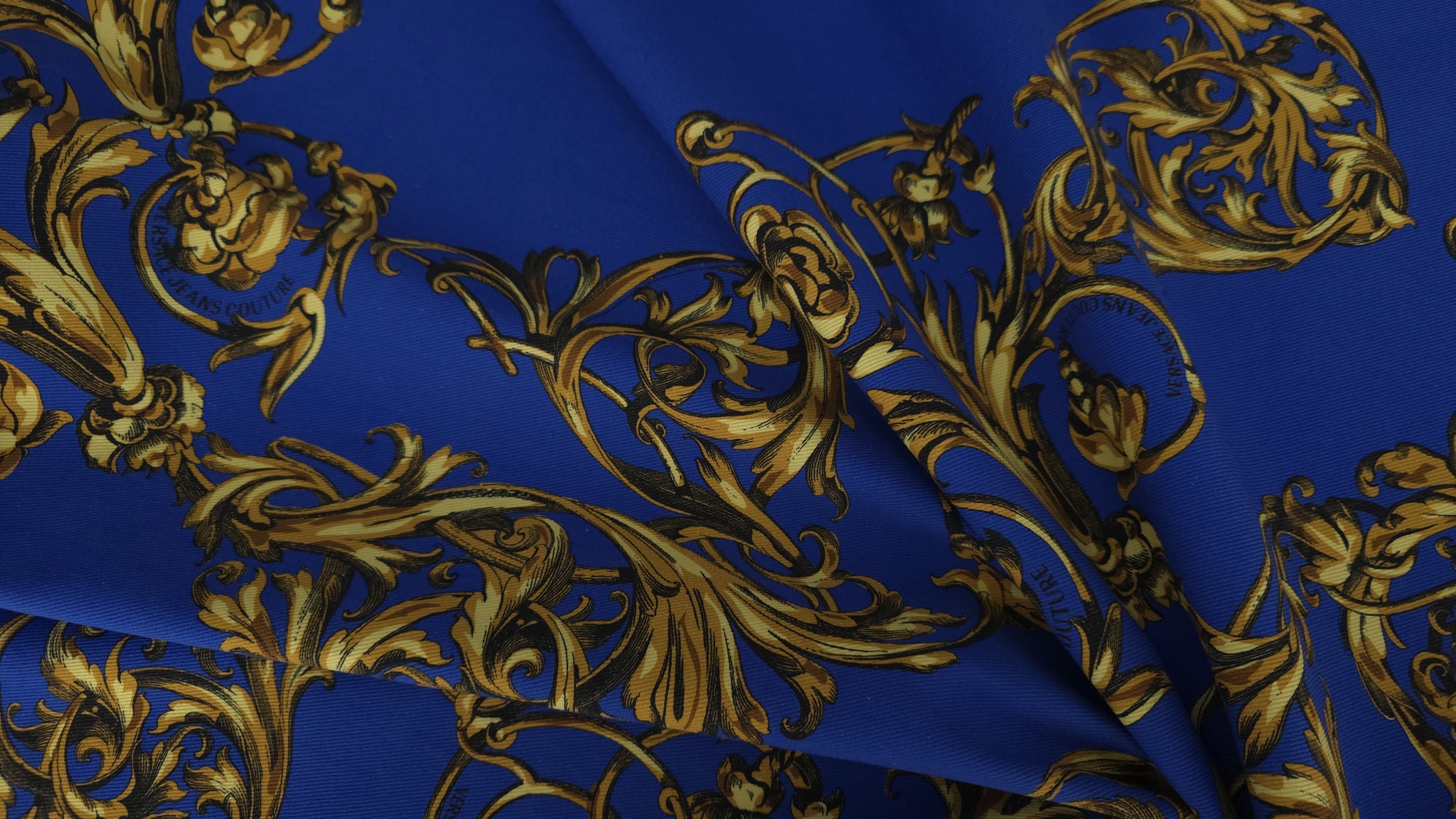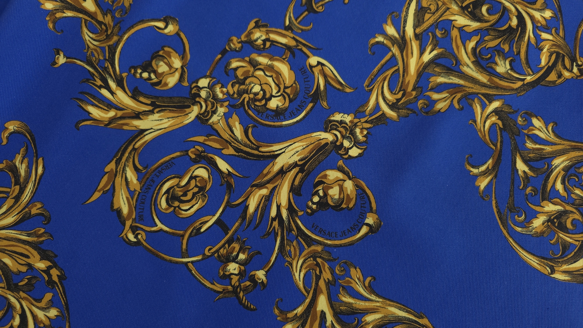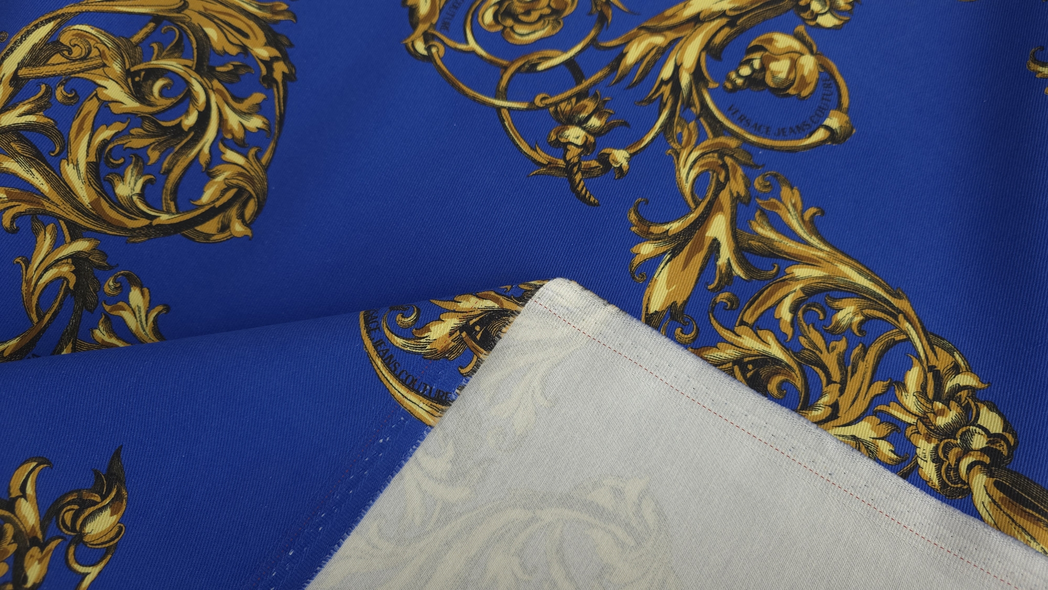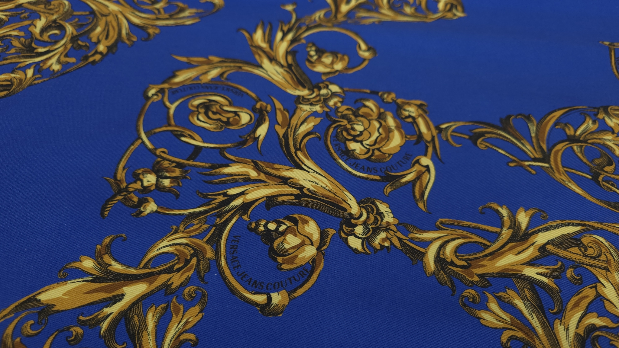 Blue denim cu imprimeu baroc auriu de inspirație Versace Couture, cu fond albastru cobalt intens pe care se desfășoară ornamente aurii în stil baroc, cu volute, frunze de acantă și medalioane circulare. Imprimeul este distribuit pe toată lățimea țesăturii într-un ritm echilibrat.