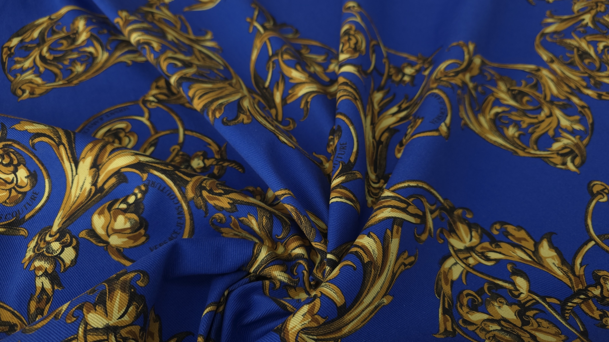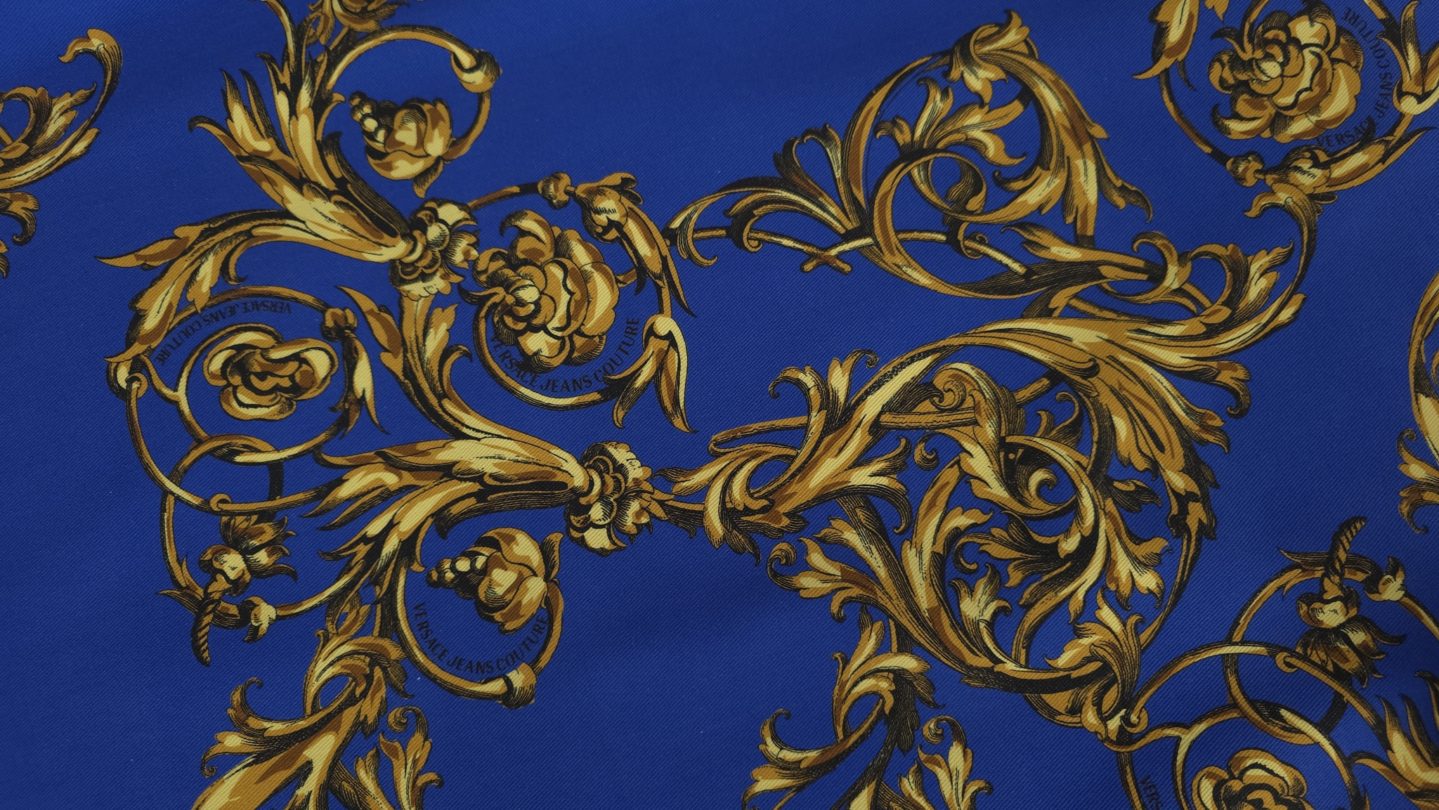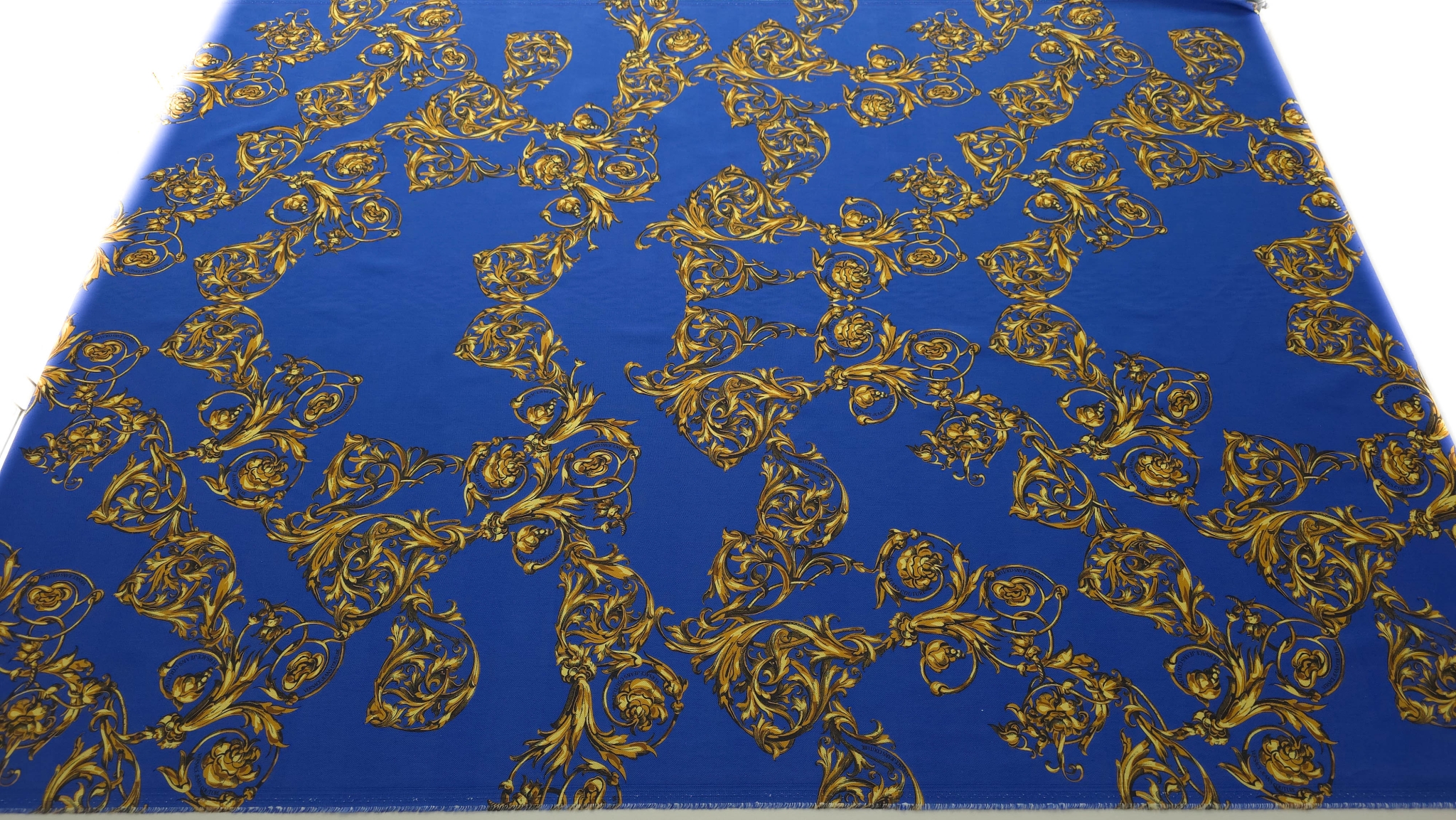 Blue denim cu imprimeu baroc auriu de inspirație Versace Couture, cu fond albastru cobalt intens pe care se desfășoară ornamente aurii în stil baroc, cu volute, frunze de acantă și medalioane circulare. Imprimeul este distribuit pe toată lățimea țesăturii într-un ritm echilibrat.