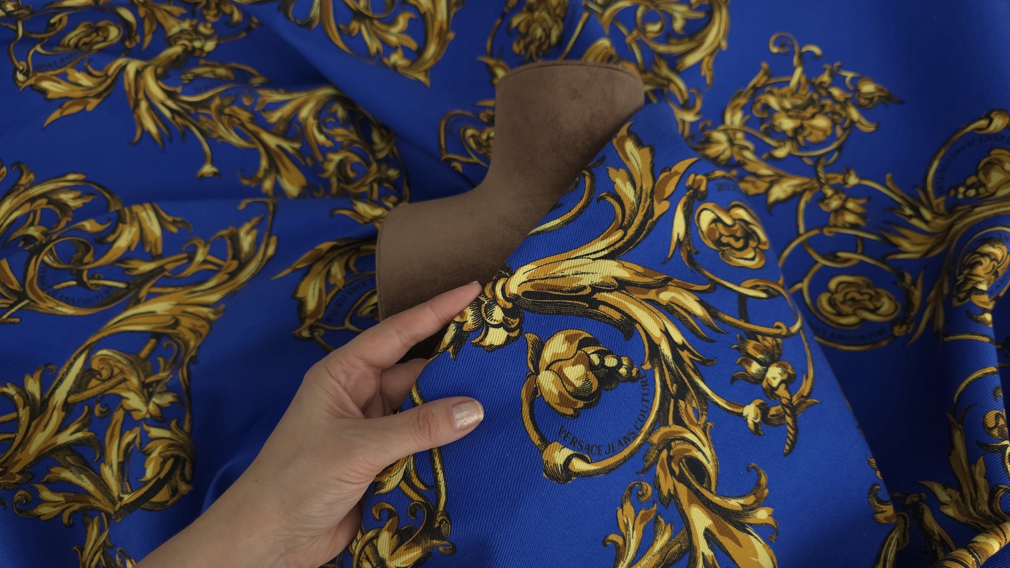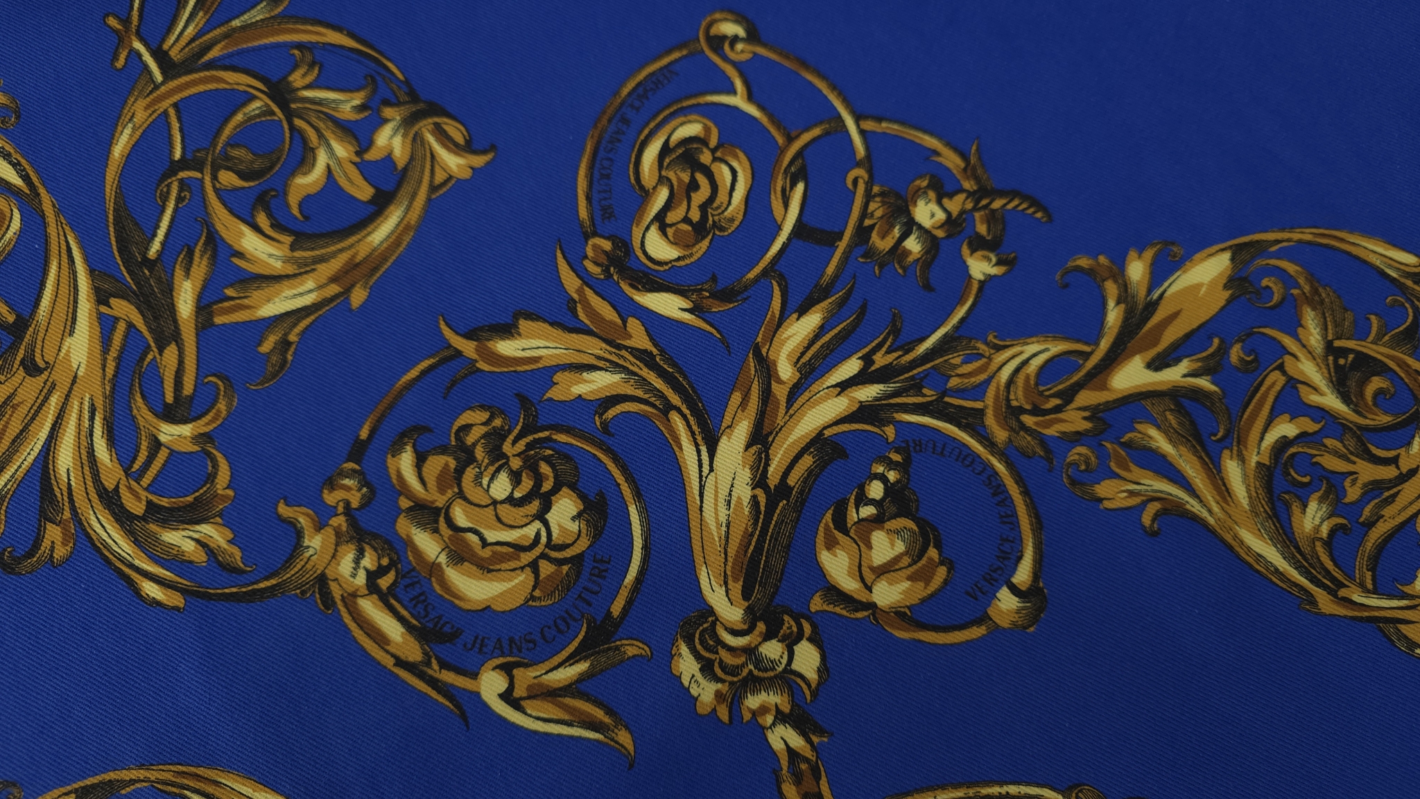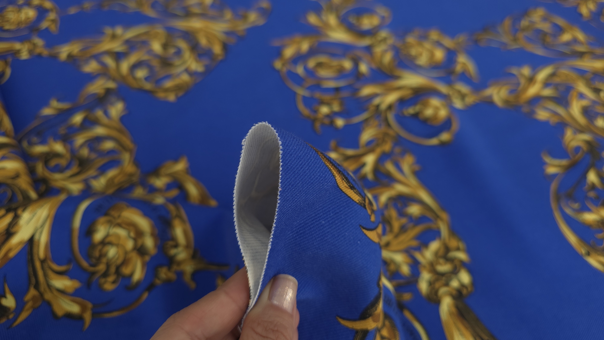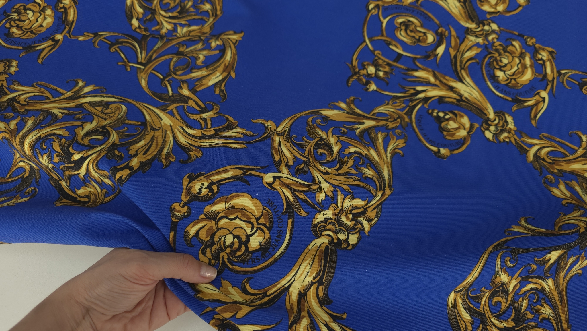Blue denim cu imprimeu baroc auriu de inspirație Versace Couture, cu fond albastru cobalt intens pe care se desfășoară ornamente aurii în stil baroc, cu volute, frunze de acantă și medalioane circulare. Imprimeul este distribuit pe toată lățimea țesăturii într-un ritm echilibrat.