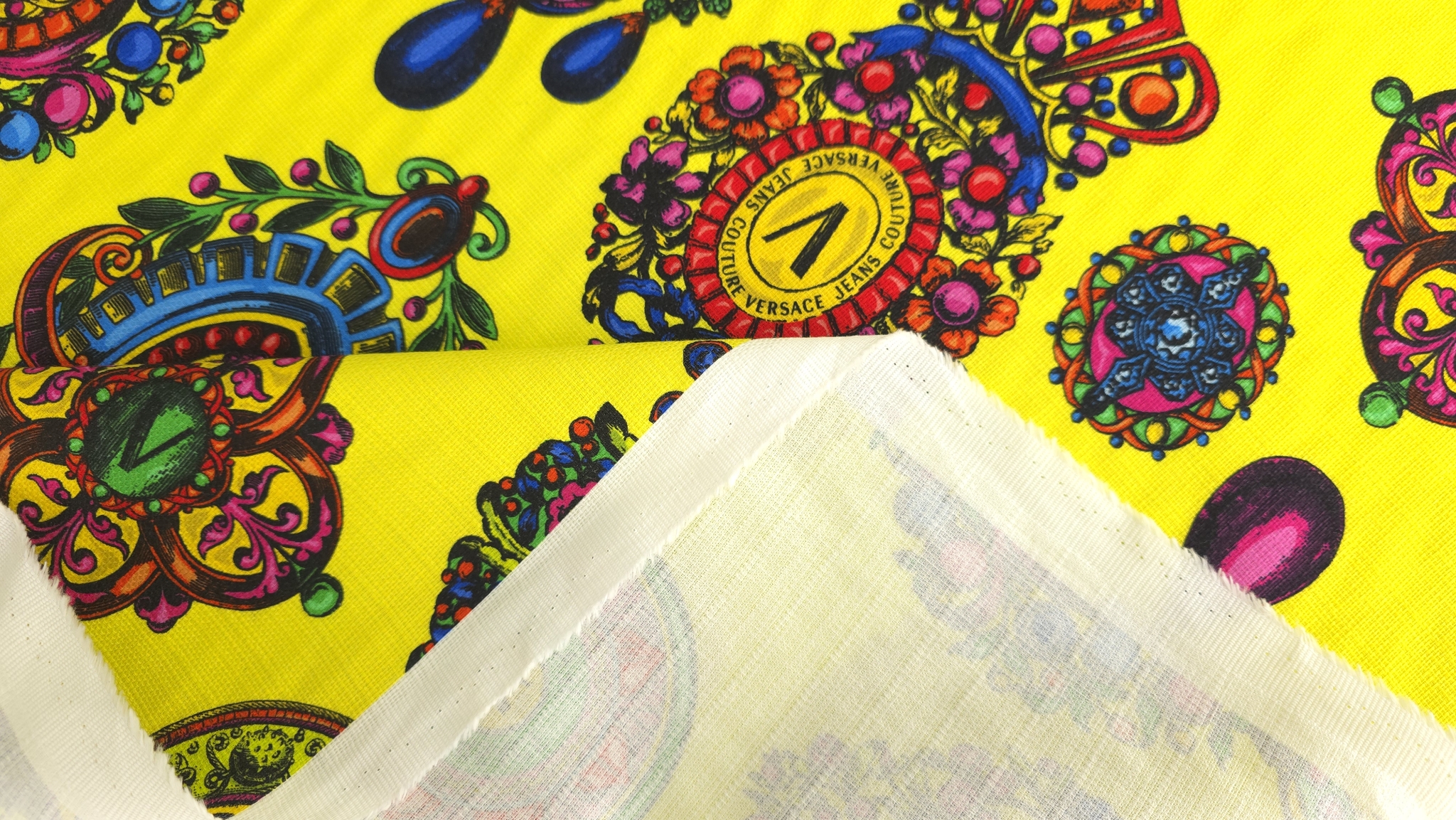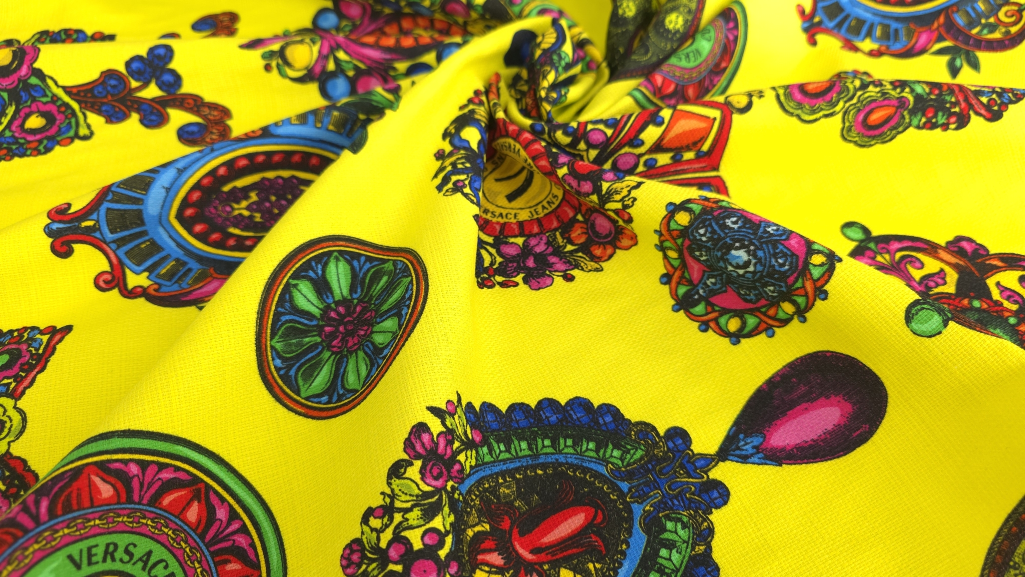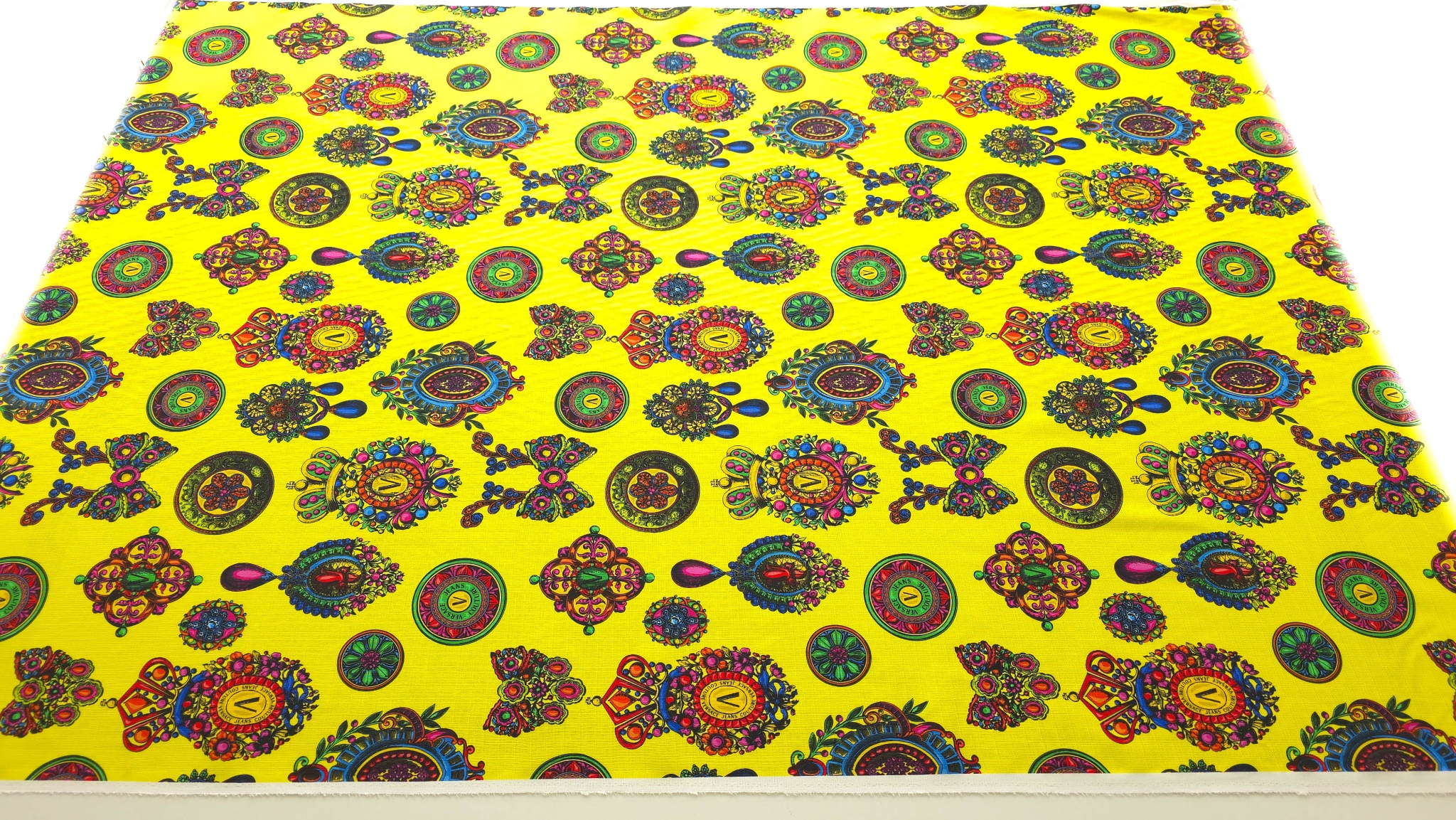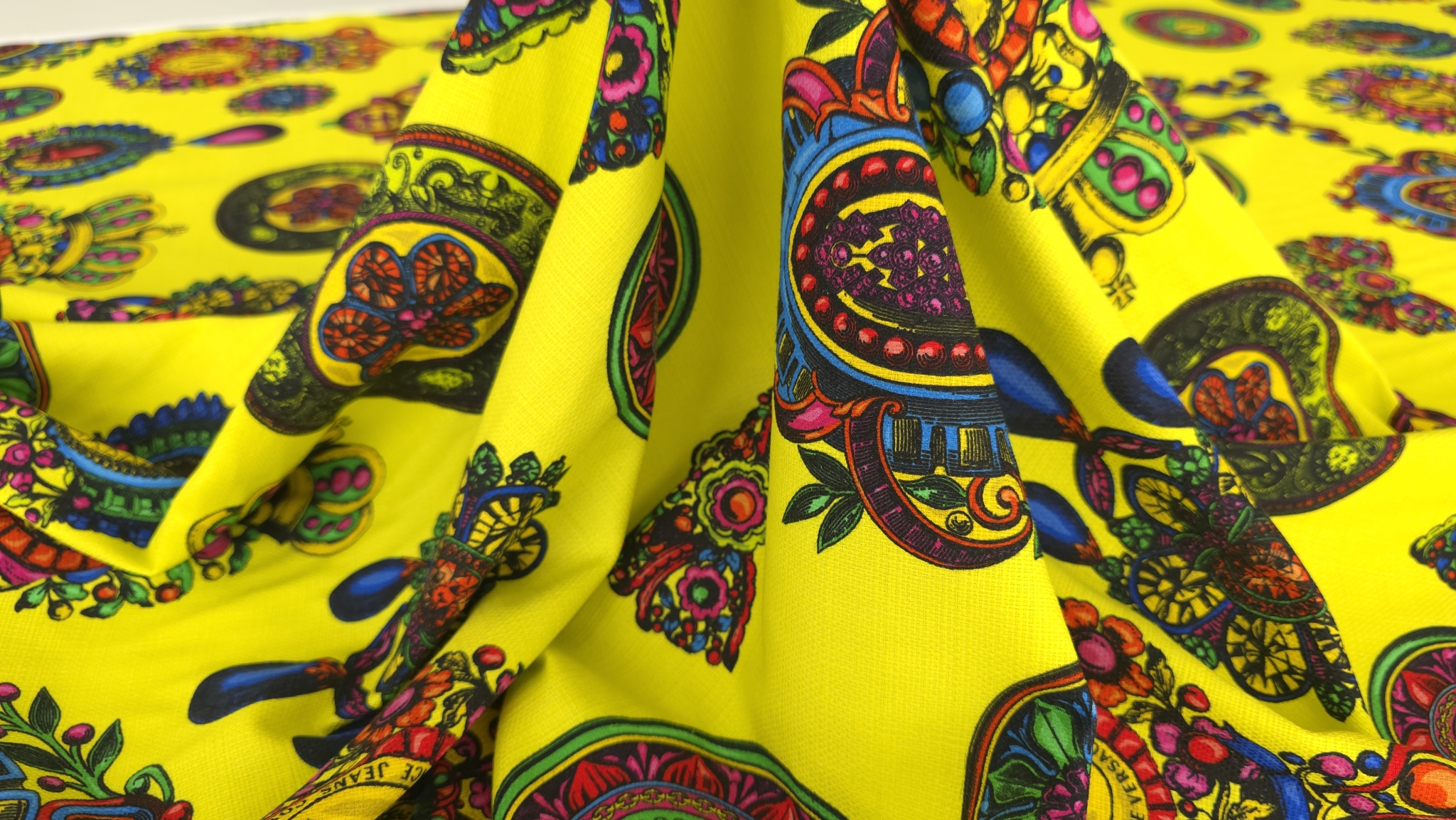 Tesatura bumbac in imprimeu baroc multicolor de inspirație Versace, cu motive ornamentale, cadre grafice și elemente florale stilizate, distribuite dens pe întreaga suprafață. Paleta combină accente de galben, verde, roz, albastru și negru într-o compoziție echilibrată.