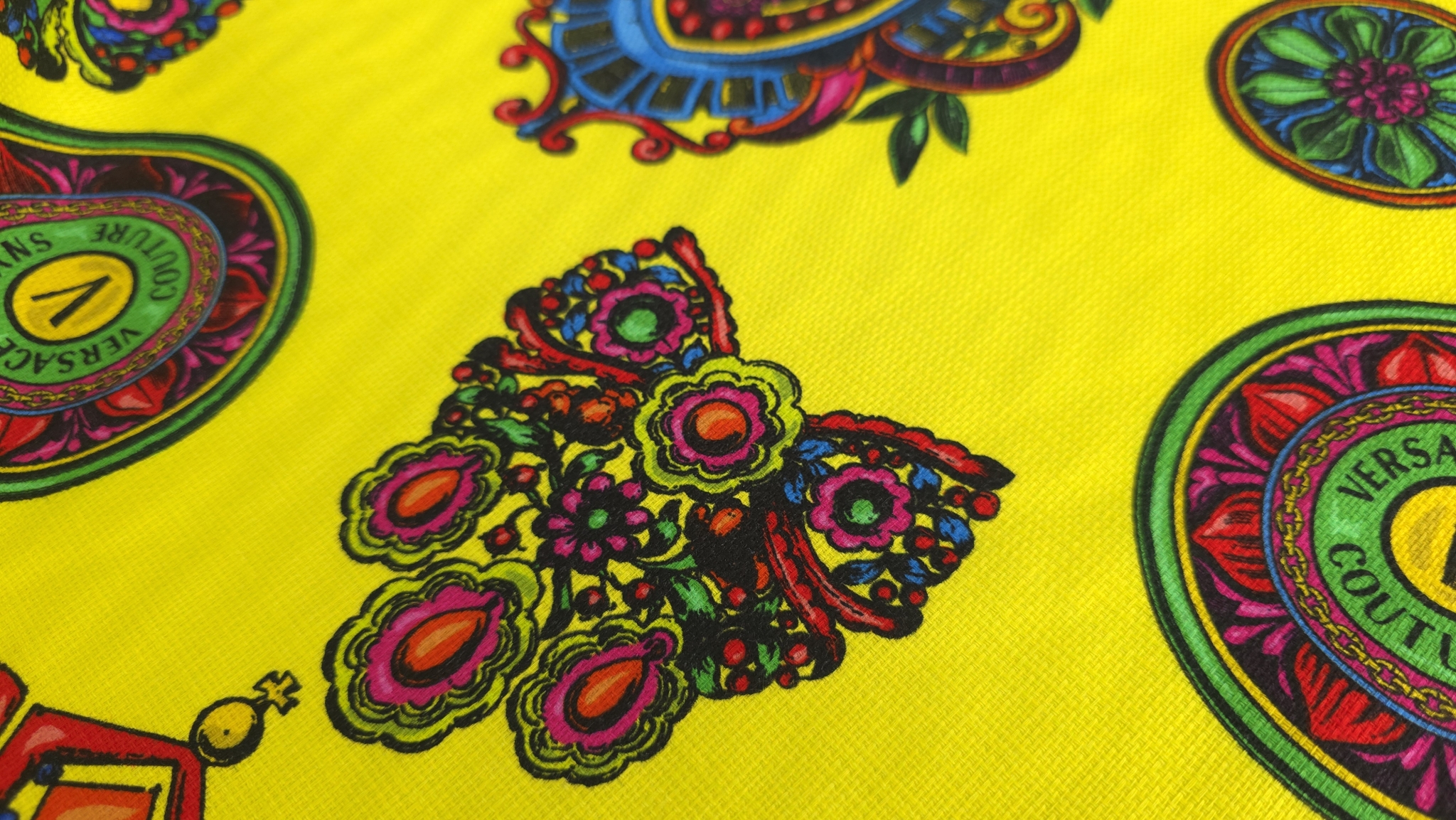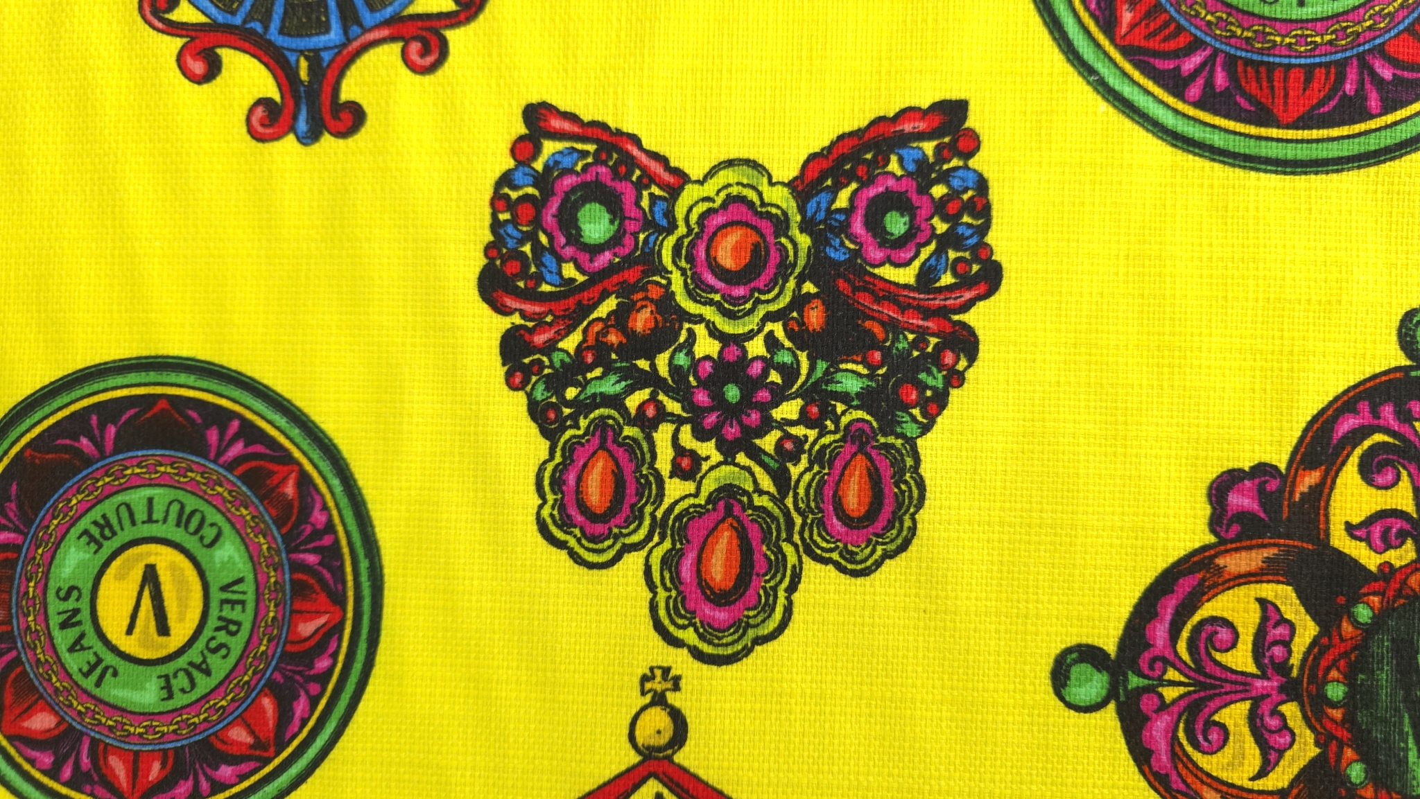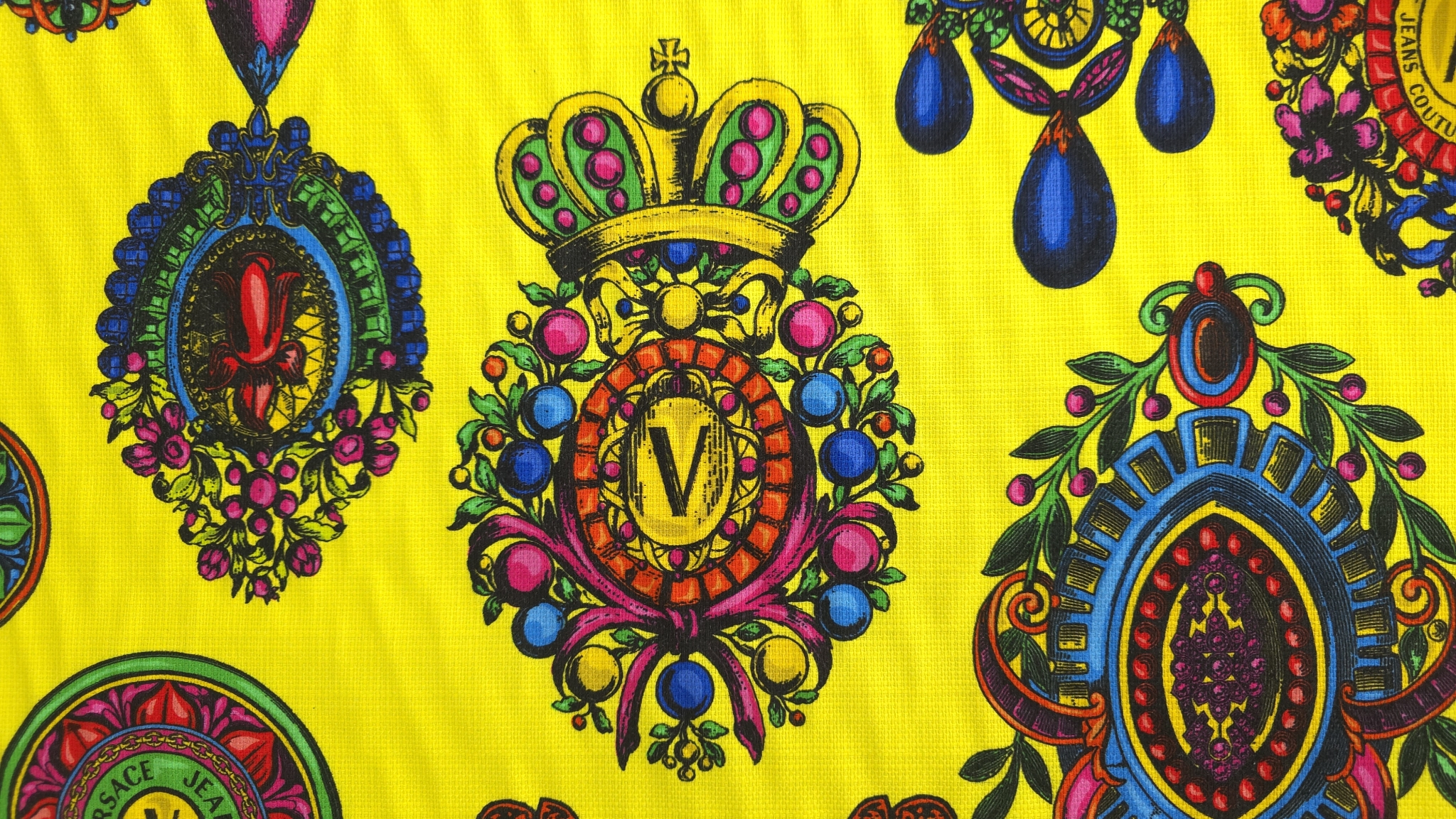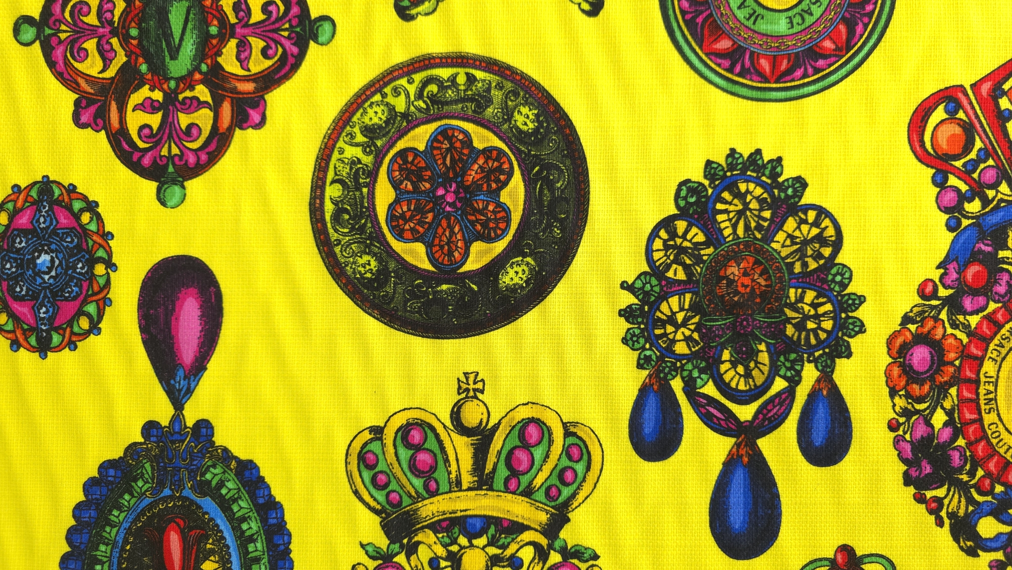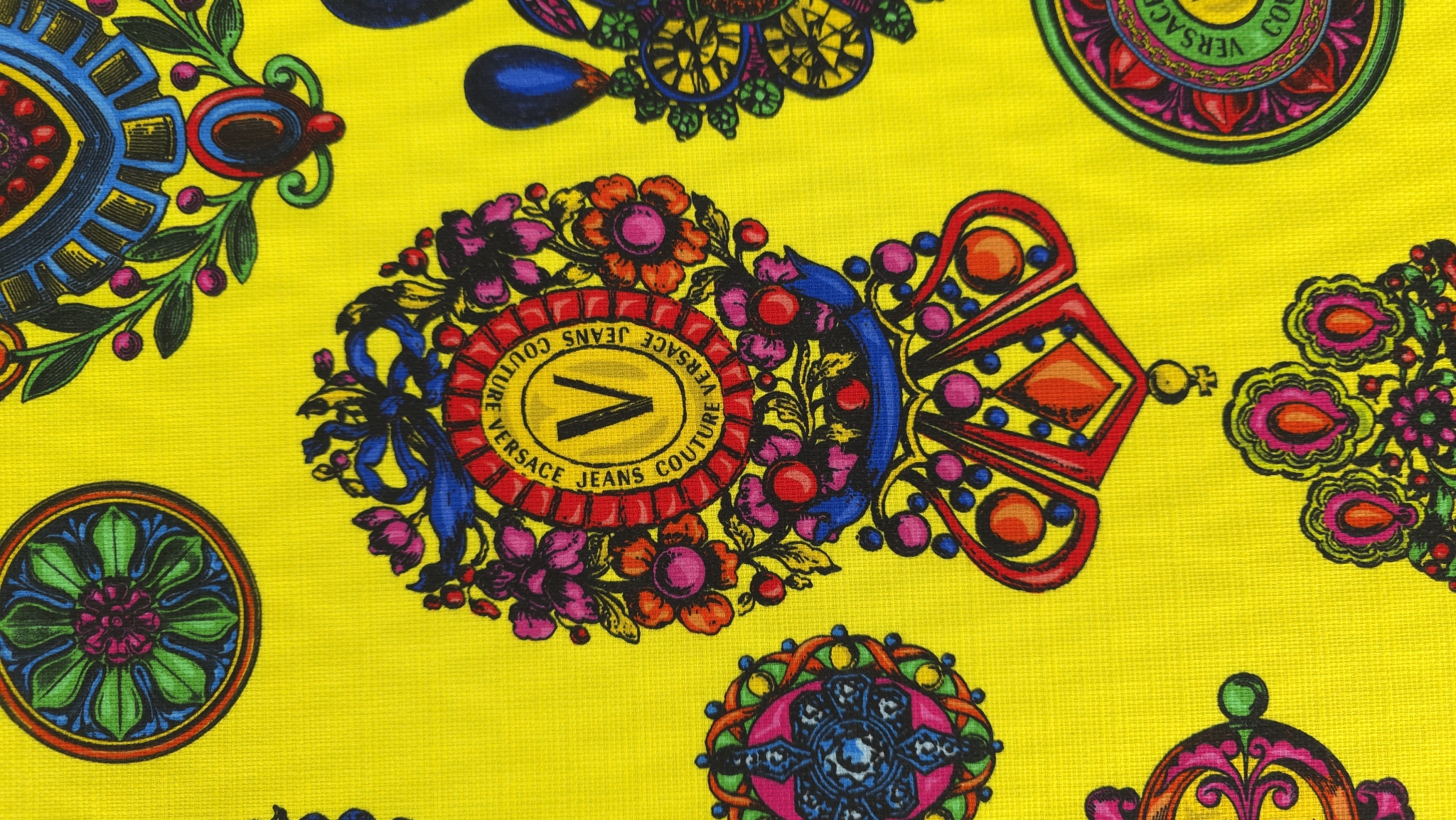 Tesatura bumbac in imprimeu baroc multicolor de inspirație Versace, cu motive ornamentale, cadre grafice și elemente florale stilizate, distribuite dens pe întreaga suprafață. Paleta combină accente de galben, verde, roz, albastru și negru într-o compoziție echilibrată.
