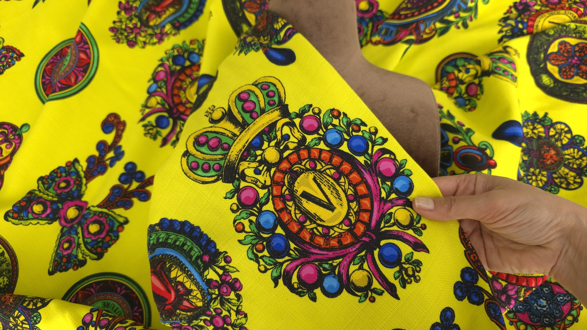 Imprimeul de inspirație Versace aduce un limbaj vizual puternic prin cadre ornamentale și motive grafice vibrante. Această tesatura bumbac in multicolor de designer se desfășoară aerisit pe toată lățimea țesăturii, fiind creată pentru piese vestimentare cu personalitate care pun accent pe detalii stilizate și culori pline de viață.