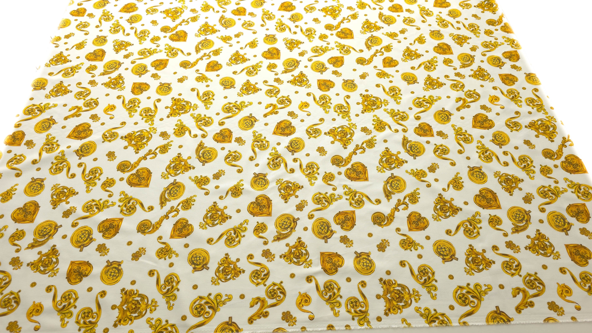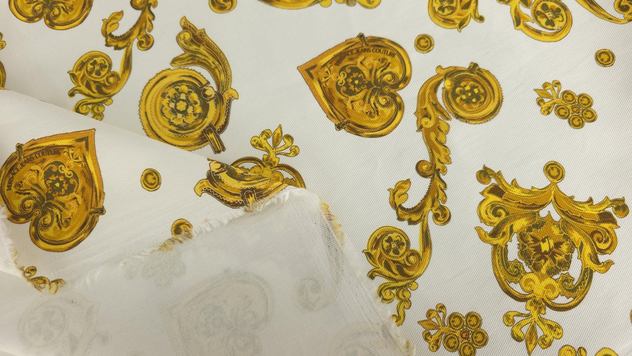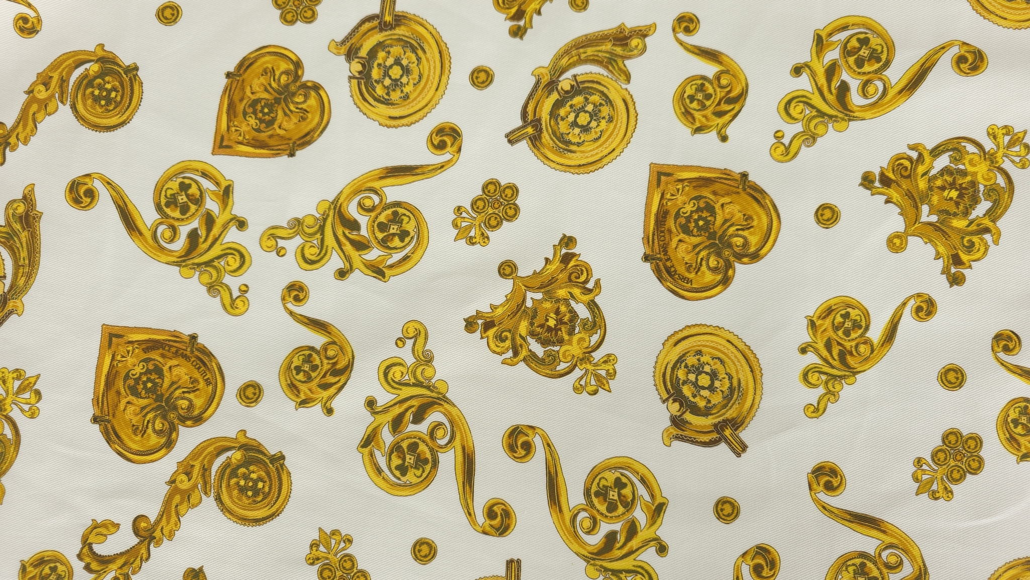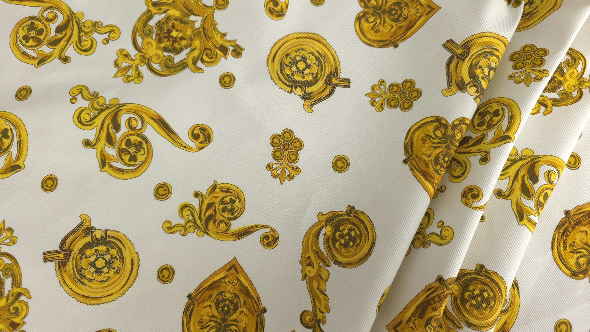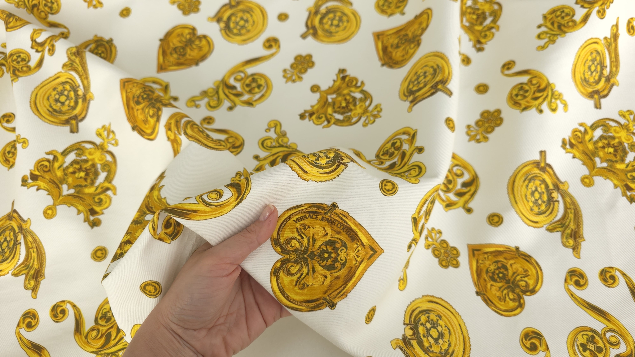 Fondul alb imaculat al acestui white denim bumbac cu imprimeu baroc susține un decor dens cu medalioane aurii și volute ornamentale. Modelul este distribuit ritmic, transformând materialul într-o bază vizuală puternică pentru piese structurate. Este alegerea ideală atunci când designul baroc trebuie să fie elementul central al piesei.