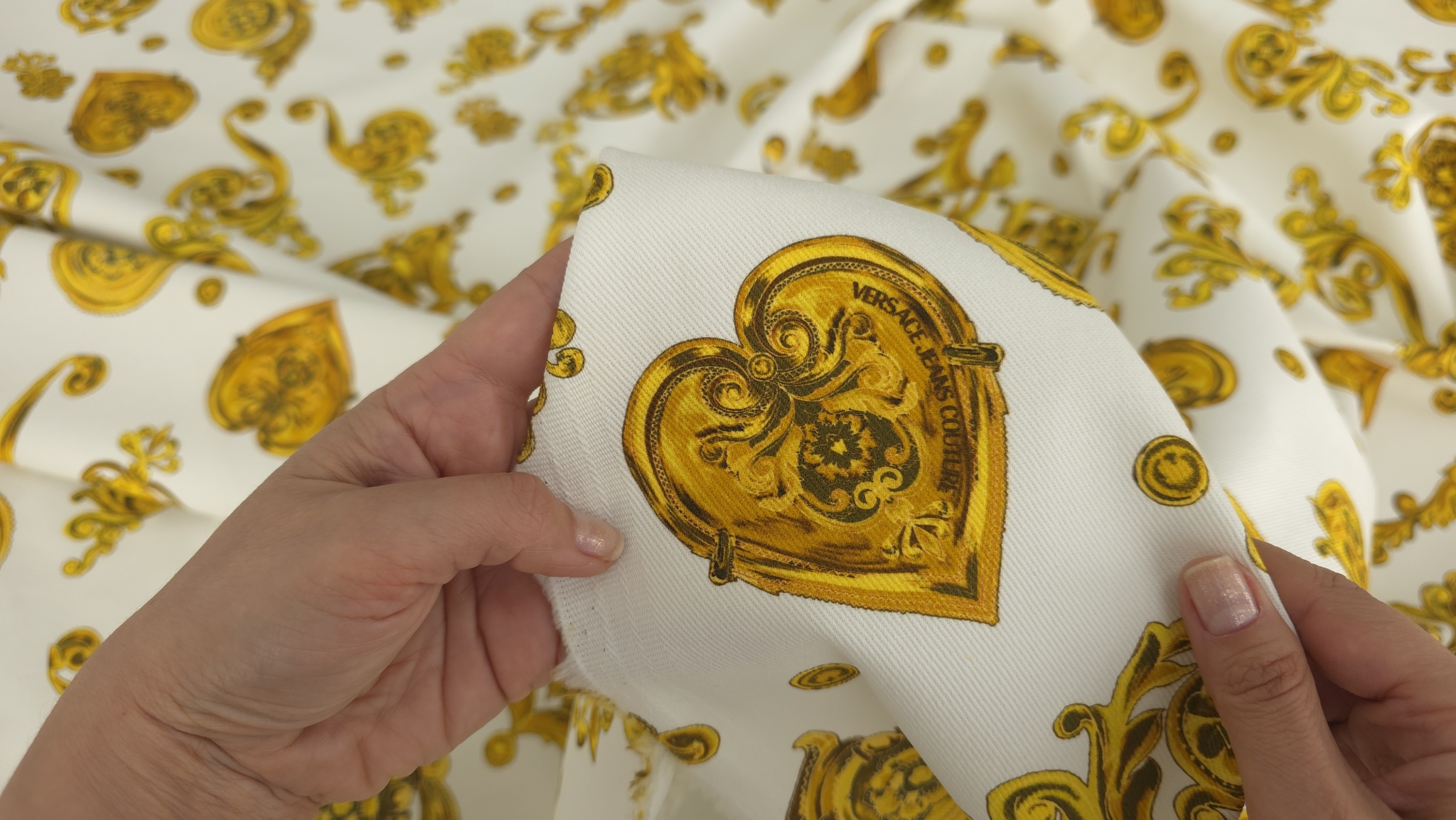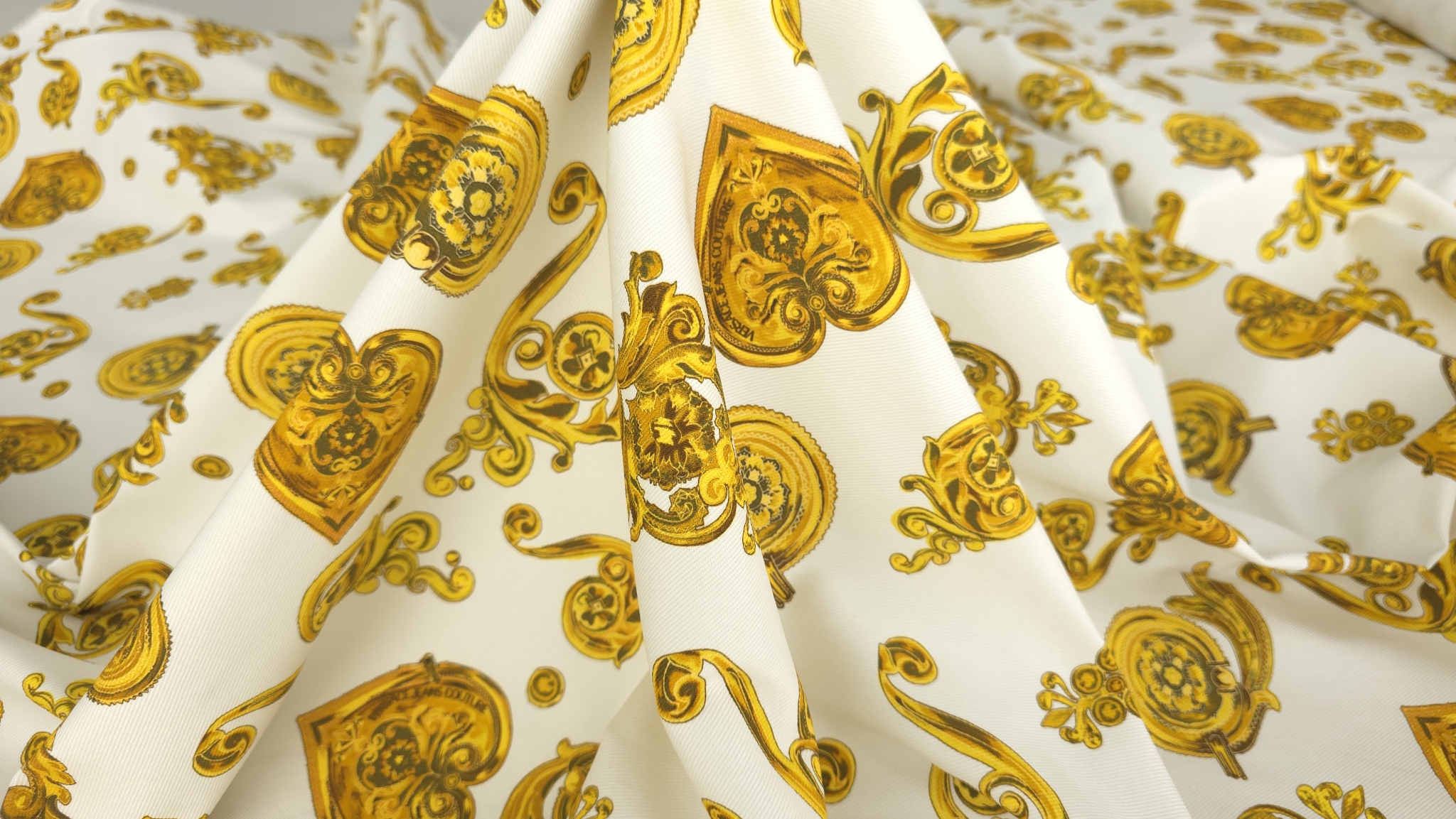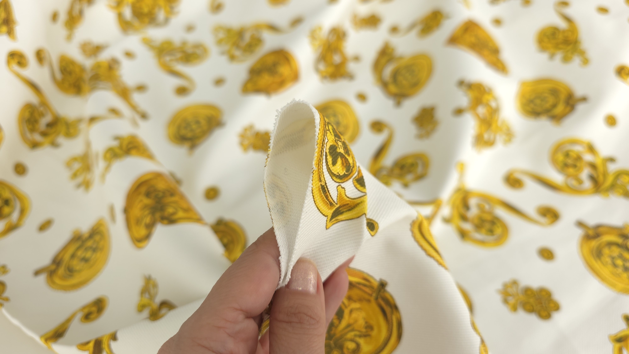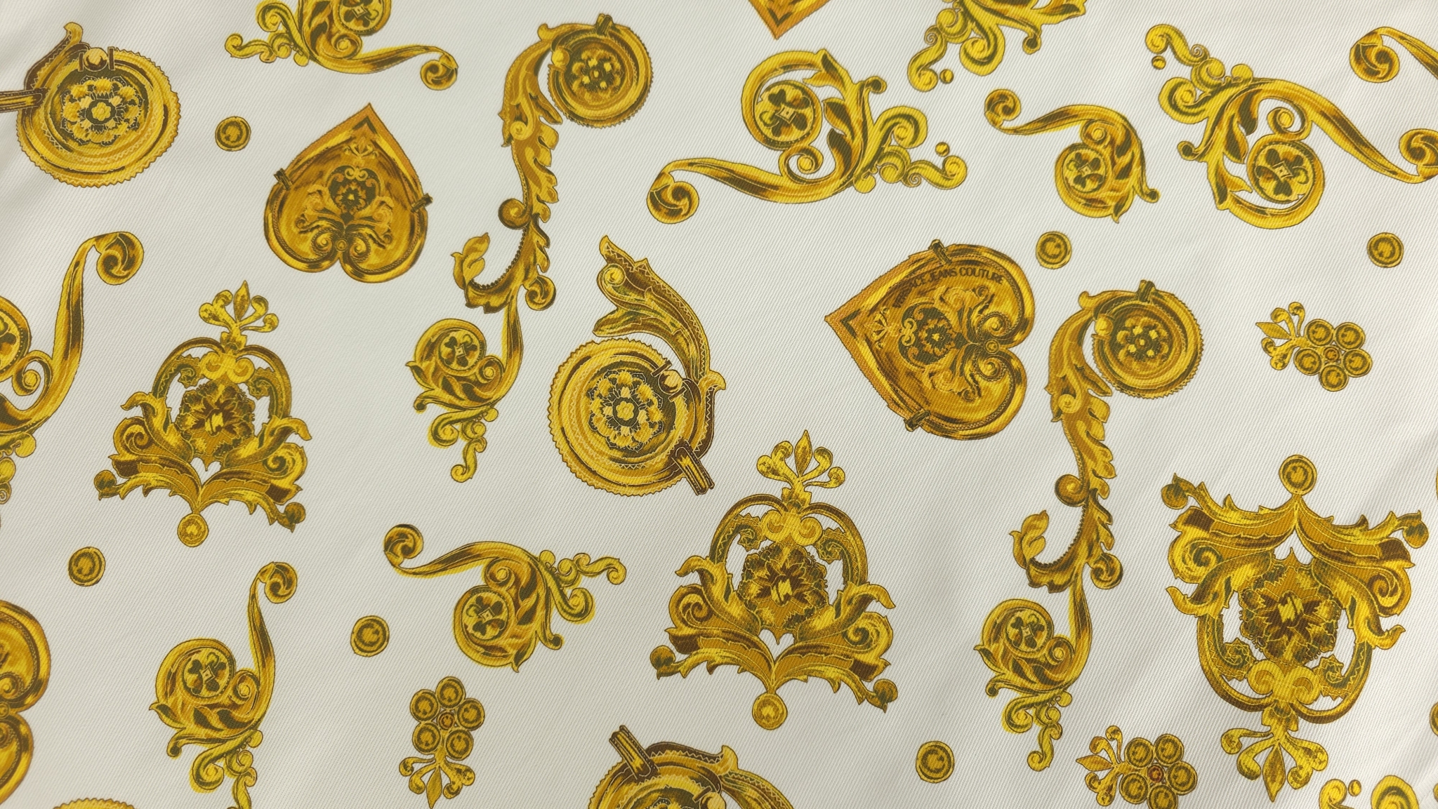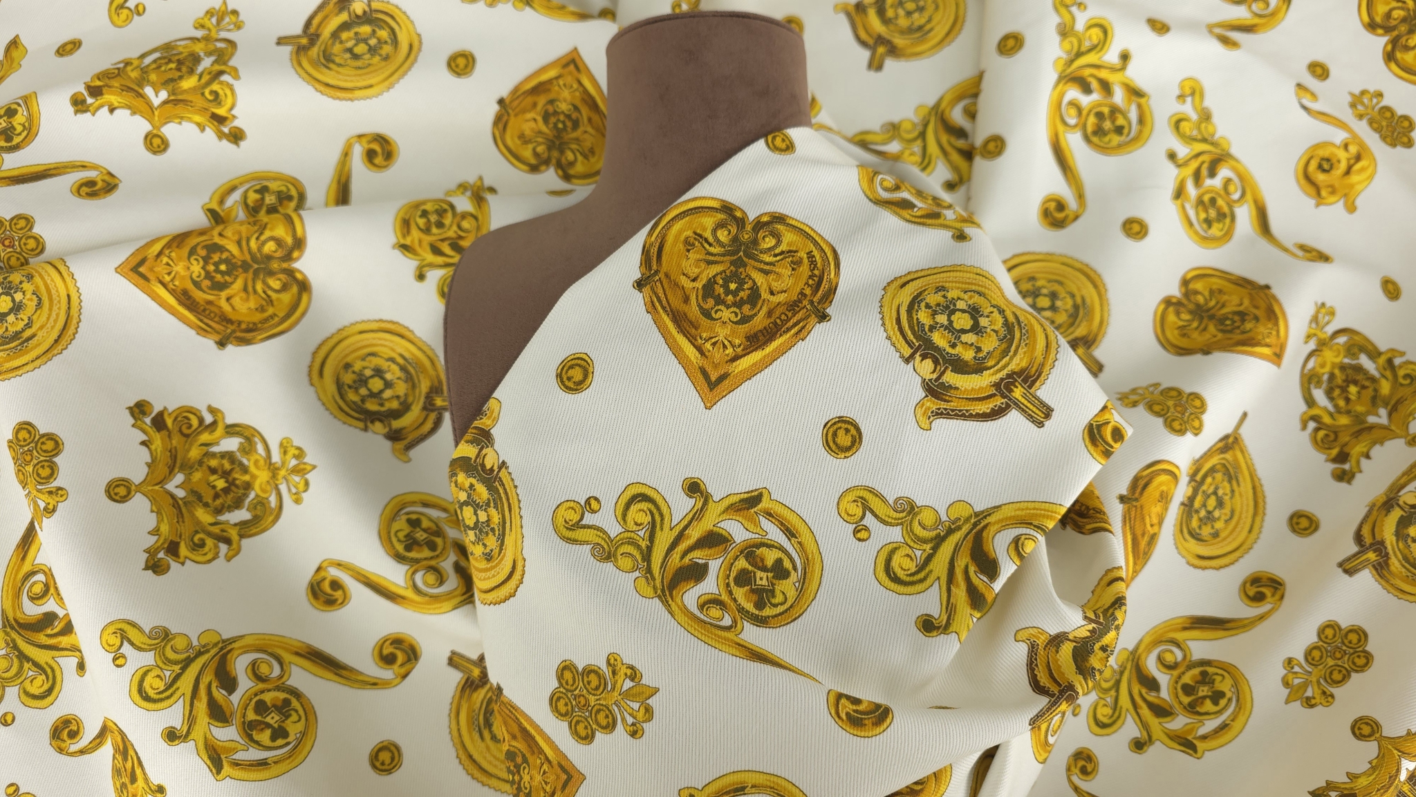 Fondul alb imaculat al acestui white denim bumbac cu imprimeu baroc susține un decor dens cu medalioane aurii și volute ornamentale. Modelul este distribuit ritmic, transformând materialul într-o bază vizuală puternică pentru piese structurate. Este alegerea ideală atunci când designul baroc trebuie să fie elementul central al piesei.