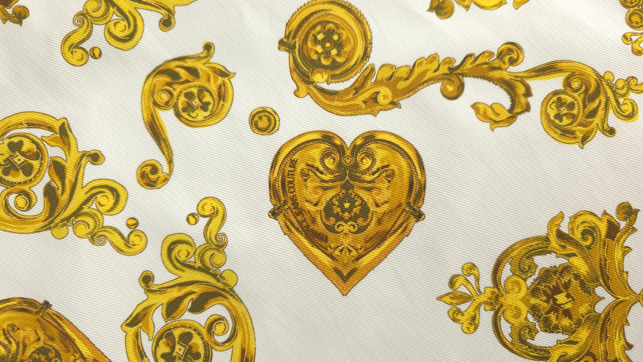 Descriere detaliată – White denim cu imprimeu baroc auriu