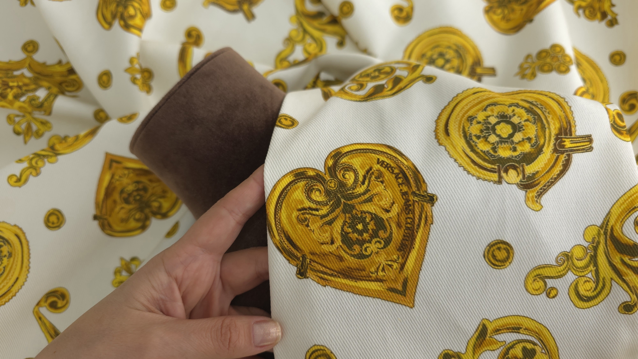 Structura este plină și bine definită, asigurând o cădere fermă care își păstrează forma după croială. Acest denim alb cu model baroc auriu permite realizarea unor linii clare, fiind recomandat pentru jachete sau fuste care necesită stabilitate. Deși dens, bumbacul rămâne maleabil și oferă o ținută curată, fără rigiditate.