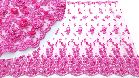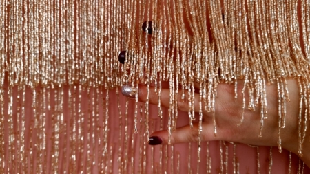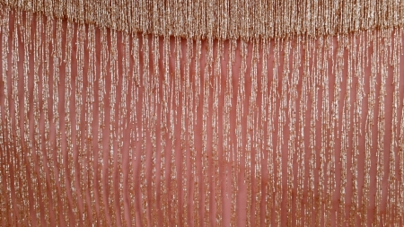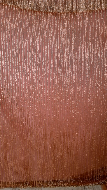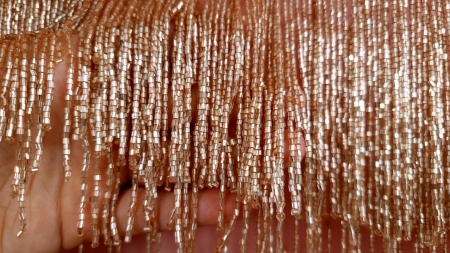 Franjurii din margele tubulare aurii sunt cusuti individual pe suport de tulle rose, putin elastic.