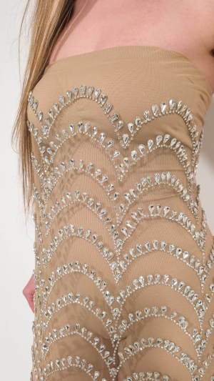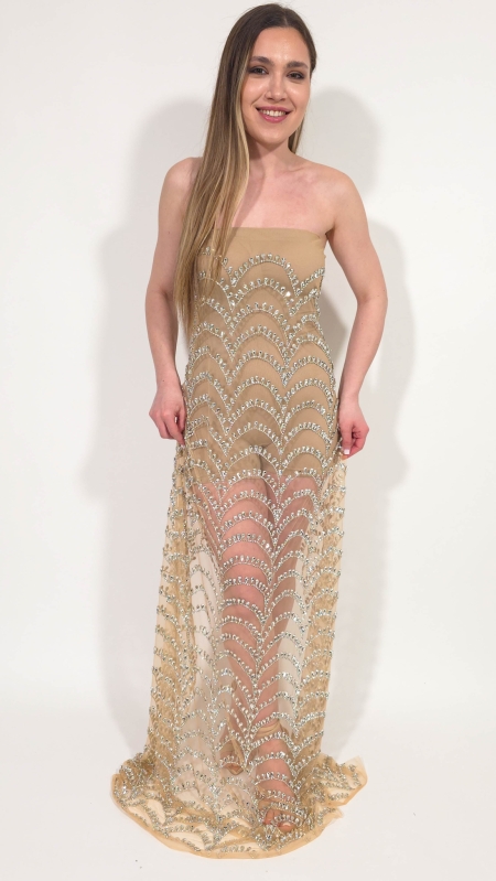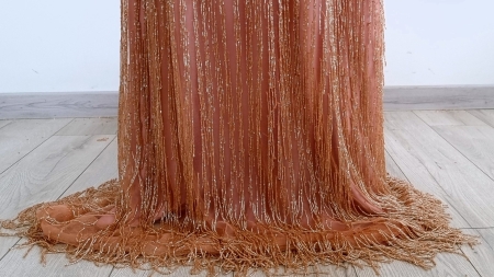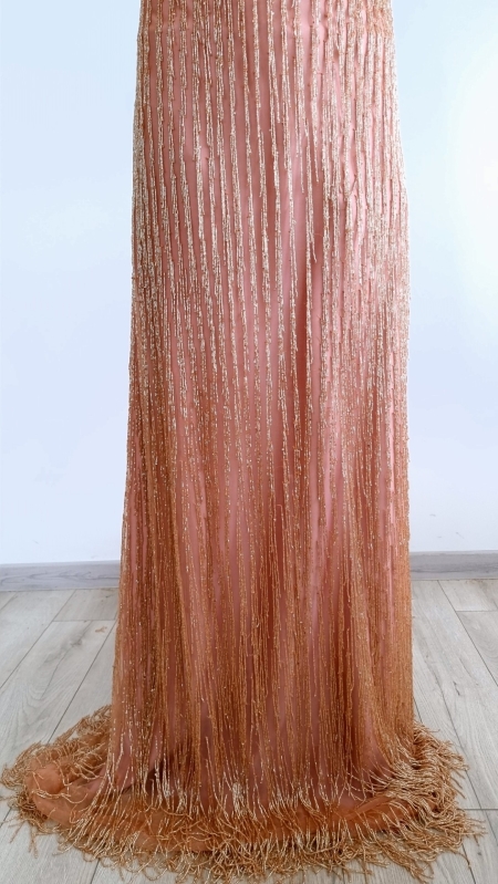 Broderie realizata manual cu franjuri golden rose, realizati din margele tubulare aurii, distribuiti pe intreaga suprafata a tulle-ului.