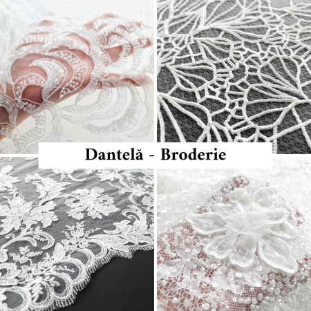 Colectia pentru mirese este categoria dedicată viitoarelor mirese și designerilor care doresc să creeze rochii de vis. Aici vei găsi o selecție rafinată de materiale albe, de la broderii stralucitoare si dantele , stofe elegante și voaluri delicate, până la aplicații și accesorii unice, perfecte pentru personalizarea oricărei rochii de mireasă.