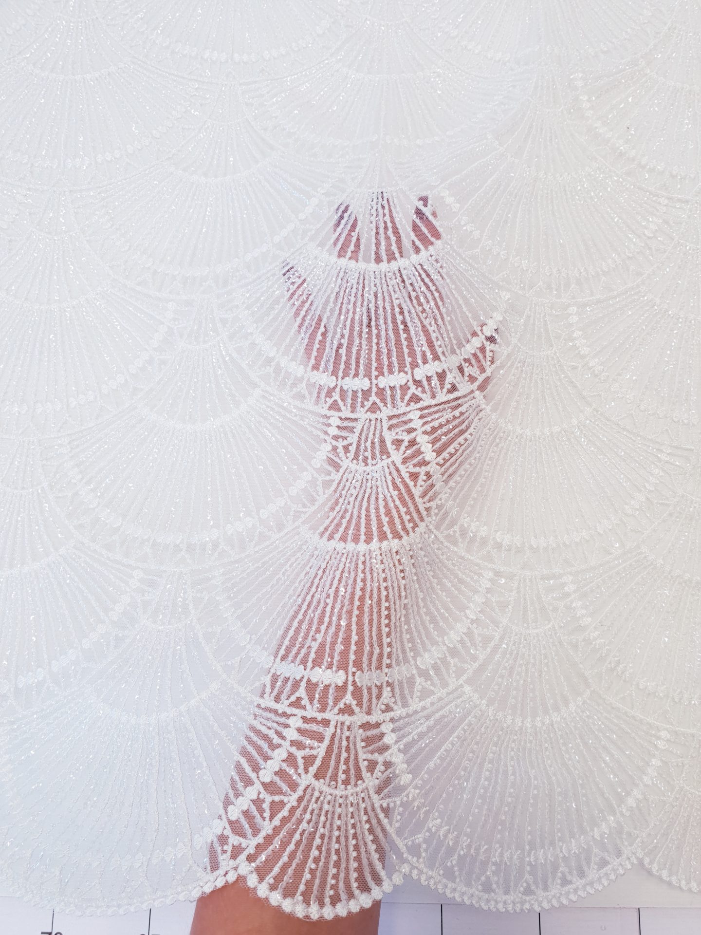 Broderie ivory cu siraguri din margelute si paiete transparente cusute atent pe o baza din bumbac.