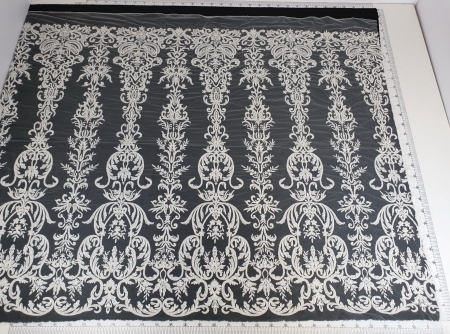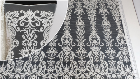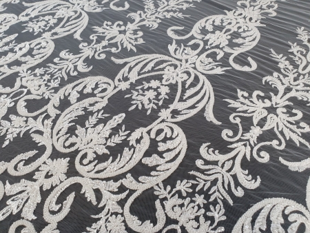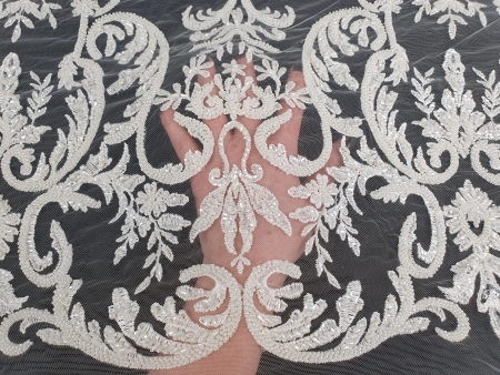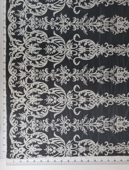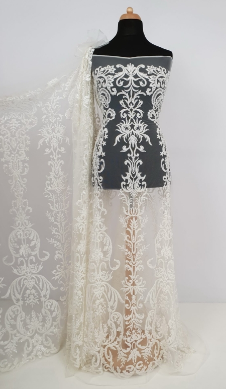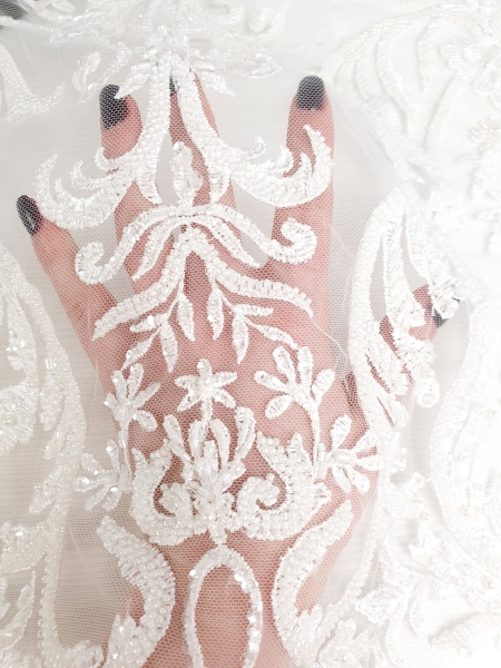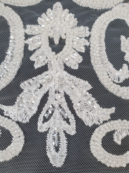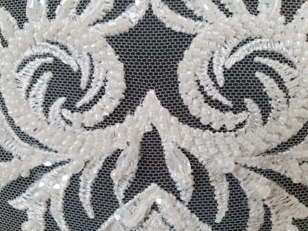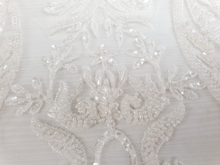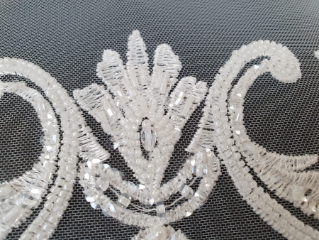 Broderie cu cristale ivory, realizata din margele si paiete cusute pe baza din tul ivory si usor elastic.