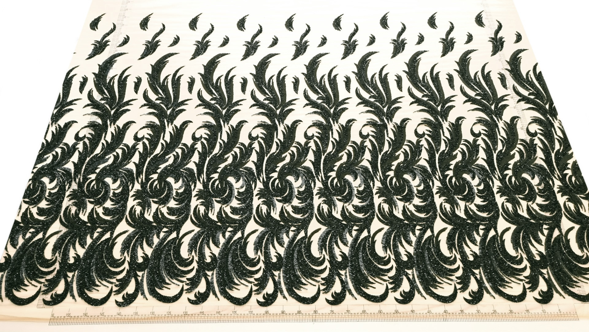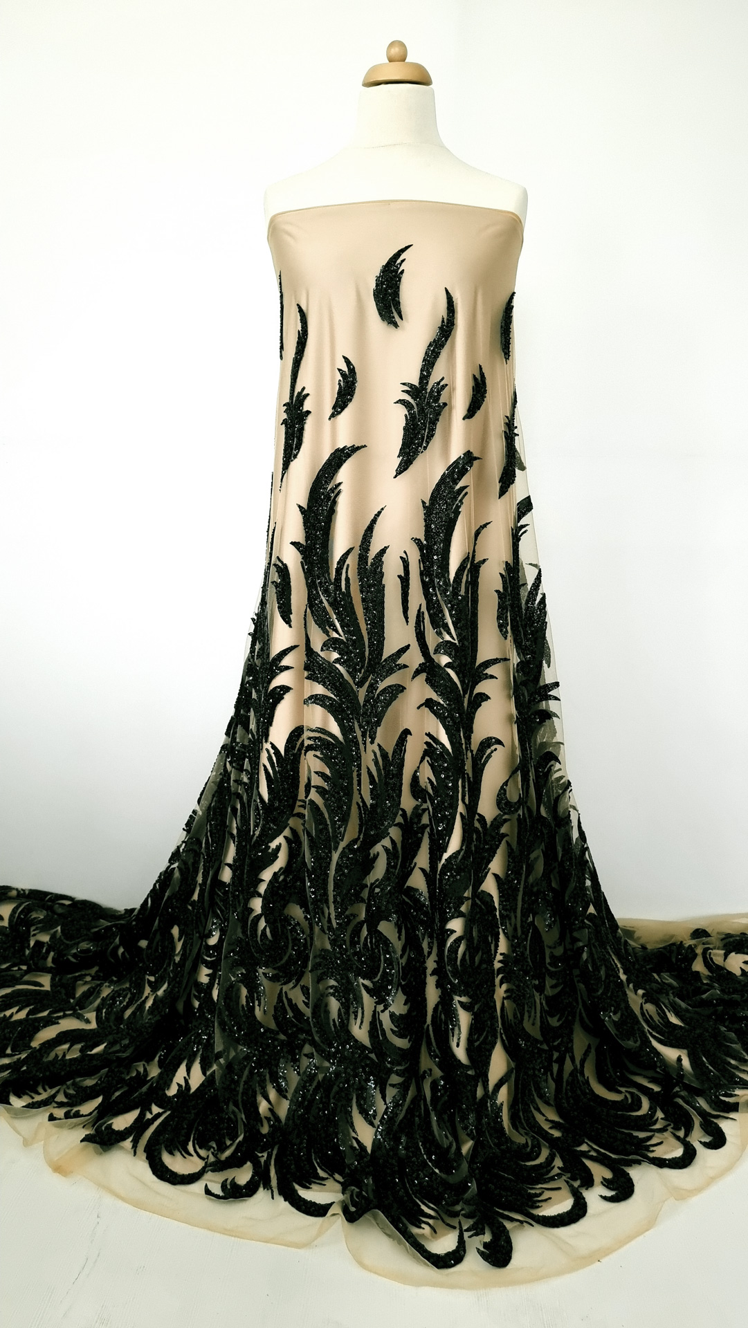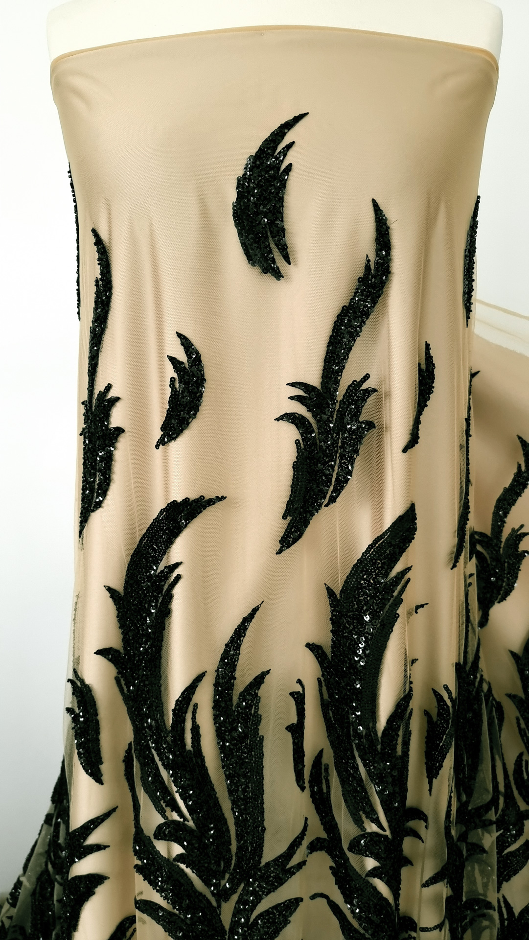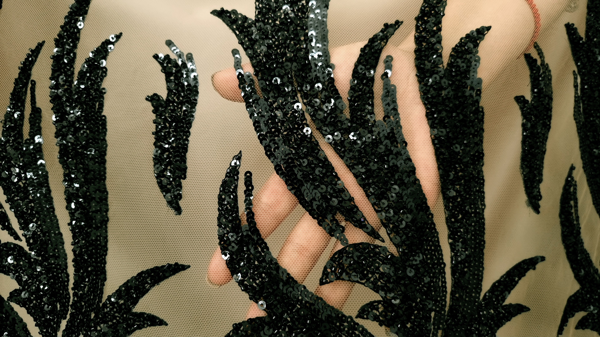 Broderie accesorizata Black Leaves, cu micropaiete si margele tubulare negre, cusute pe tulle nude, usor elastic.