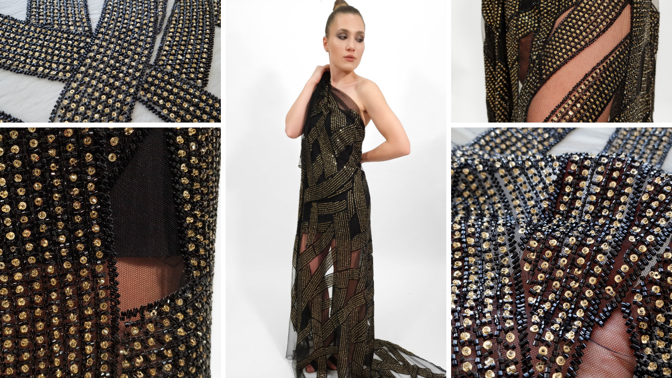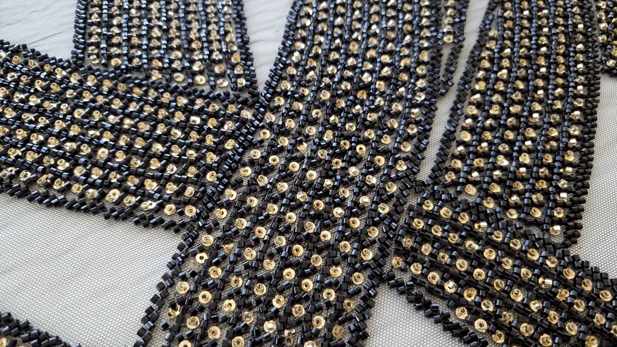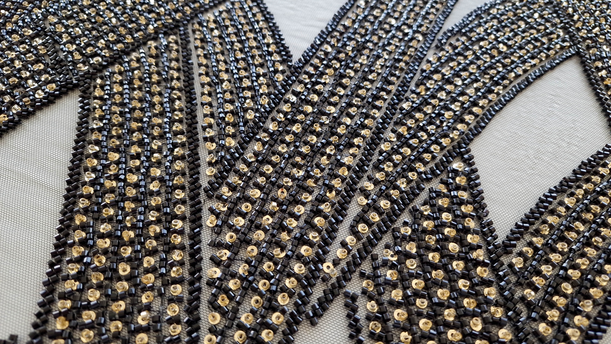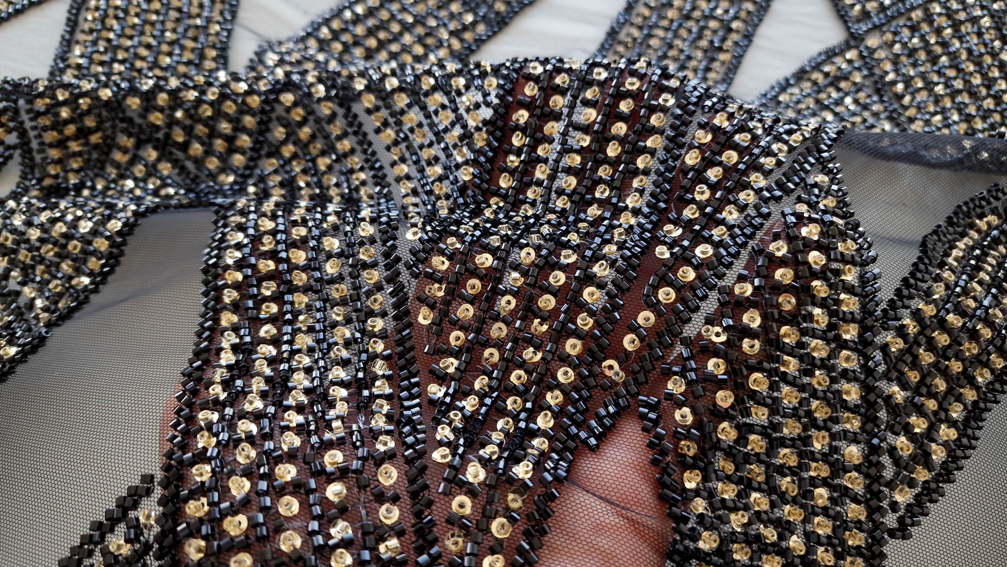 Broderie black gold pe tulle negru , decorată cu mărgele si micropaiete în nuanțe negru si auriu cusute pe tulle negru usor elastic. Fiecare detaliu al broderiei transformă orice ținută într-o operă de artă autentică. Microaietele strălucesc delicat, captând lumina și creând reflexii care adaugă eleganță. Mărgelele, atent selectate și plasate, aduc o notă de rafinament și complexitate. Această piesă emană feminitate și rafinament, fiind perfectă pentru ocazii speciale unde se dorește un look deosebit și memorabil.