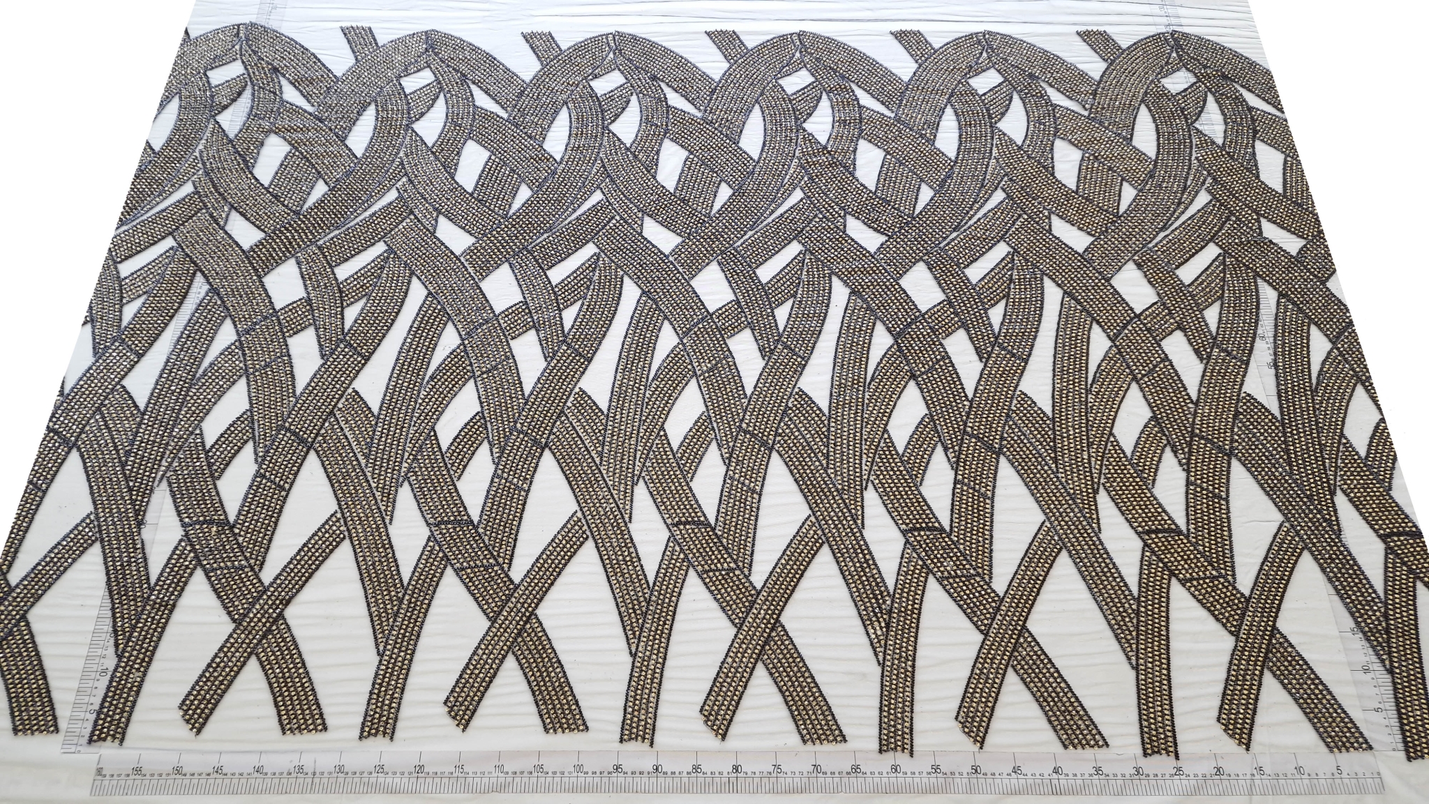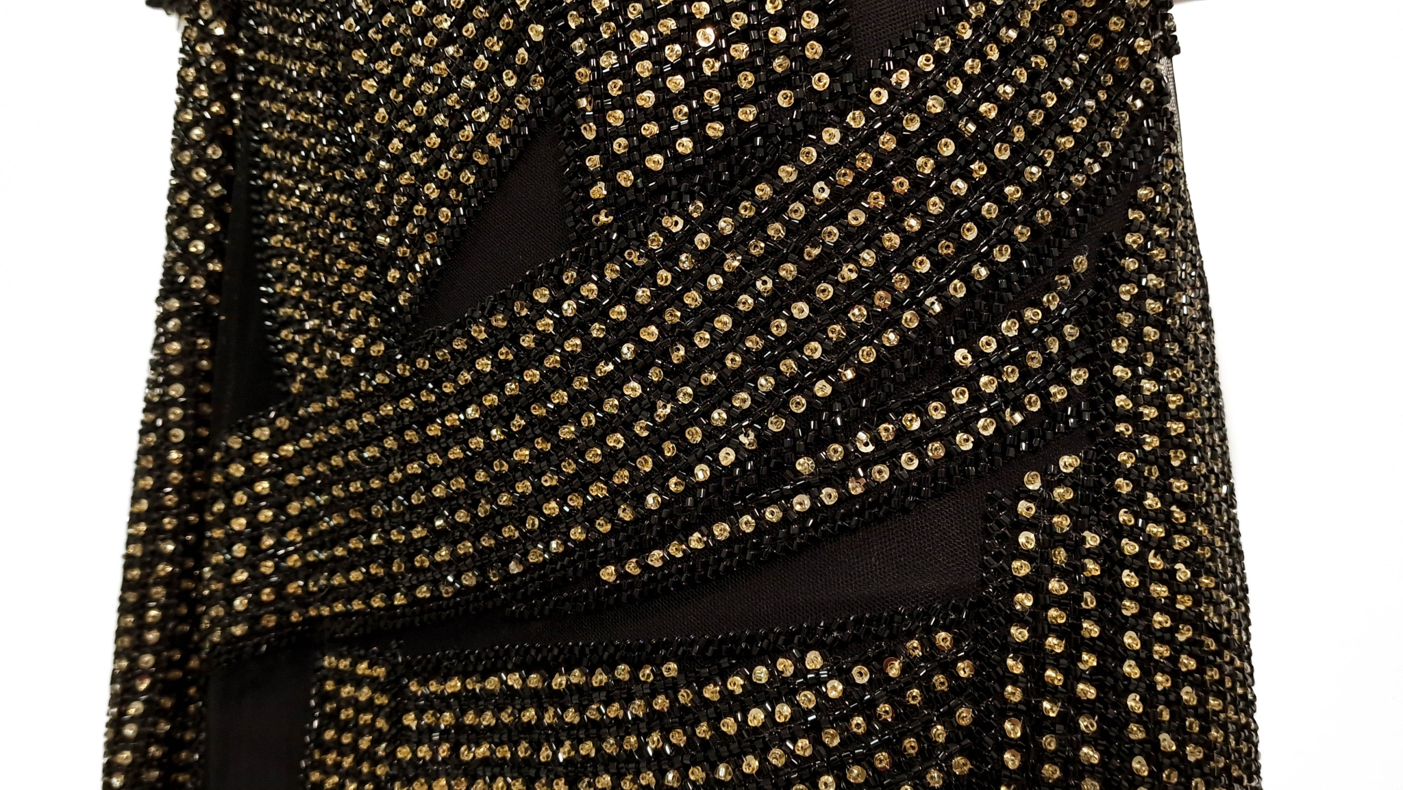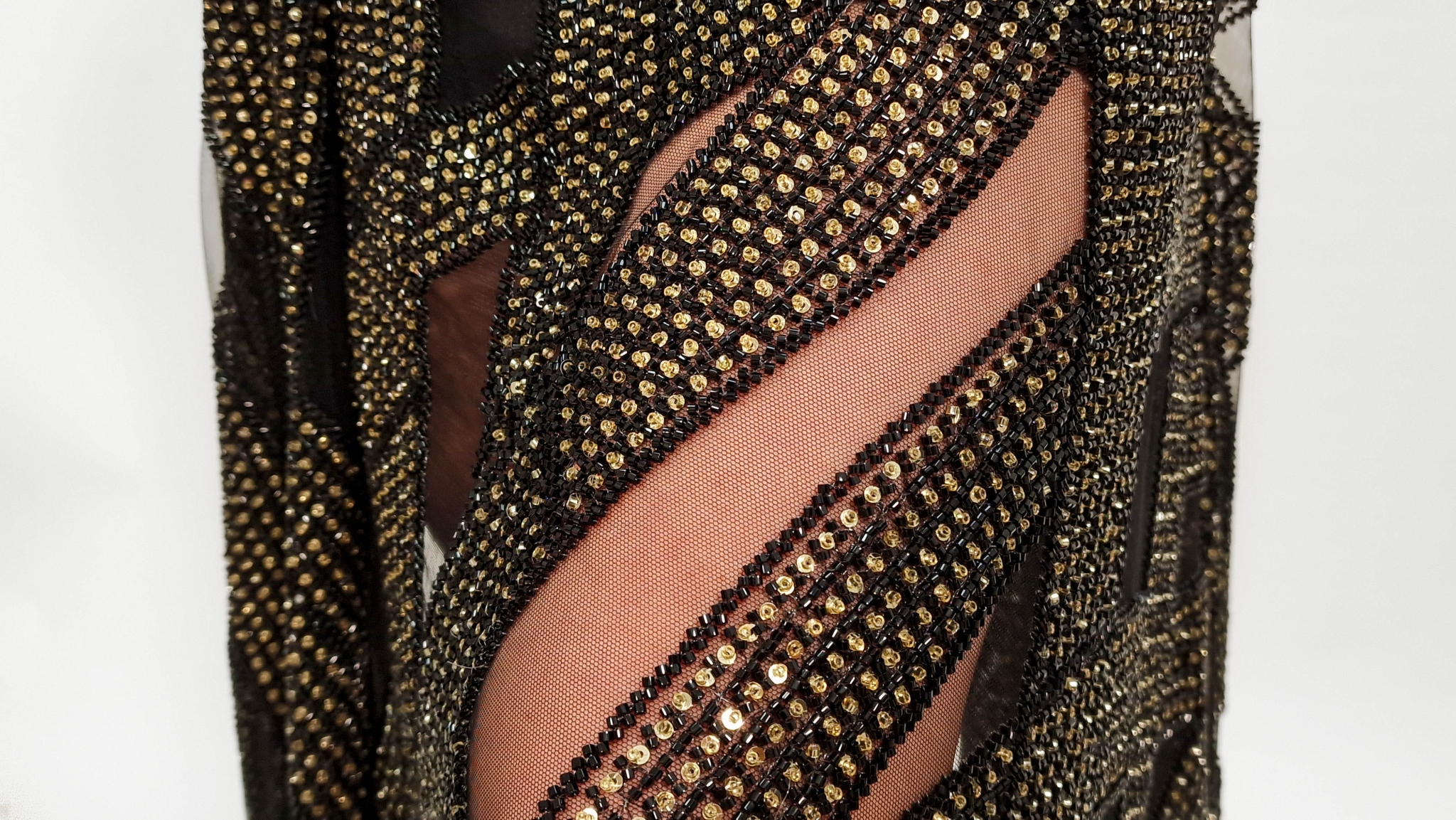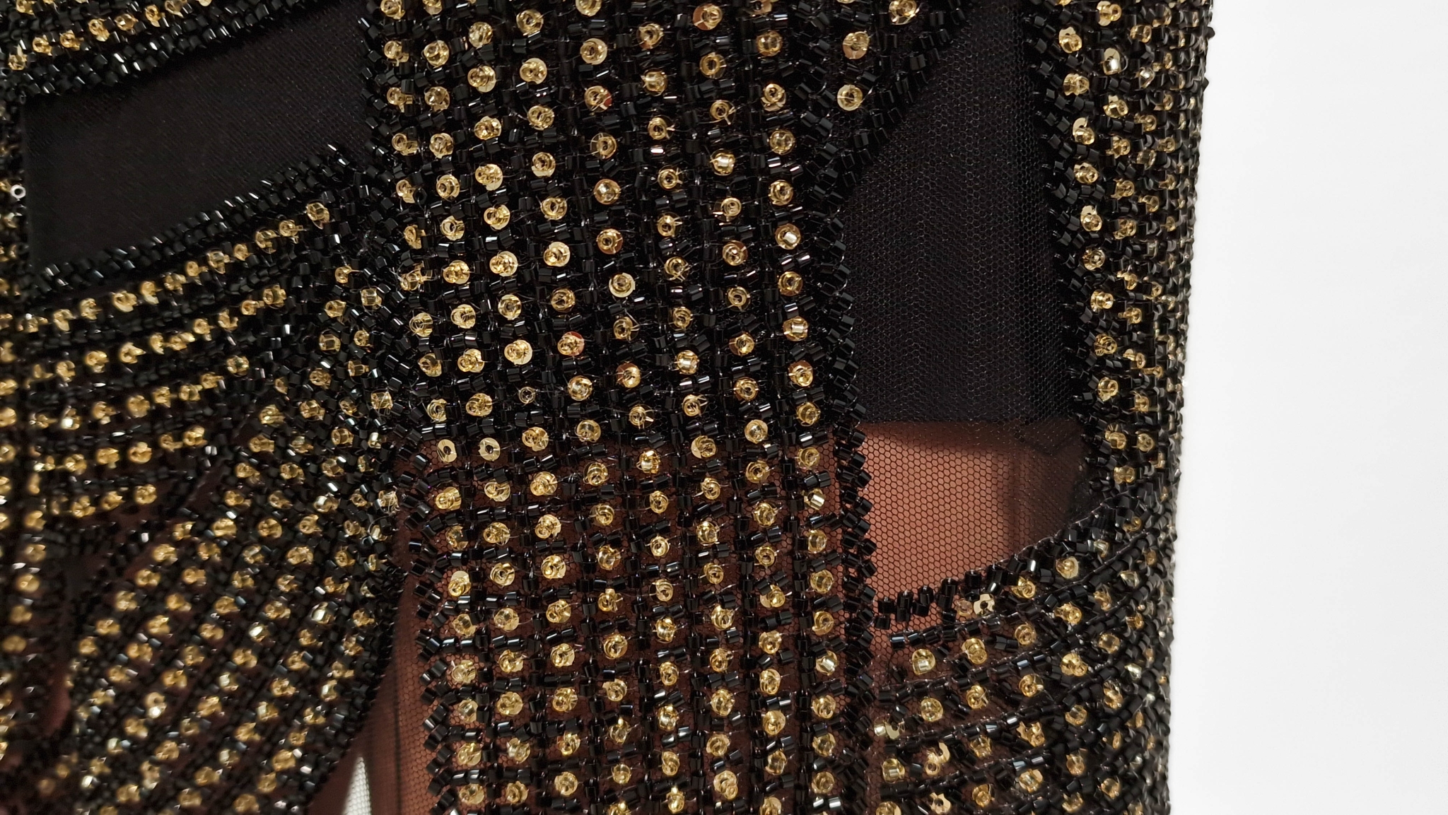 Broderie black gold pe tulle negru , decorată cu mărgele si micropaiete în nuanțe negru si auriu cusute pe tulle negru usor elastic. Fiecare detaliu al broderiei transformă orice ținută într-o operă de artă autentică. Microaietele strălucesc delicat, captând lumina și creând reflexii care adaugă eleganță. Mărgelele, atent selectate și plasate, aduc o notă de rafinament și complexitate. Această piesă emană feminitate și rafinament, fiind perfectă pentru ocazii speciale unde se dorește un look deosebit și memorabil.