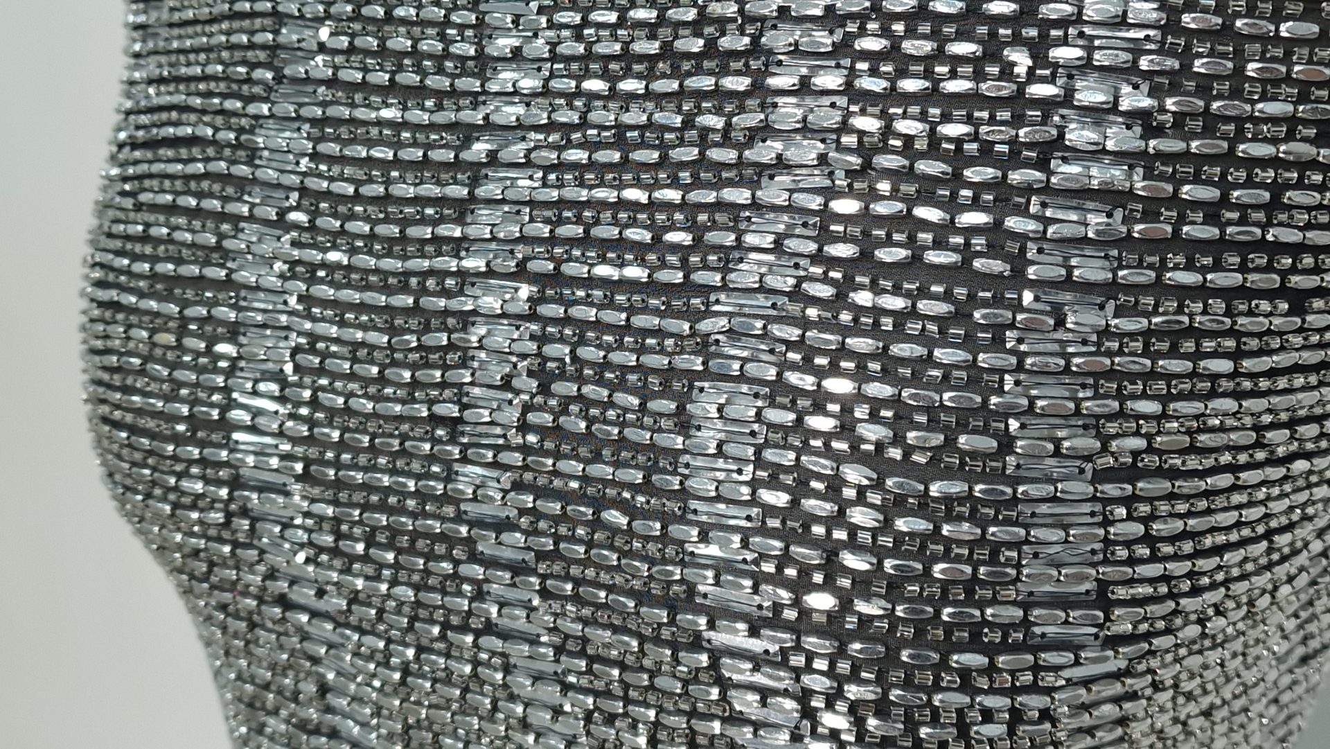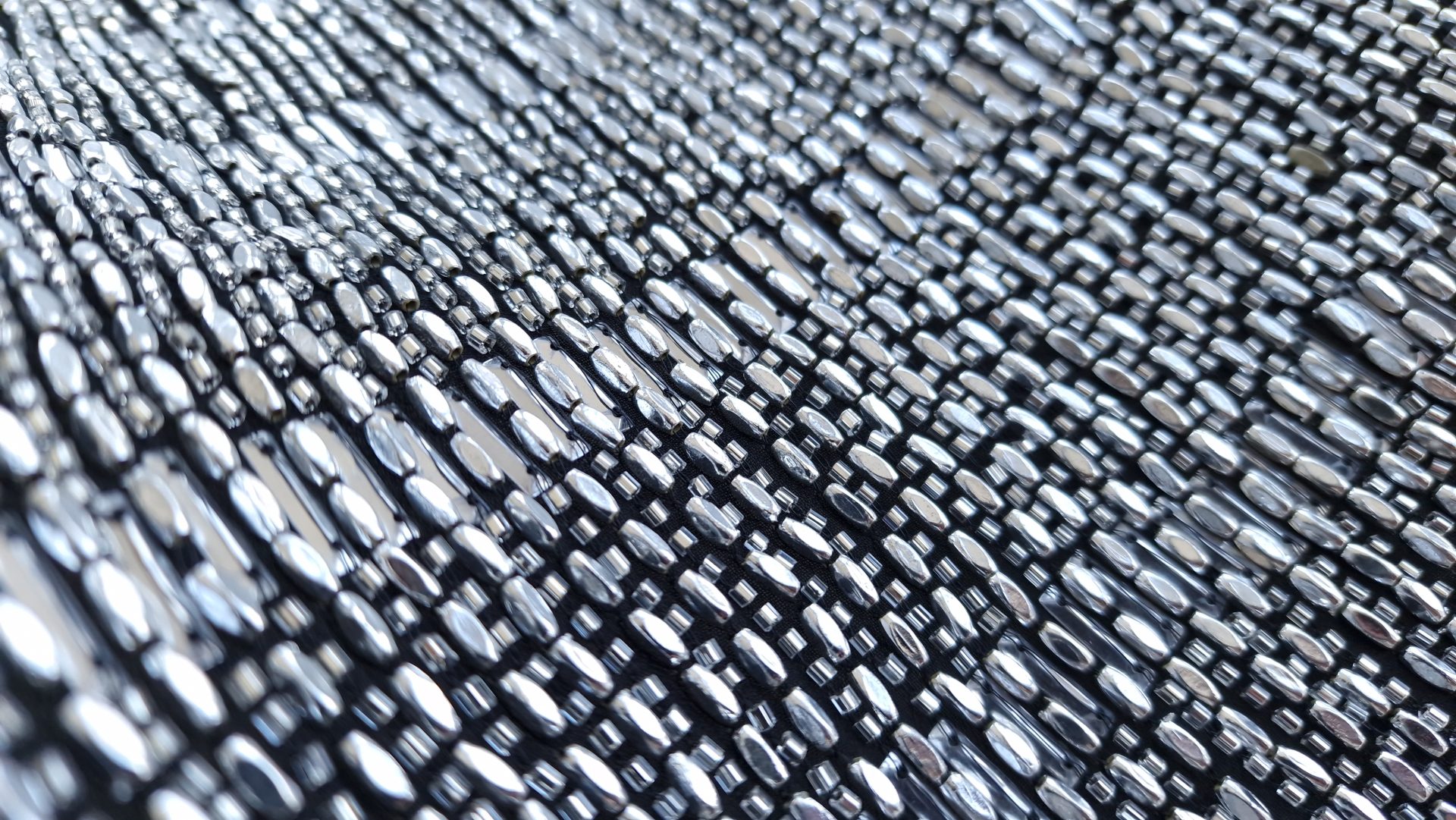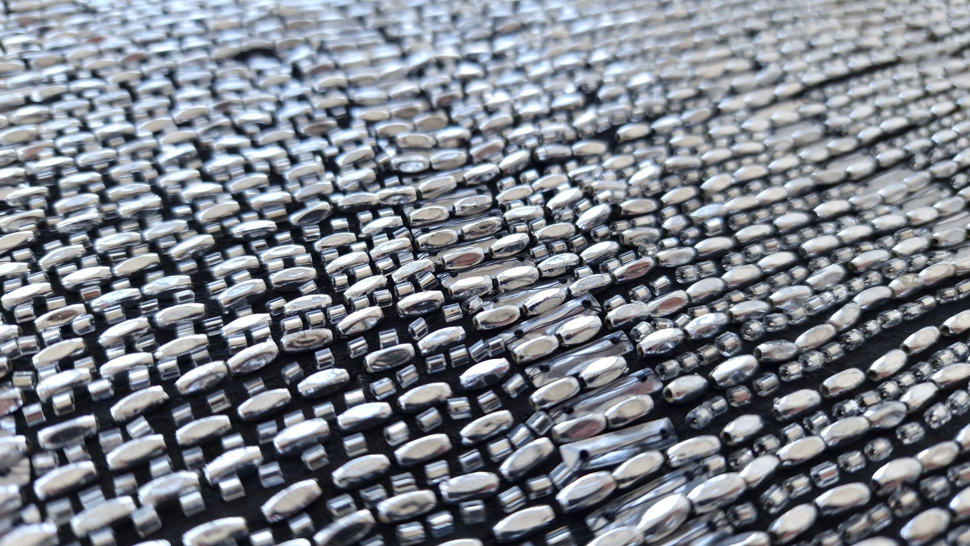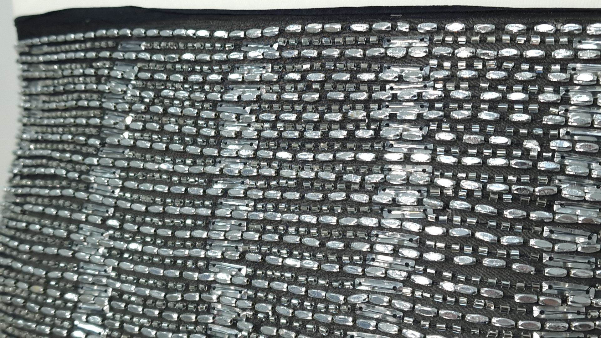 Broderia este accesorizata manual cu margelute argintii de diferite dimensiuni cusute pe baza din voal Georgette negru, din vascoza, usor elastic.