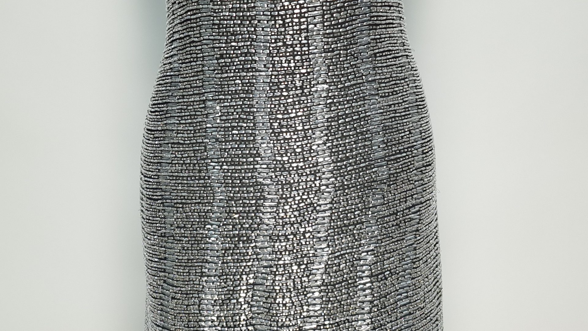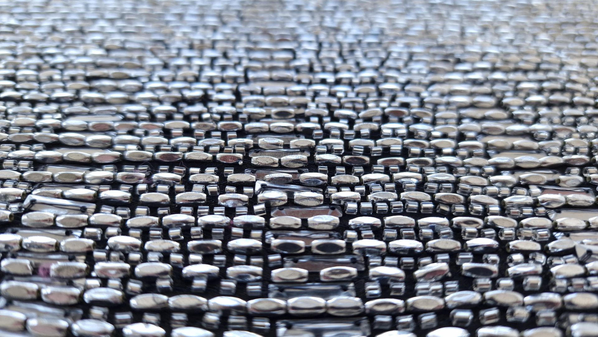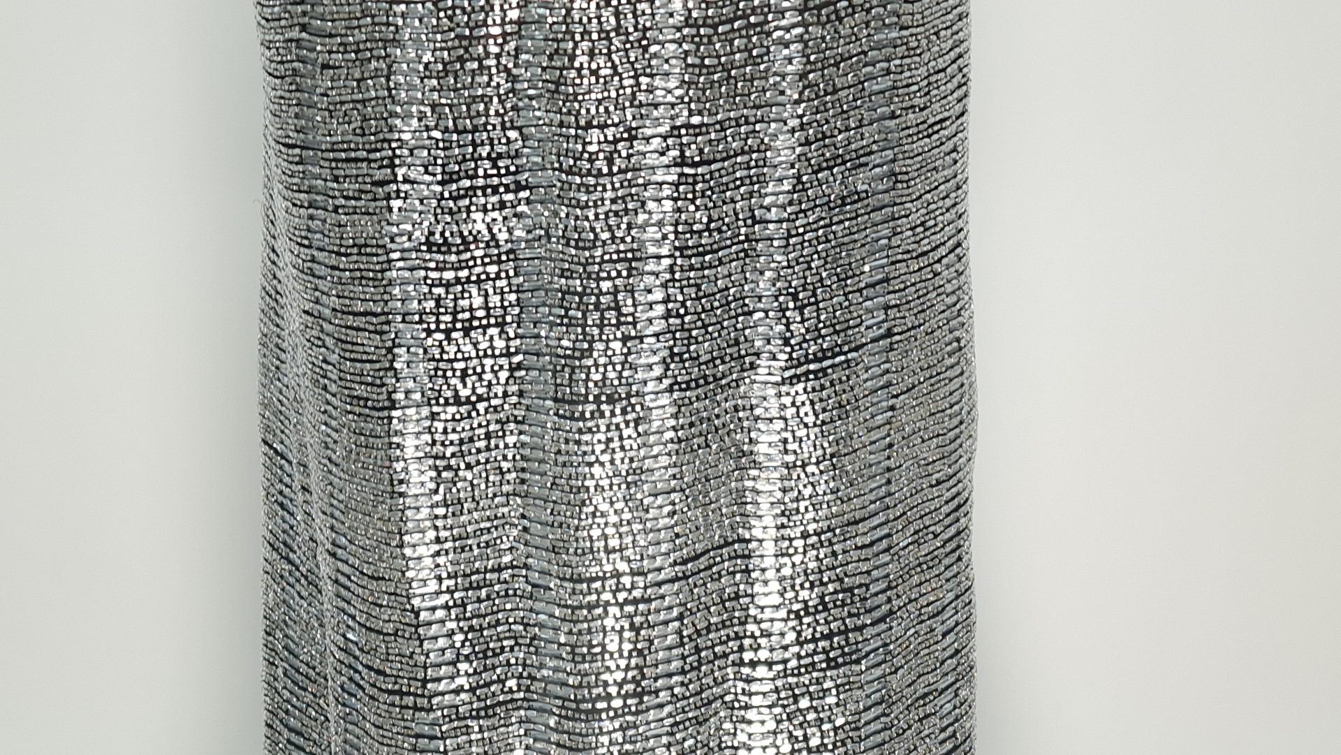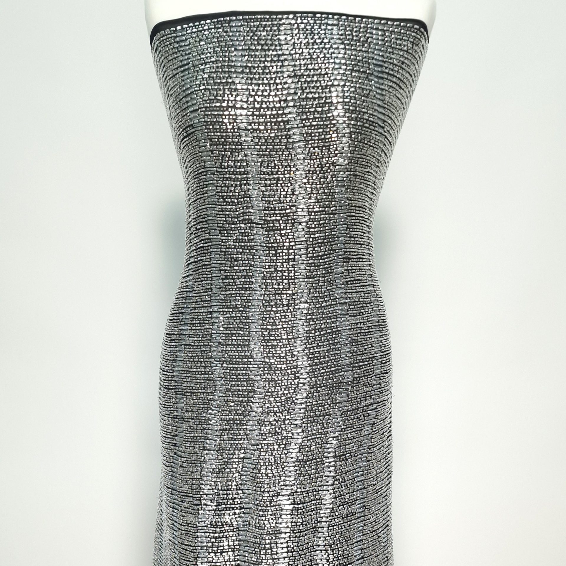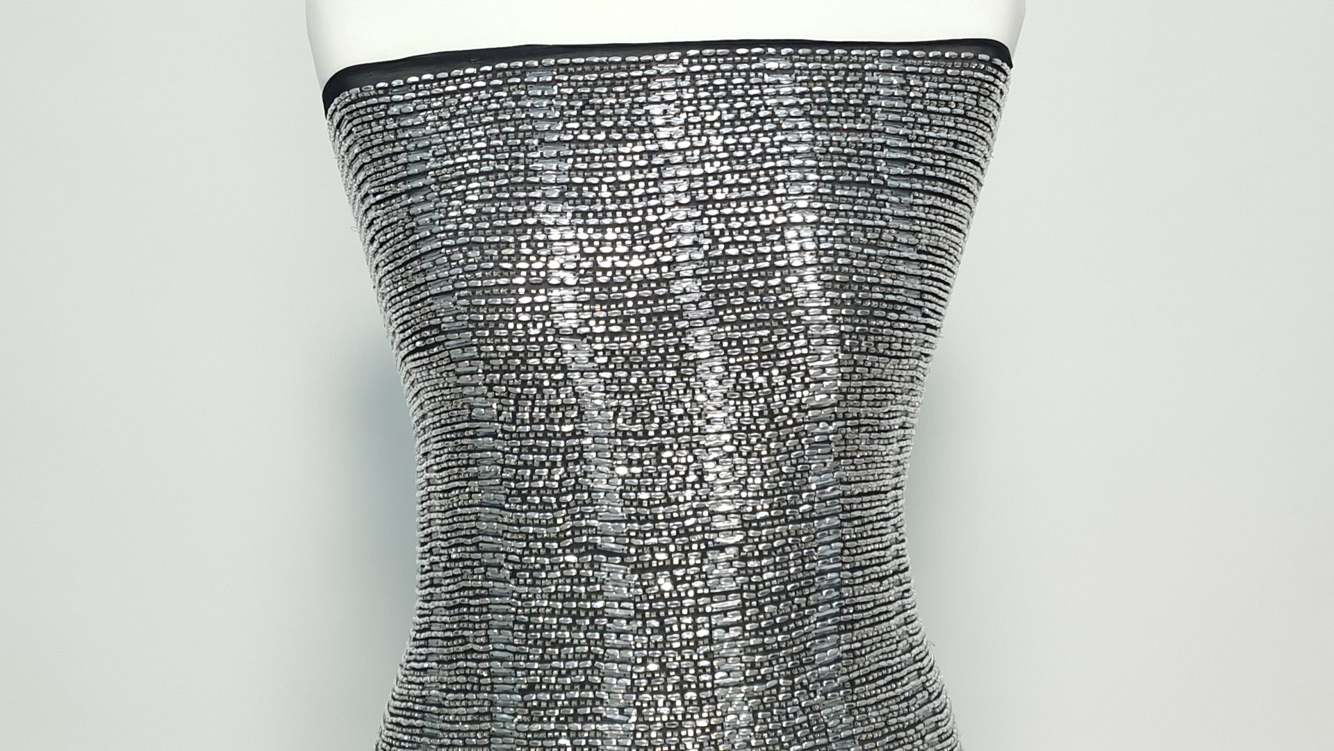 Broderia este accesorizata manual cu margelute argintii de diferite dimensiuni cusute pe baza din voal Georgette negru, din vascoza, usor elastic.