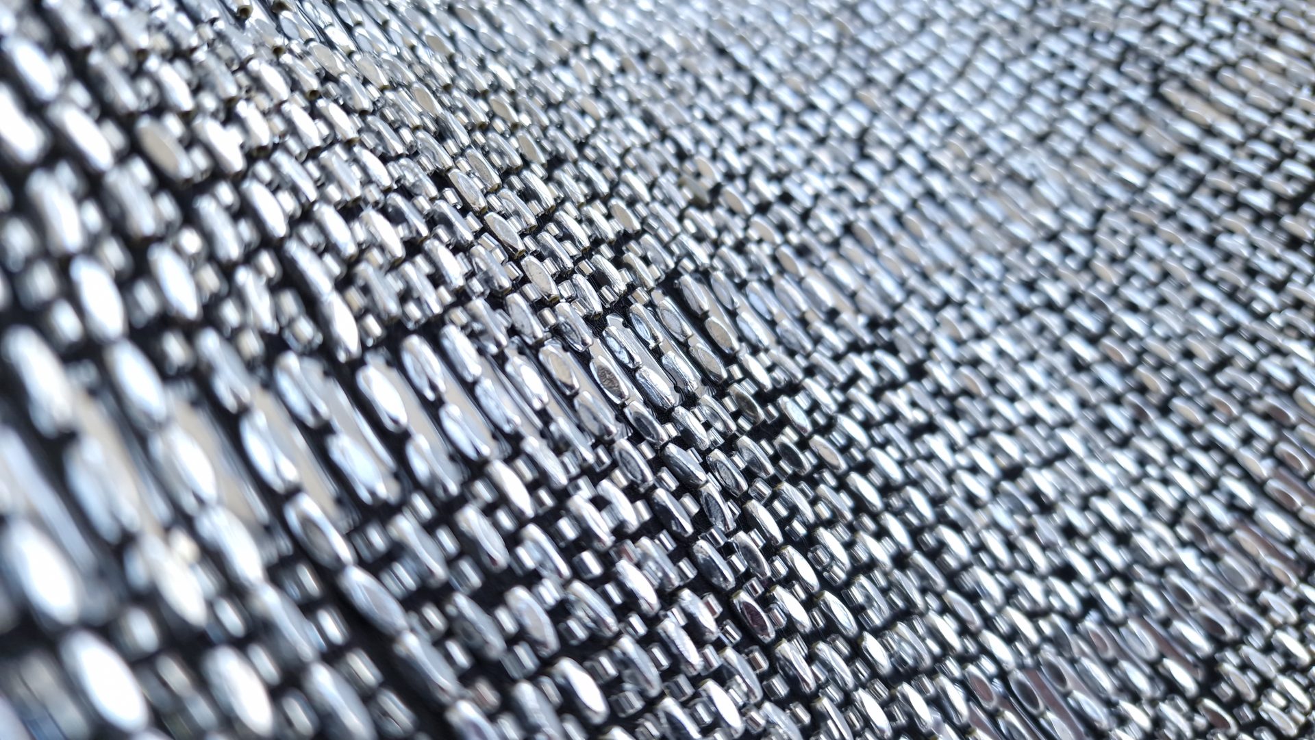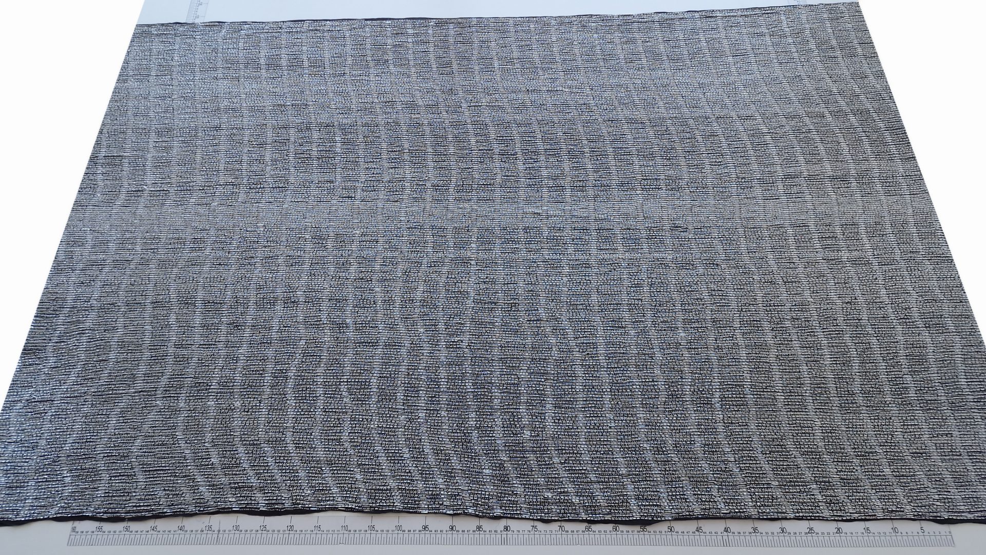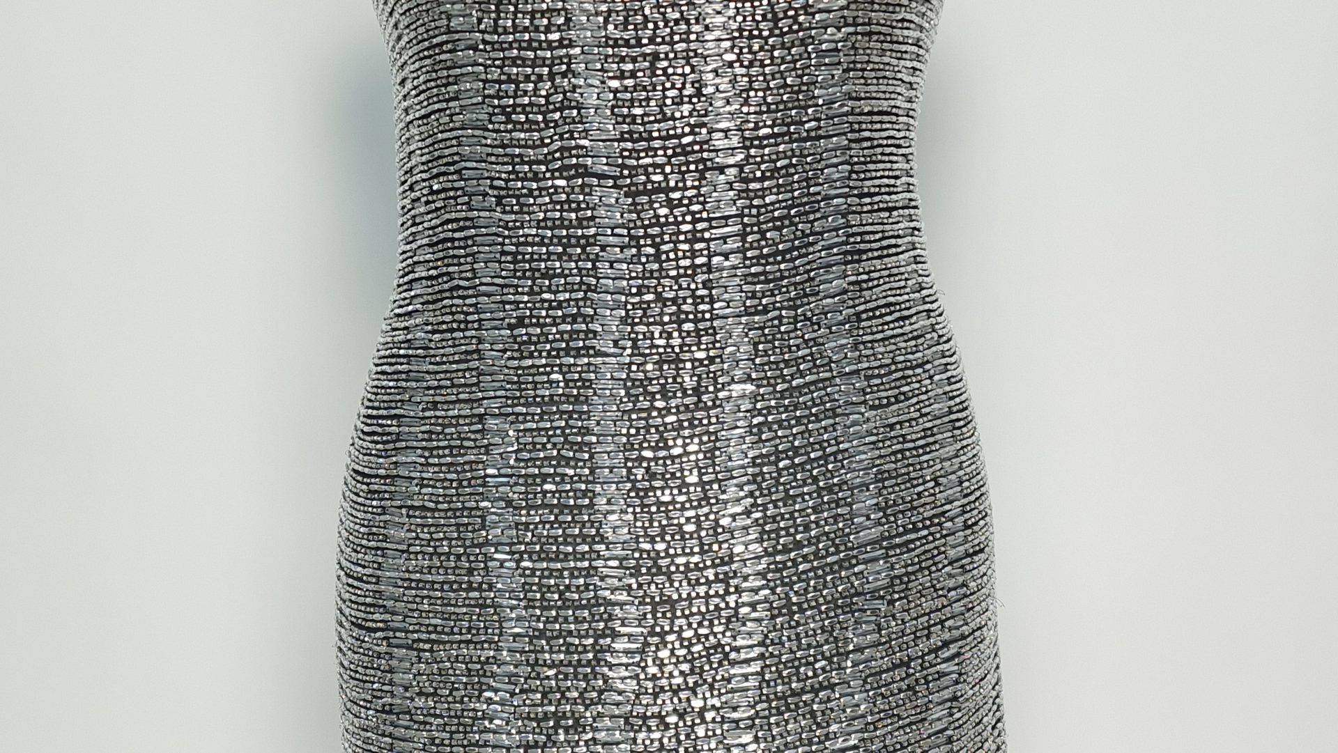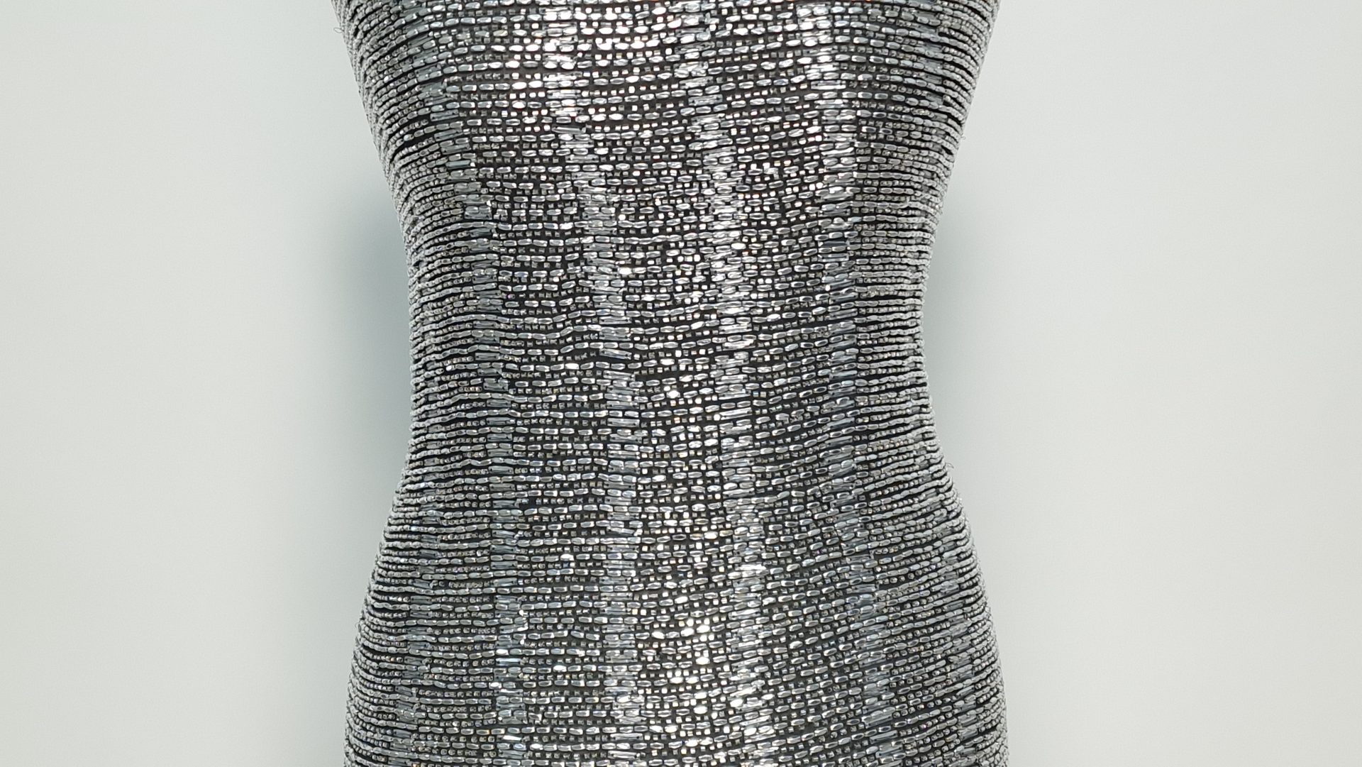 Broderia este accesorizata manual cu margelute argintii de diferite dimensiuni cusute pe baza din voal Georgette negru, din vascoza, usor elastic.