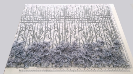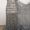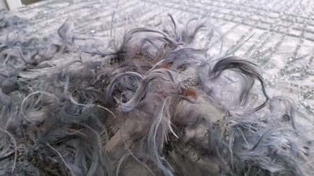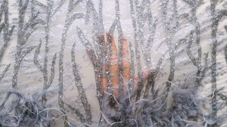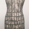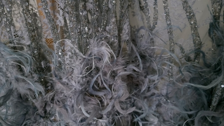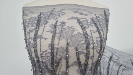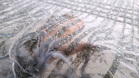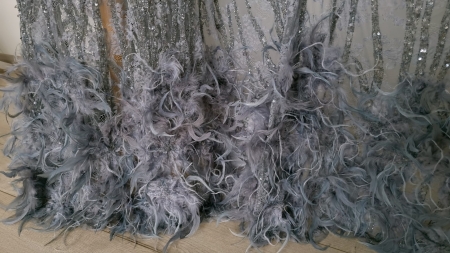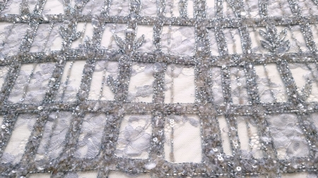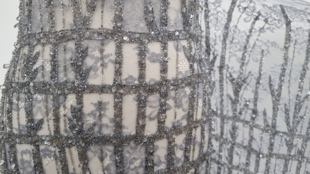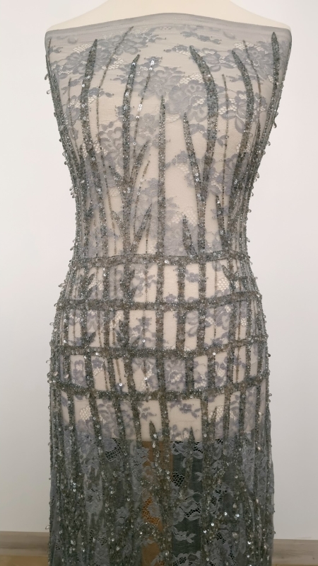Broderia este formata din fulgi naturali, micropaiete si margele gri, cusute individual pe dantela in acelasi ton cu broderia. Aceasta tesatura poate fi usor decupabila, fara ca modelul sa fie afectat, si reaplicata intr-o maniera personala pe tinuta dorita. Designul spectaculos este dat de modul in care sunt dispuse accesoriile reliefate pe intreaga suprafata a tesaturii.
