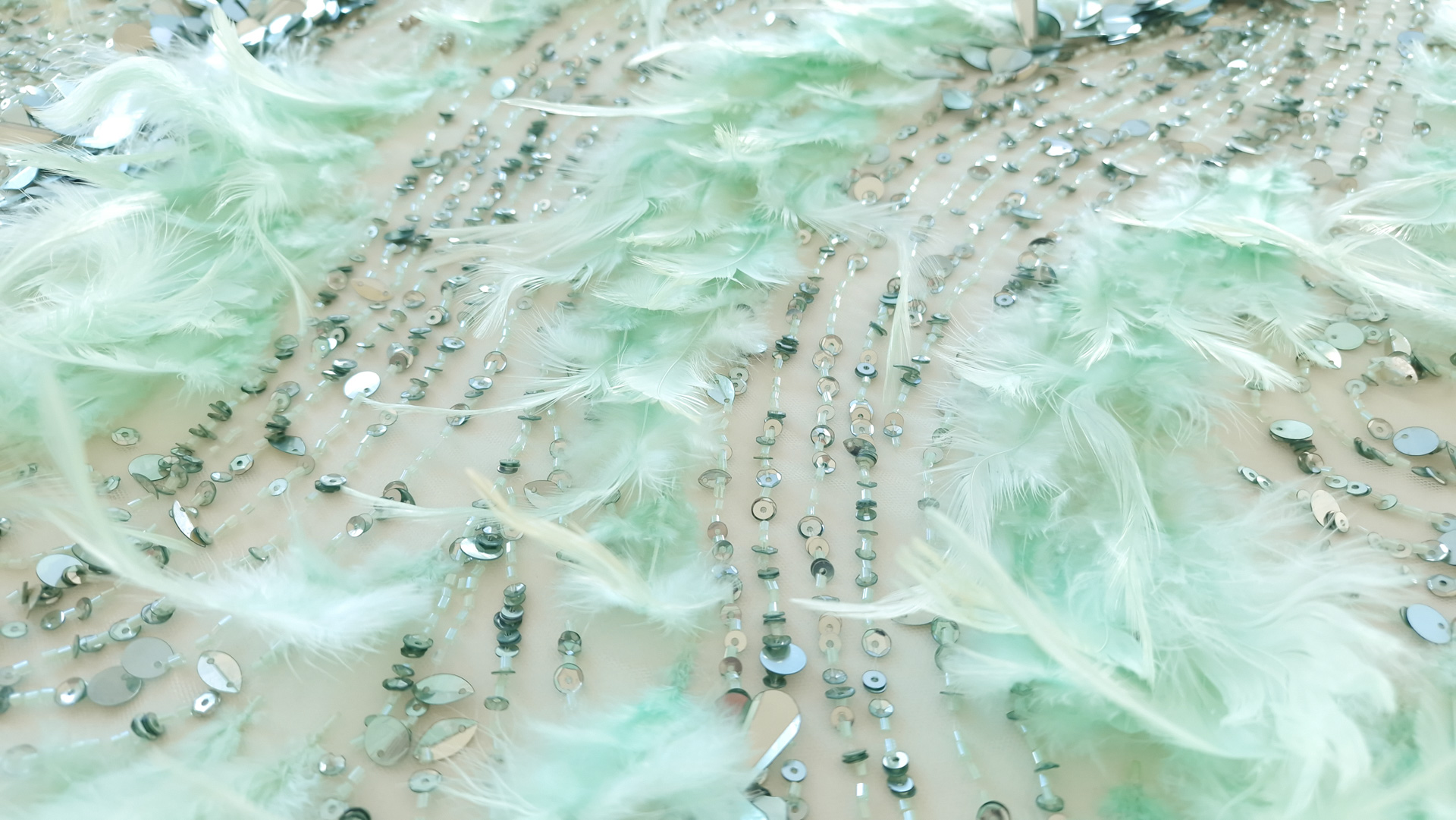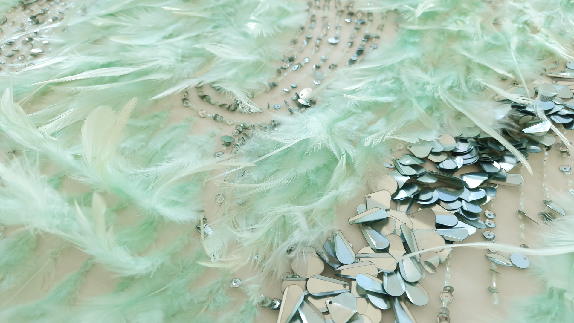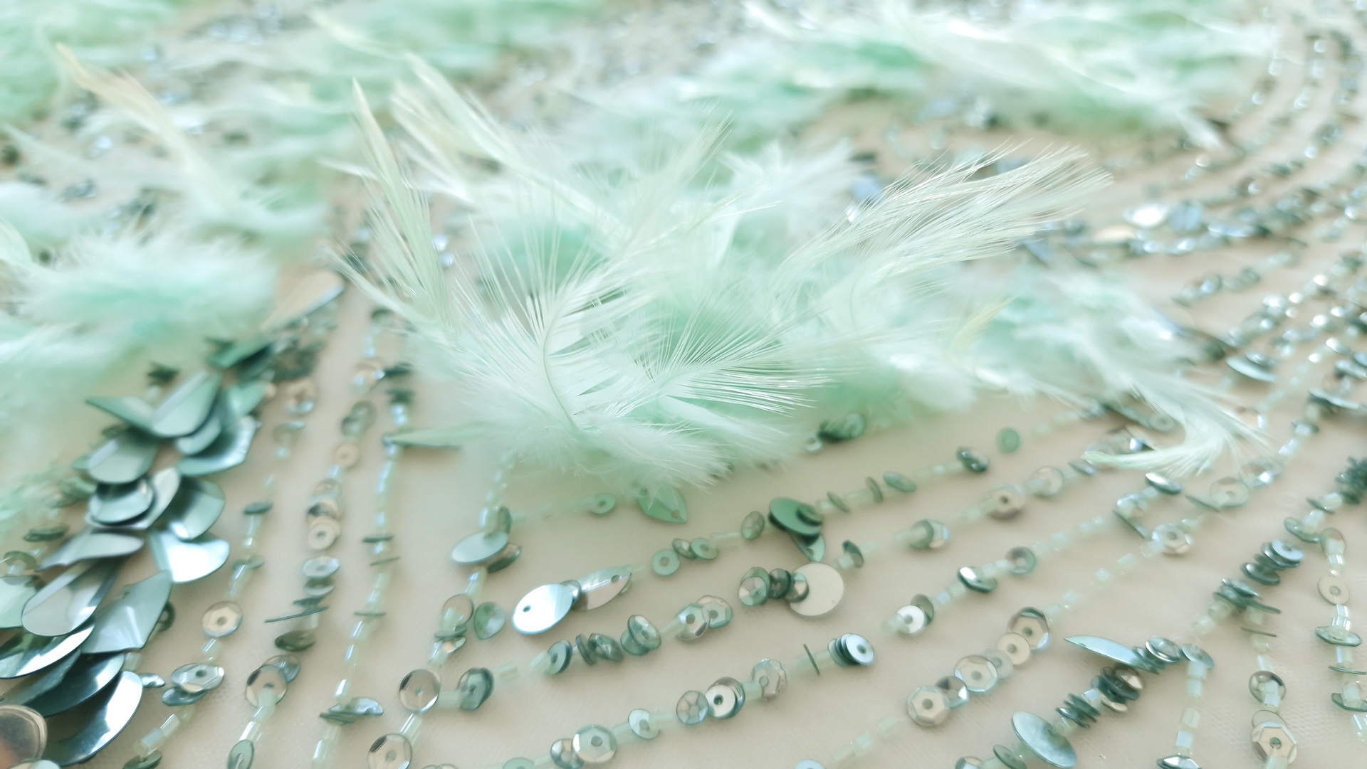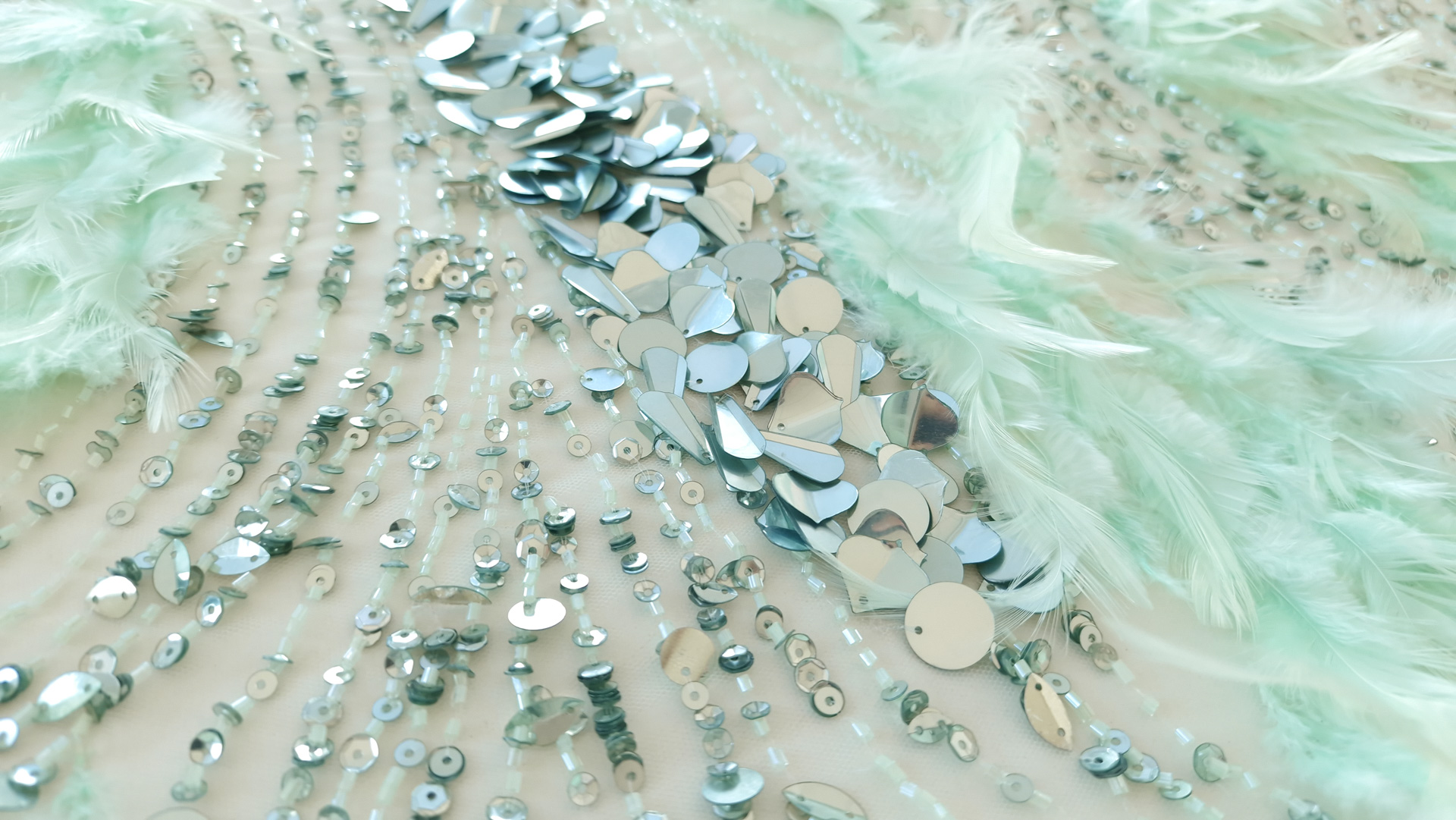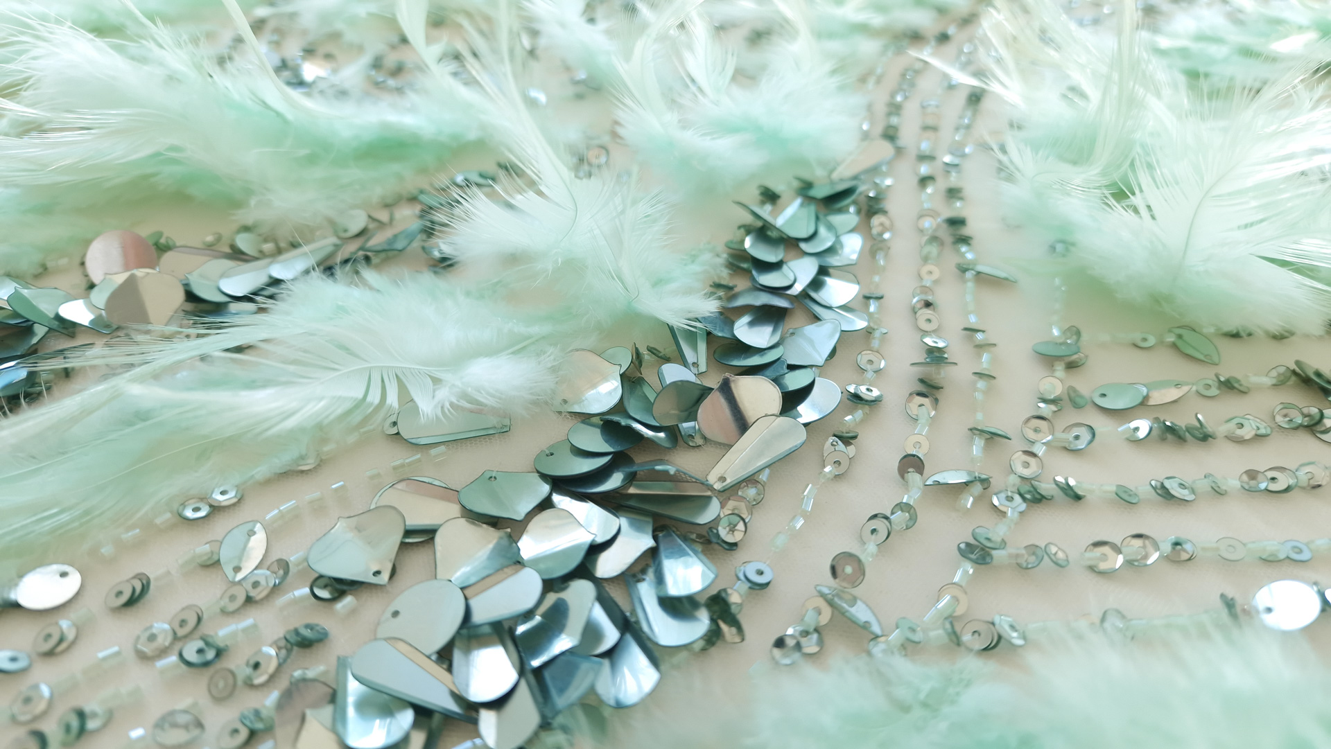 Broderie couture mint lucrata manual , cu paiete, mărgele, micropaiete și fulgi naturali, toate cusute manual pe tulle usor elastic în aceeași nuanță. Fiecare detaliu al broderiei transformă orice ținută într-o operă de artă autentică. Paietele strălucesc delicat, captând lumina și creând reflexii care adaugă eleganță. Mărgelele, atent selectate și plasate, aduc o notă de rafinament și complexitate, în timp ce micropaietele adaugă o textură subtilă și sofisticată. Fulgii naturali, cusuti pe tulle-ul ușor elastic, aduc grație, conferind broderiei un aer eteric și de poveste. Această piesă emană feminitate și rafinament, fiind perfectă pentru ocazii speciale unde se dorește un look deosebit și memorabil.