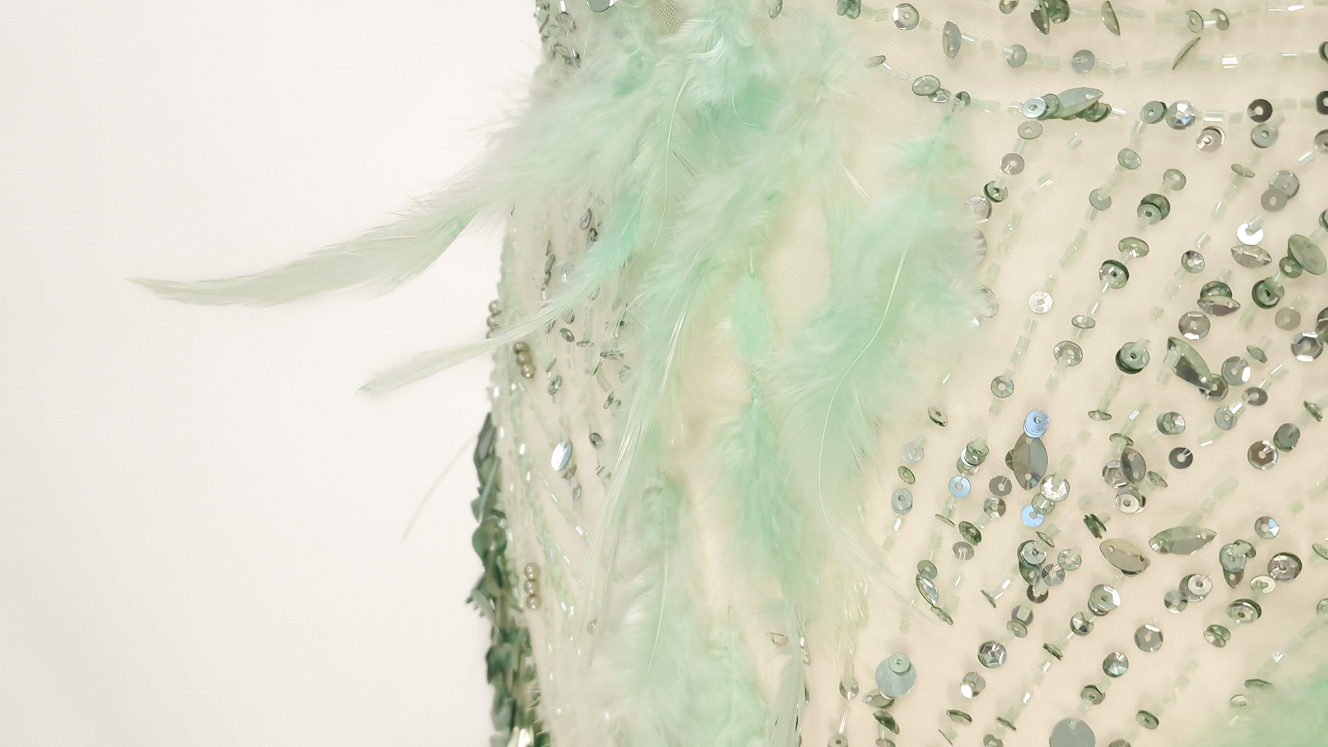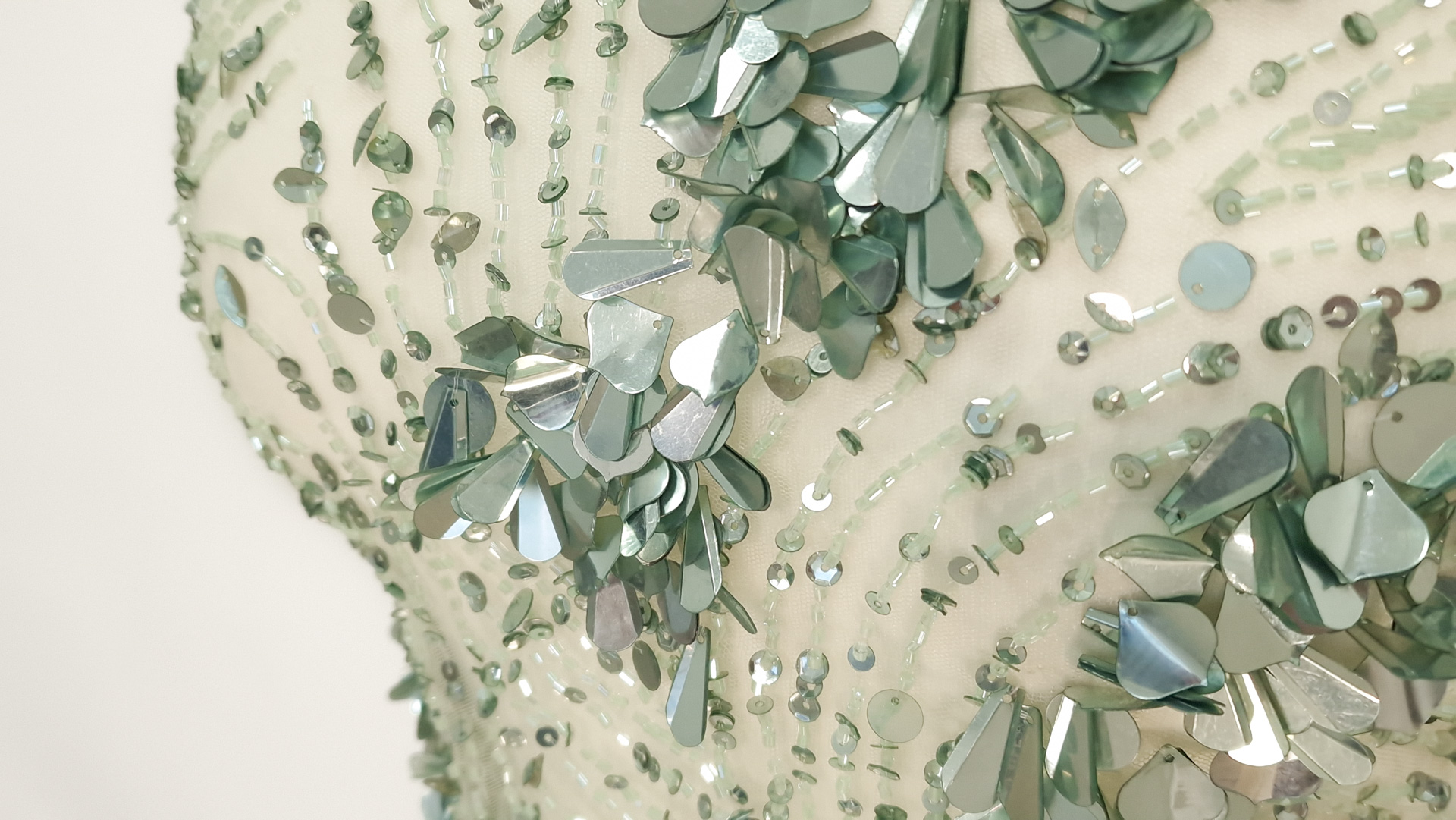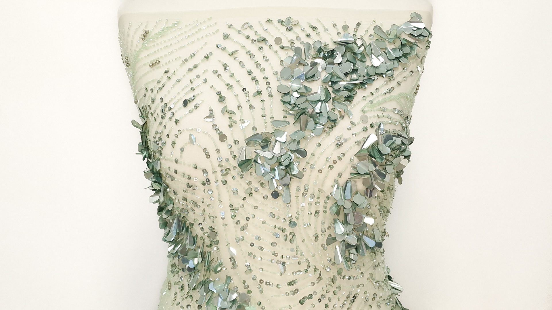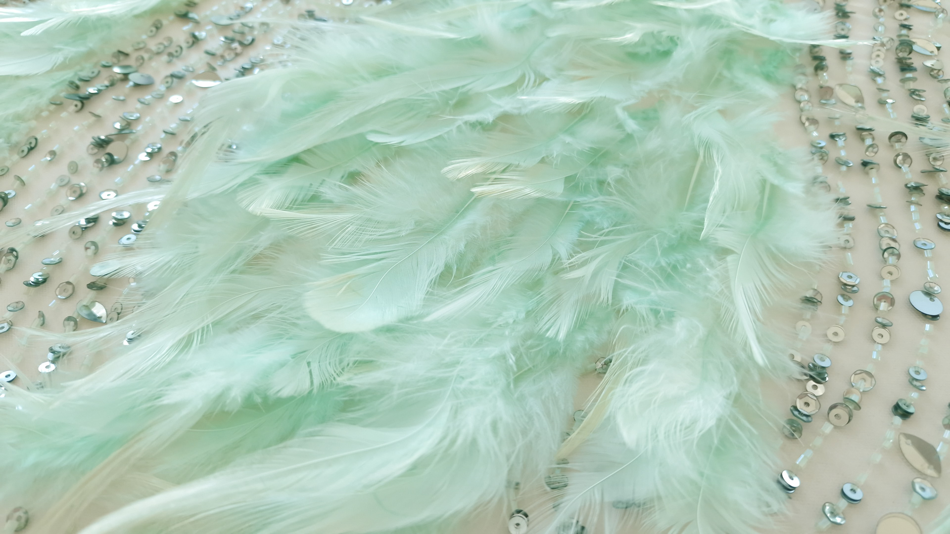 Broderie couture mint lucrata manual , cu paiete, mărgele, micropaiete și fulgi naturali, toate cusute manual pe tulle usor elastic în aceeași nuanță. Fiecare detaliu al broderiei transformă orice ținută într-o operă de artă autentică. Paietele strălucesc delicat, captând lumina și creând reflexii care adaugă eleganță. Mărgelele, atent selectate și plasate, aduc o notă de rafinament și complexitate, în timp ce micropaietele adaugă o textură subtilă și sofisticată. Fulgii naturali, cusuti pe tulle-ul ușor elastic, aduc grație, conferind broderiei un aer eteric și de poveste. Această piesă emană feminitate și rafinament, fiind perfectă pentru ocazii speciale unde se dorește un look deosebit și memorabil.