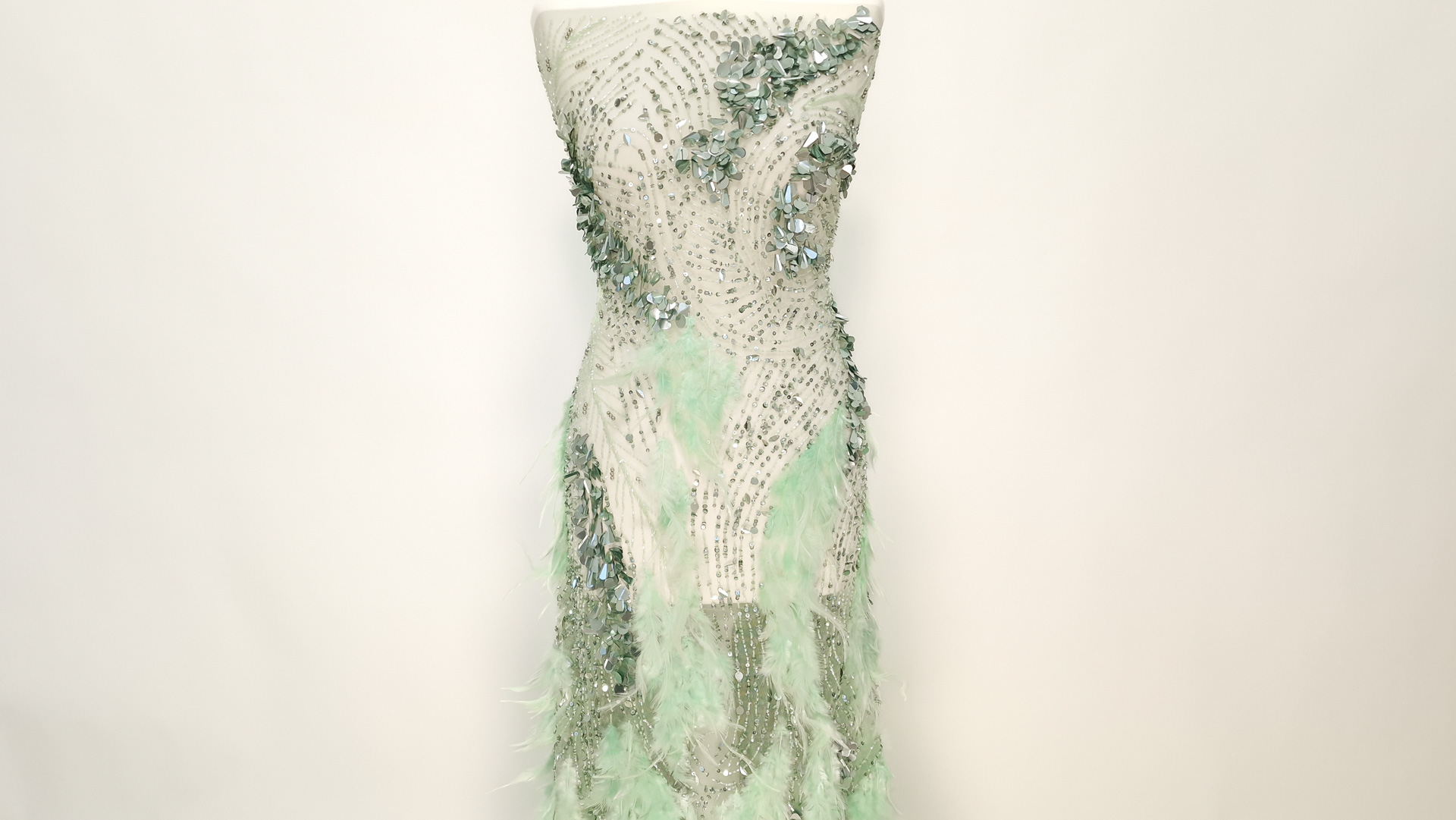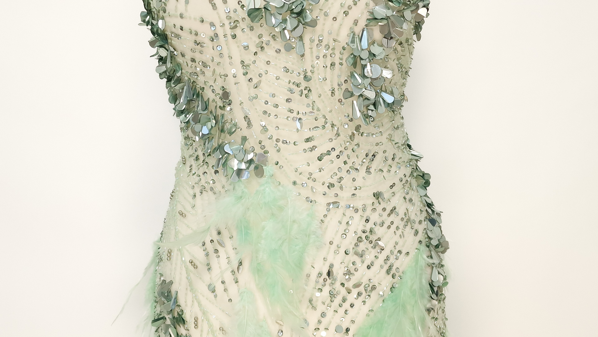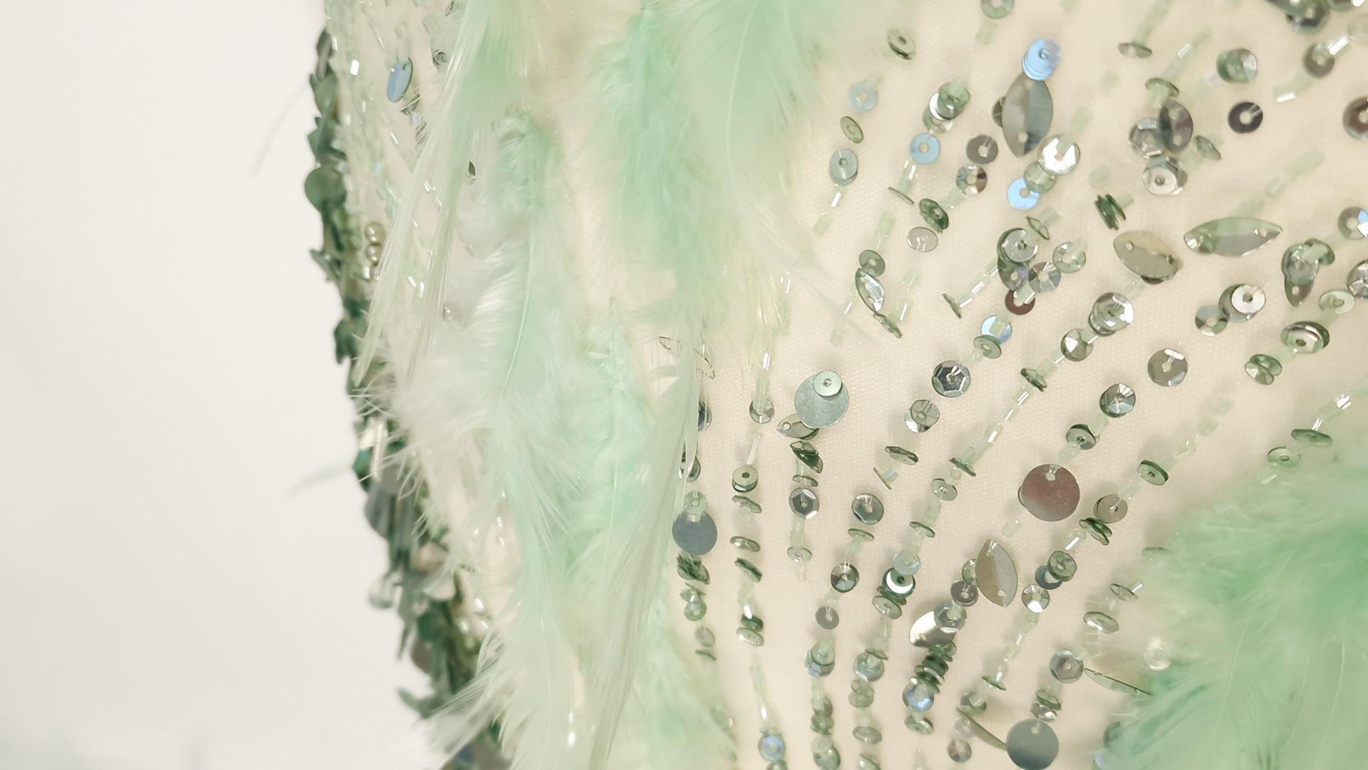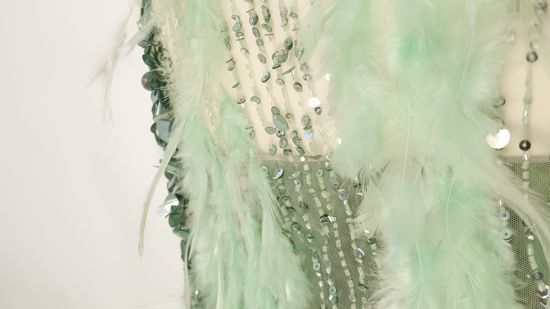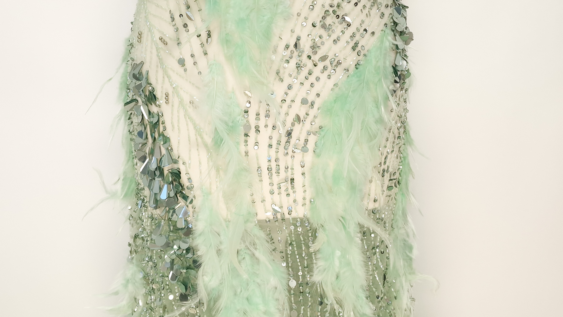 Broderie couture mint lucrata manual , cu paiete, mărgele, micropaiete și fulgi naturali, toate cusute manual pe tulle usor elastic în aceeași nuanță. Fiecare detaliu al broderiei transformă orice ținută într-o operă de artă autentică. Paietele strălucesc delicat, captând lumina și creând reflexii care adaugă eleganță. Mărgelele, atent selectate și plasate, aduc o notă de rafinament și complexitate, în timp ce micropaietele adaugă o textură subtilă și sofisticată. Fulgii naturali, cusuti pe tulle-ul ușor elastic, aduc grație, conferind broderiei un aer eteric și de poveste. Această piesă emană feminitate și rafinament, fiind perfectă pentru ocazii speciale unde se dorește un look deosebit și memorabil.