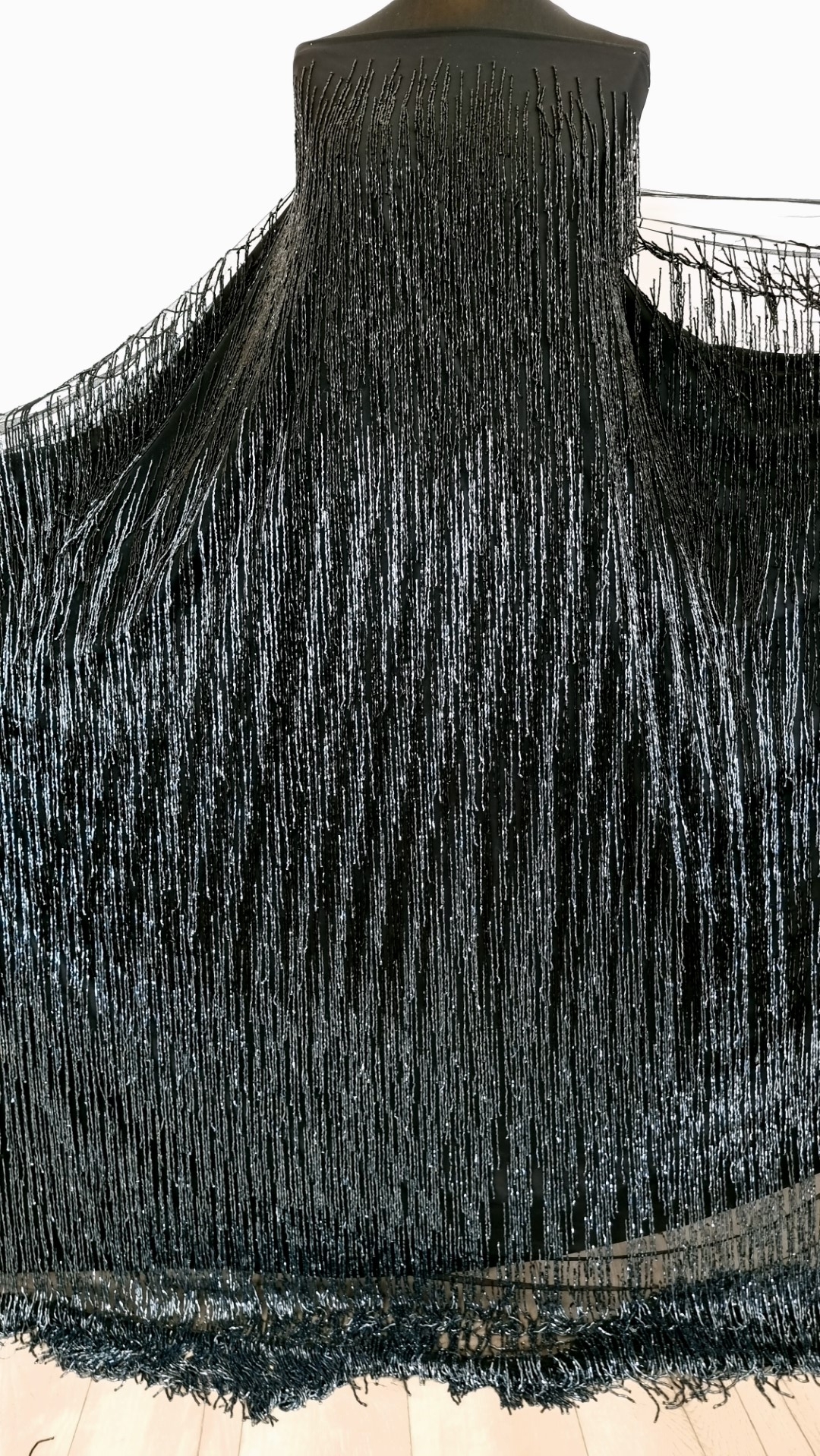 Franjurii din margele tubulare negre si argintii sunt cusuti individual pe suport de tulle negru, putin elastic.
