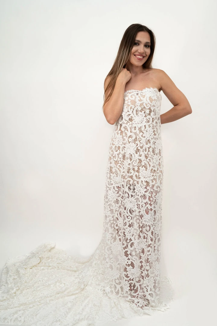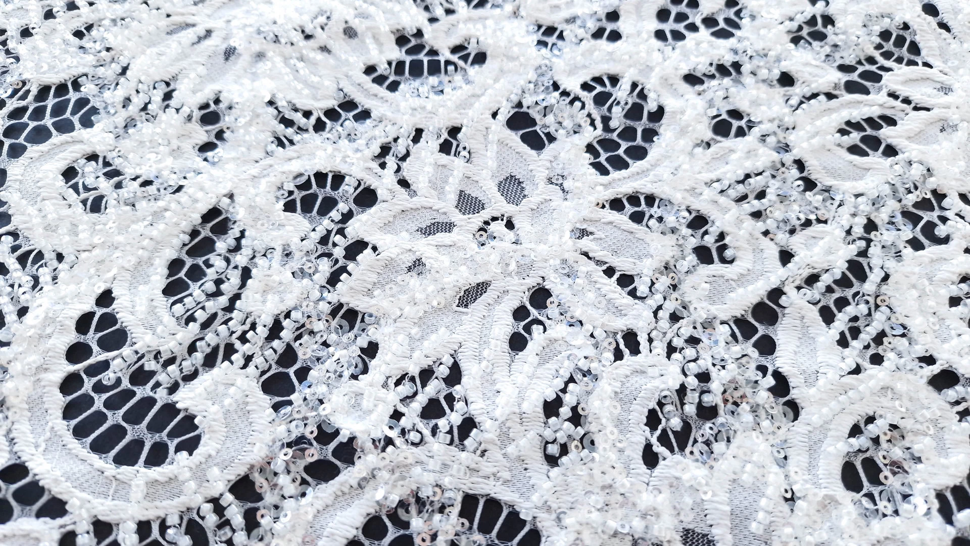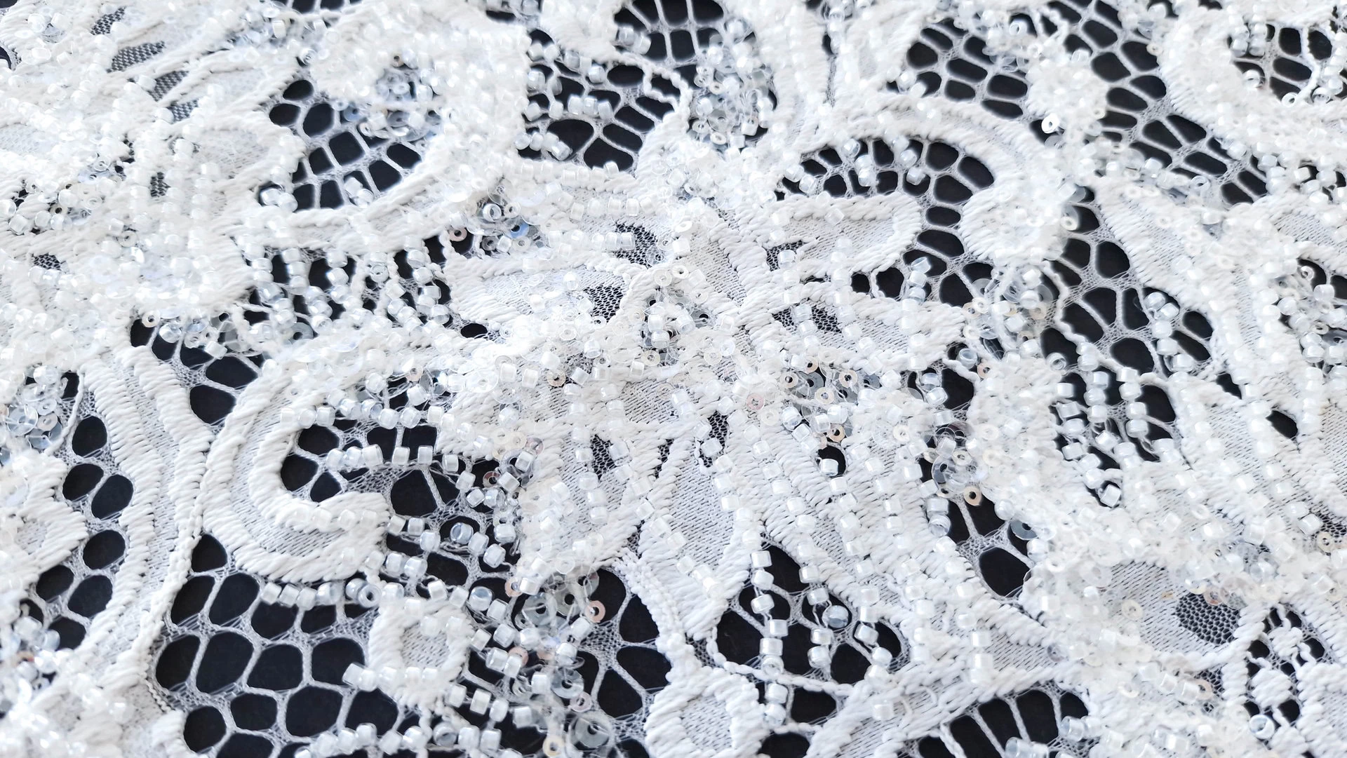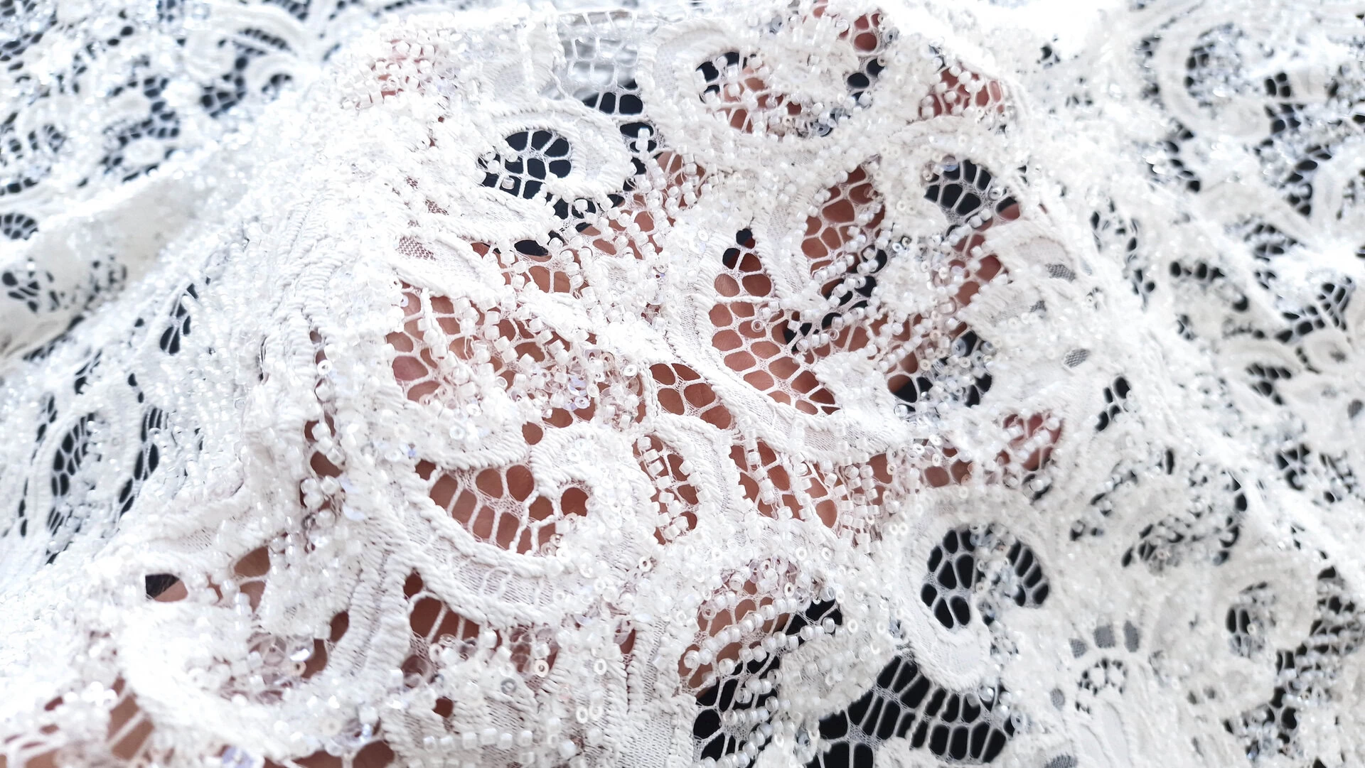 Broderie ivory usor accesorizata Aniela , cu bordură dublă, mărgele și micropaiete delicate, este ideală pentru rochii de mireasă memorabile. Micropaietele adaugă o strălucire subtilă, perfectă pentru a capta lumina în momente speciale. Mărgelele atent plasate conferă eleganță, iar designul său feminin o face ideală pentru rochii de mireasă, dar și fuste sau topuri elegante. Se combină excelent cu țesături precum mătase naturală, tafta, mikado sau crep