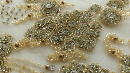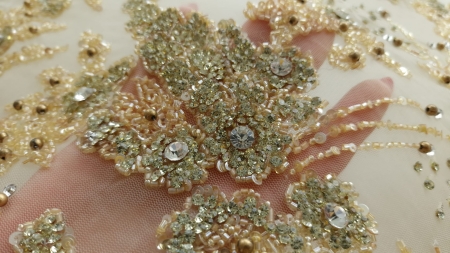 Broderie lucrata manual Alyssa, cu margele si pietre aurii,bej si argintii, de inalta calitate a detaliilor si cu finisaje de exceptie.