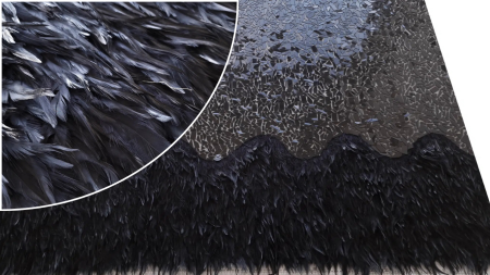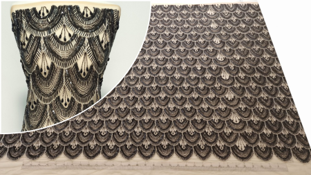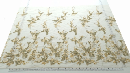 Broderia este formata din pietre si margele, cusute individual pe tulle nude, usor elastic. Aceasta tesatura poate fi usor decupabila, fara ca modelul sa fie afectat, si reaplicata intr-o maniera personala pe tinuta dorita. Designul spectaculos este dat de modul in care sunt dispuse accesoriile reliefate pe intreaga suprafata a tesaturii.