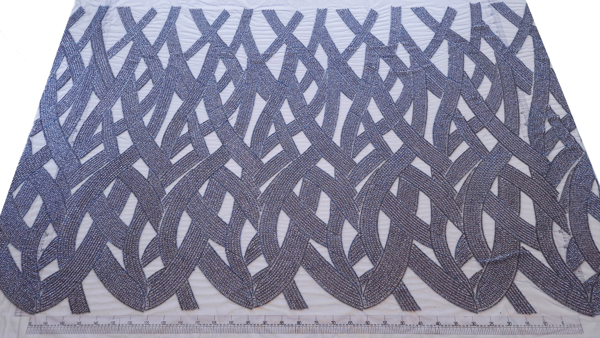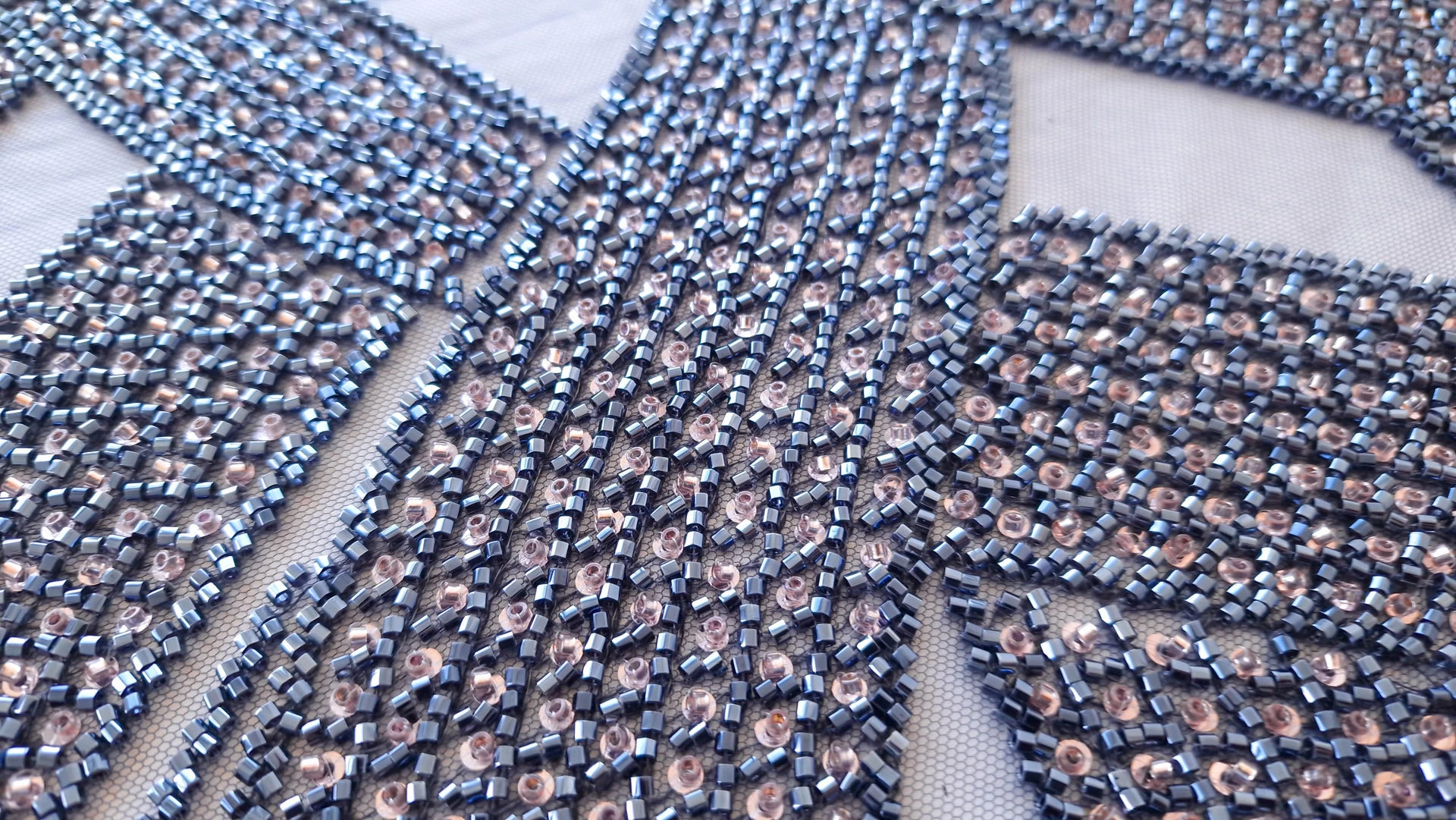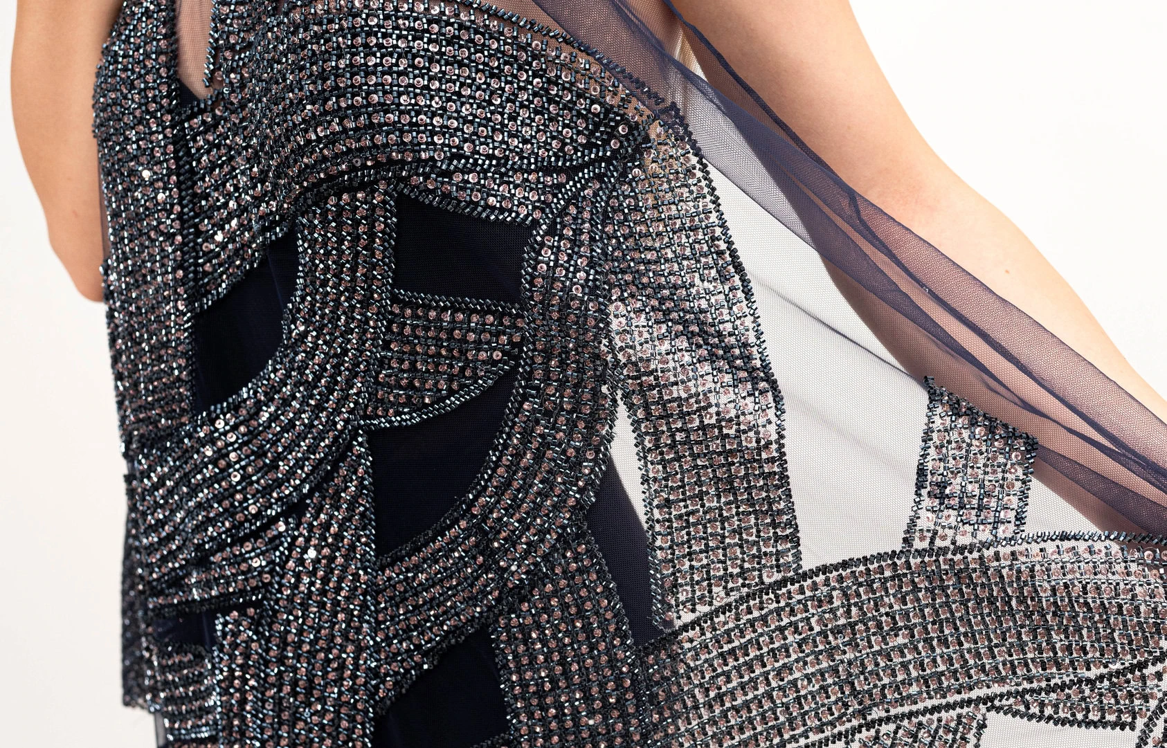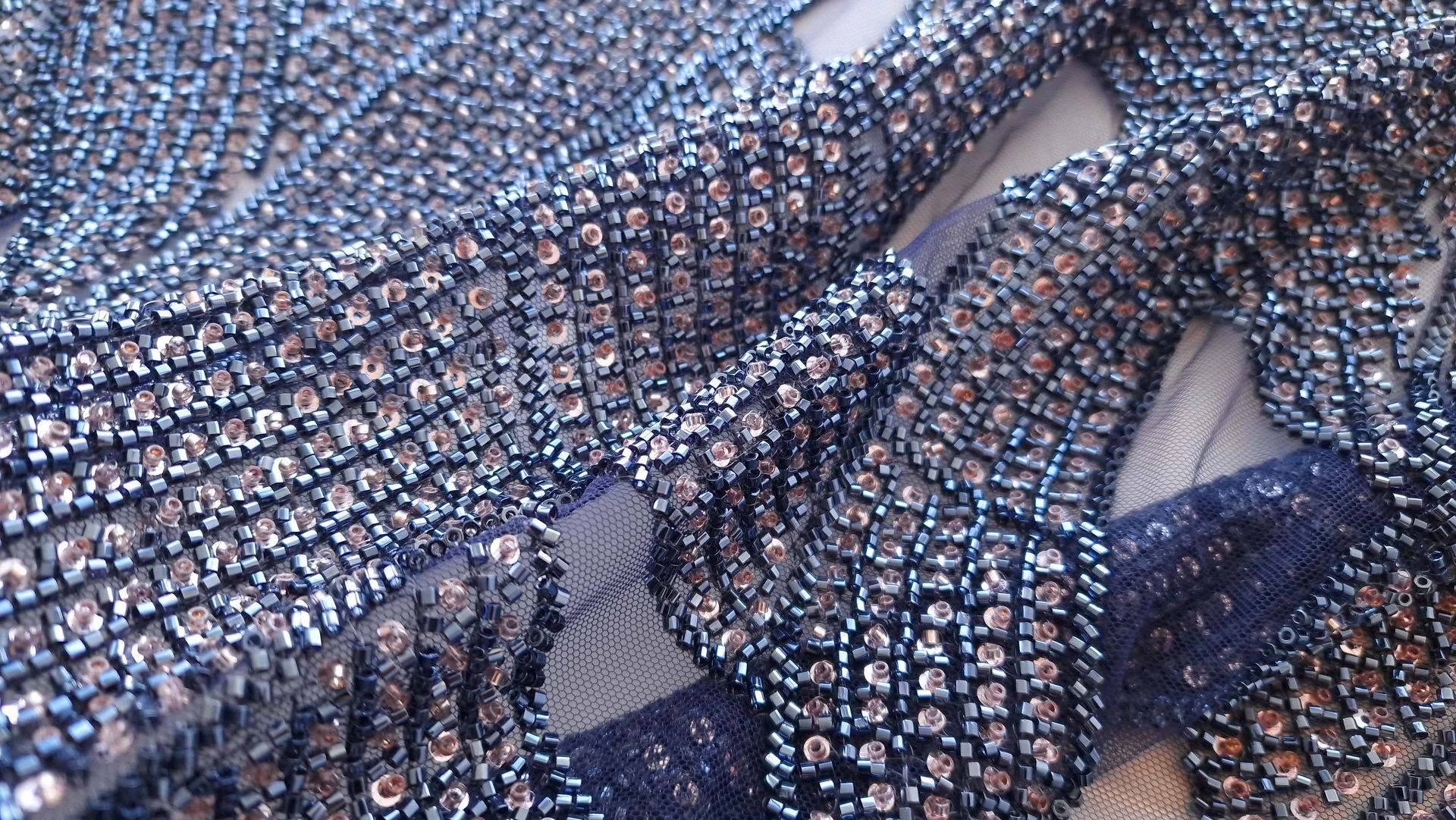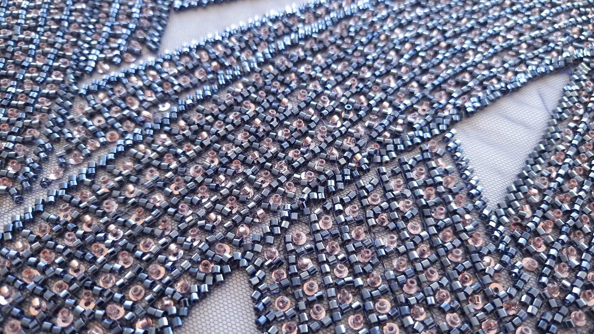 Broderie navy auriu pe tulle bleumarin , decorată cu mărgele si micropaiete navy si aurii cusute pe tulle bleumarin usor elastic. Fiecare detaliu al broderiei transformă orice ținută într-o operă de artă autentică. Microaietele strălucesc delicat, captând lumina și creând reflexii care adaugă eleganță. Mărgelele, atent selectate și plasate, aduc o notă de rafinament și complexitate. Această piesă emană feminitate și rafinament, fiind perfectă pentru ocazii speciale unde se dorește un look deosebit și memorabil.
